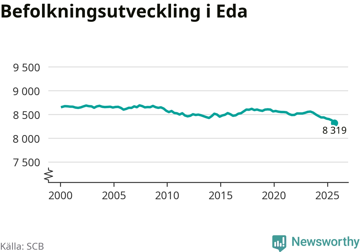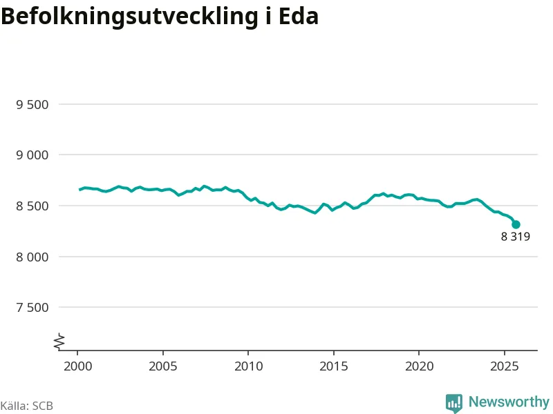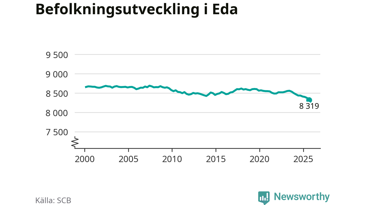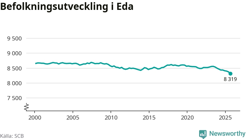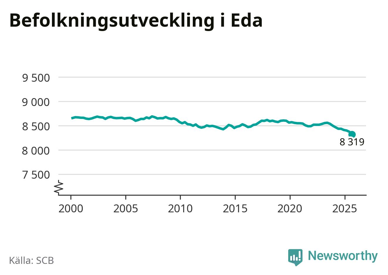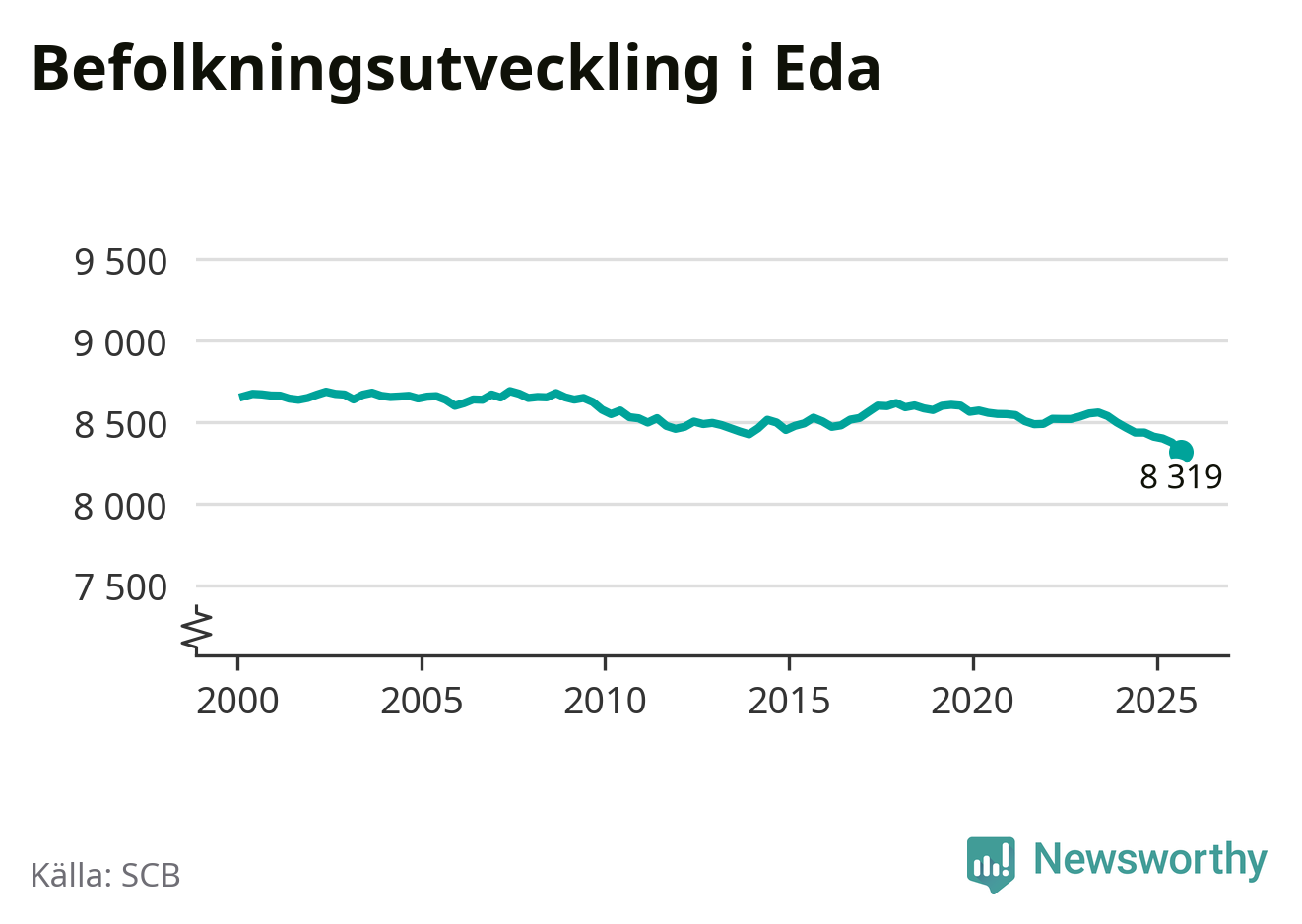 Befolkningen minskade i Eda kommun under det tredje kvartalet 2025. Den 30 september bodde enligt SCB:s senaste siffror 8 319 personer i kommunen, vilket är 57 färre än i slutet av andra kvartalet. Minskningen är den största i Värmland procentuellt sett.