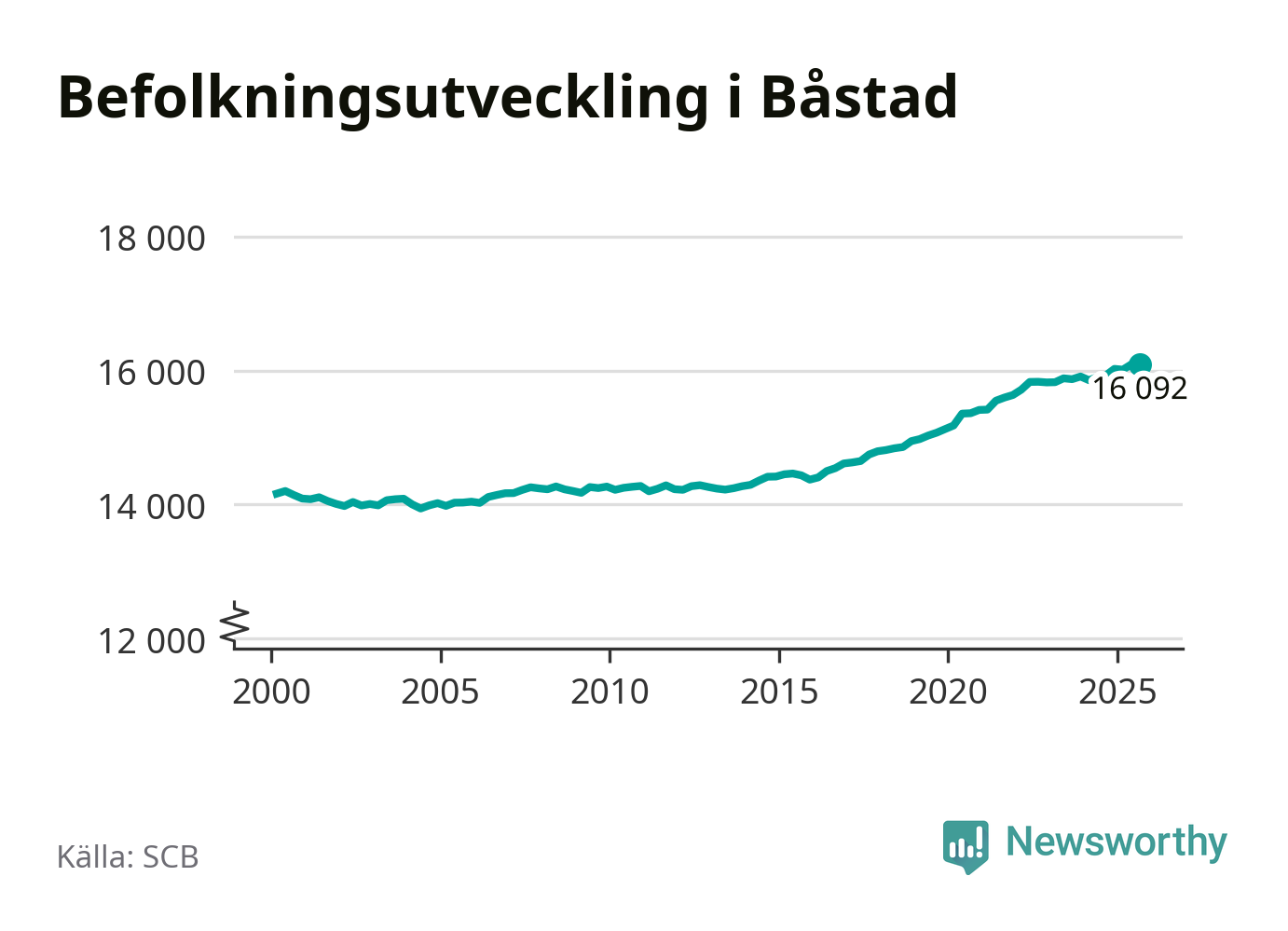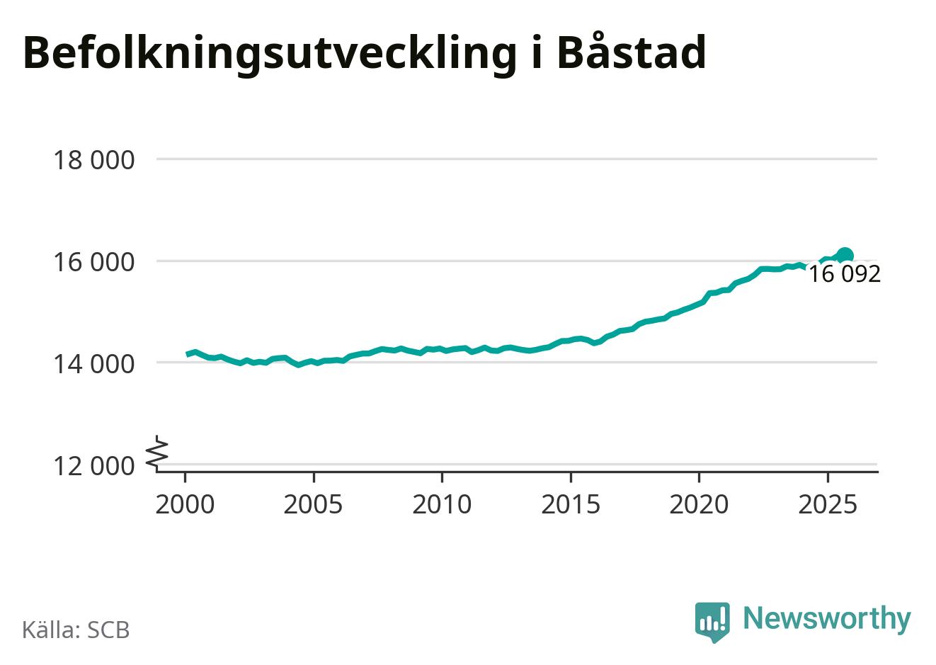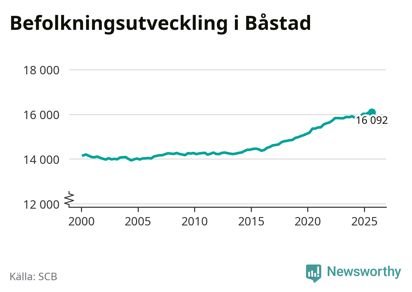 I slutet av tredje kvartalet 2025 bodde 16 092 personer i Båstads kommun, enligt SCB:s senaste siffror. Det är ungefär 160 personer fler än vid samma tidpunkt förra året.