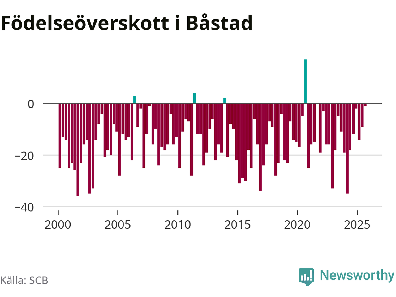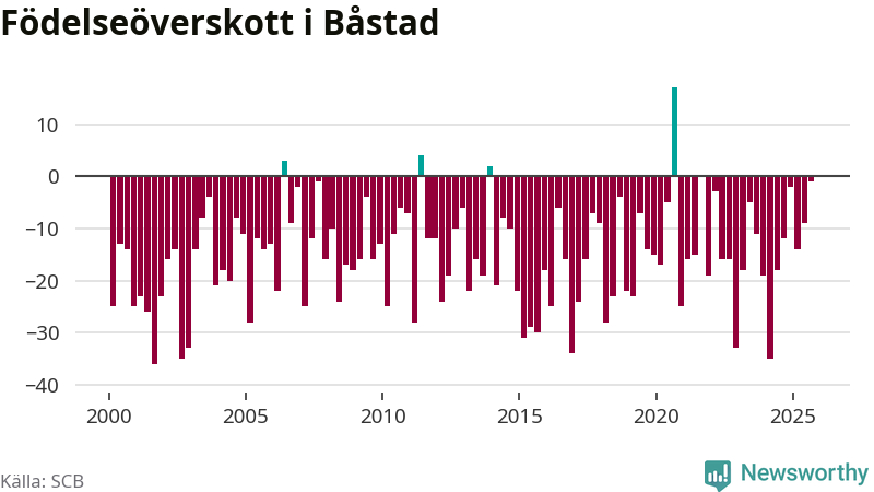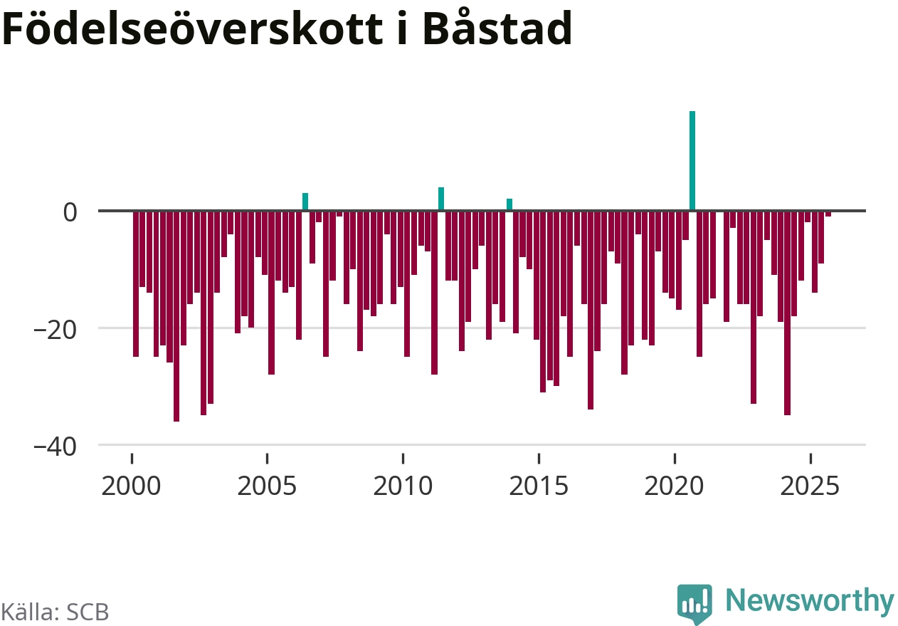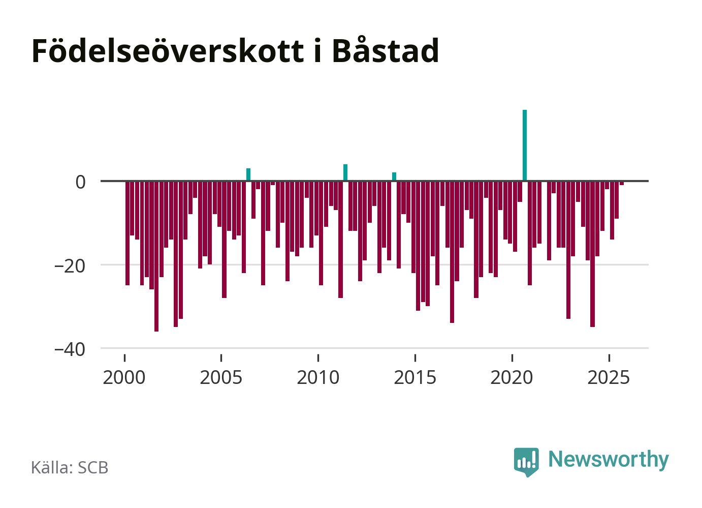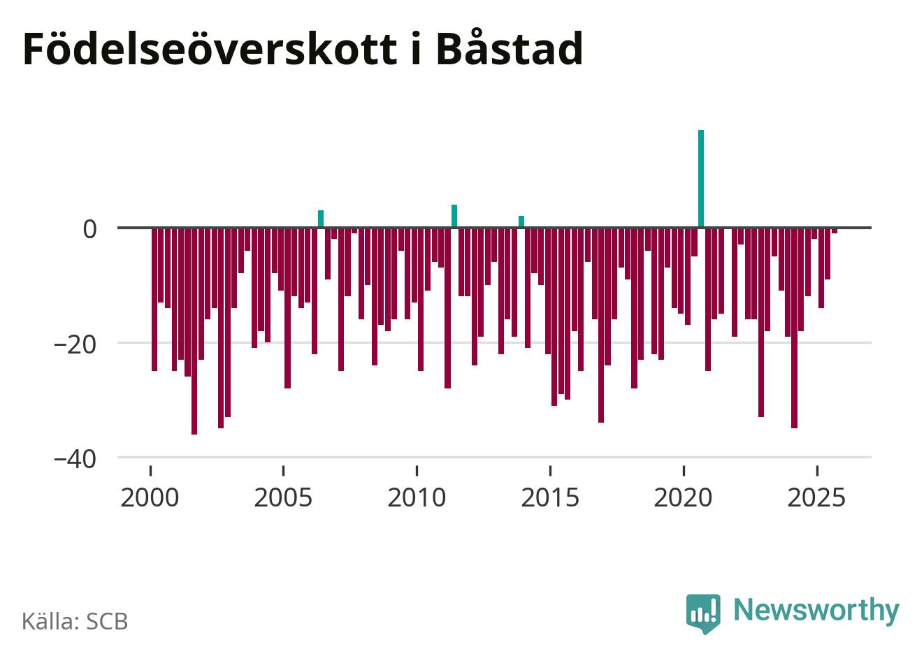 Enligt SCB:s siffror föddes 34 barn i Båstad under det senaste kvartalet. Samtidigt avled 35 personer. Skillnaden mellan antal födda och döda är så liten att det inte går att säga om det beror på något annat än SCB:s röjandeskydd. Kommunen har nästan alltid haft negativt födelsenetto tidigare.