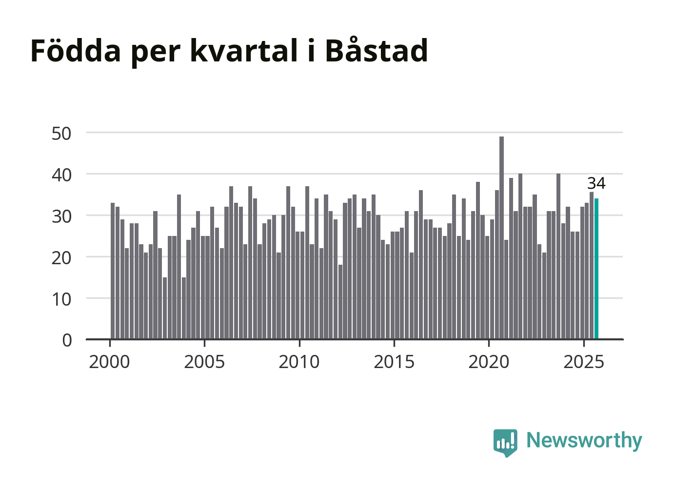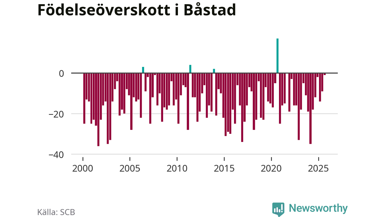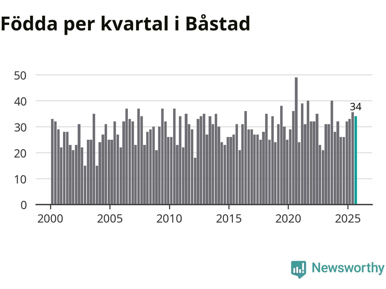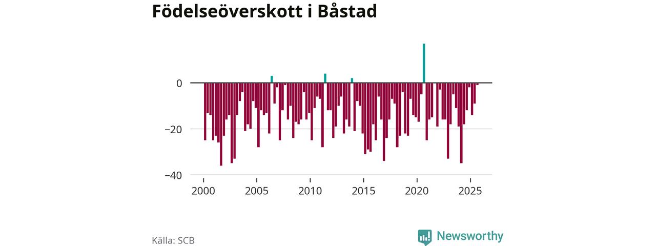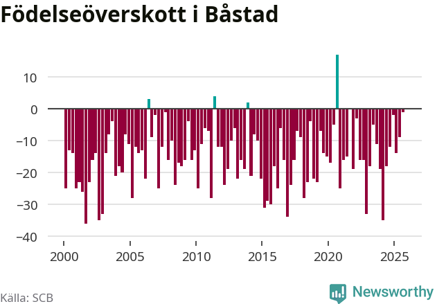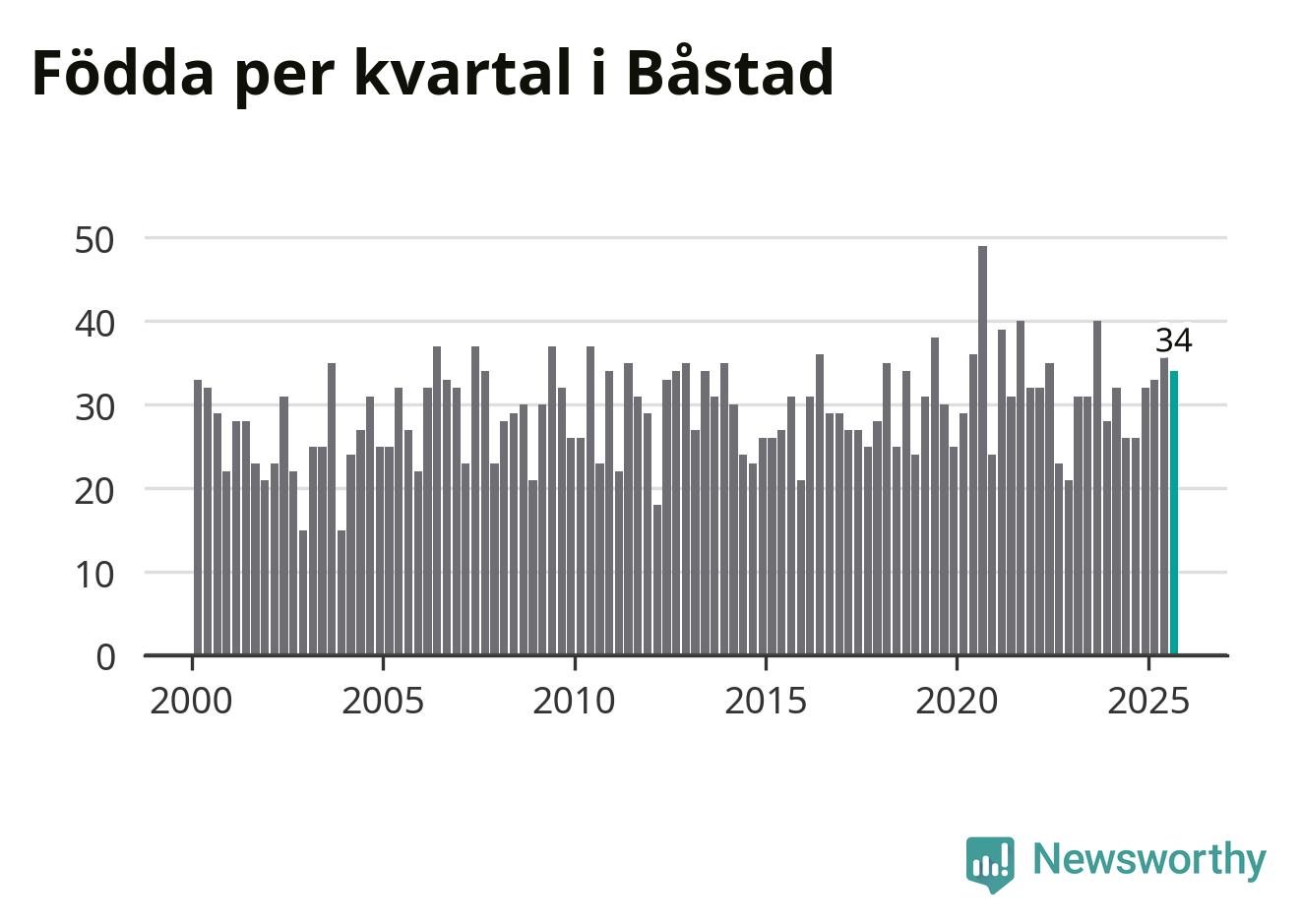 Enligt SCB:s siffror föddes 34 barn i Båstad under det senaste kvartalet. Samtidigt avled 35 personer. Skillnaden mellan antal födda och döda är så liten att det inte går att säga om det beror på något annat än SCB:s röjandeskydd. Kommunen har nästan alltid haft negativt födelsenetto tidigare.
