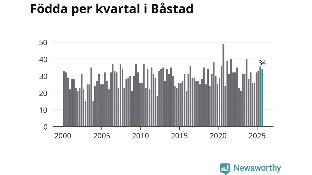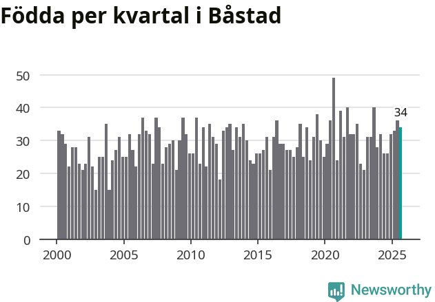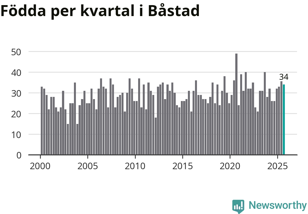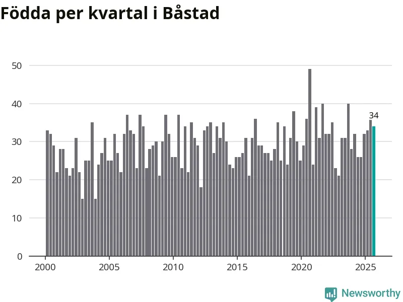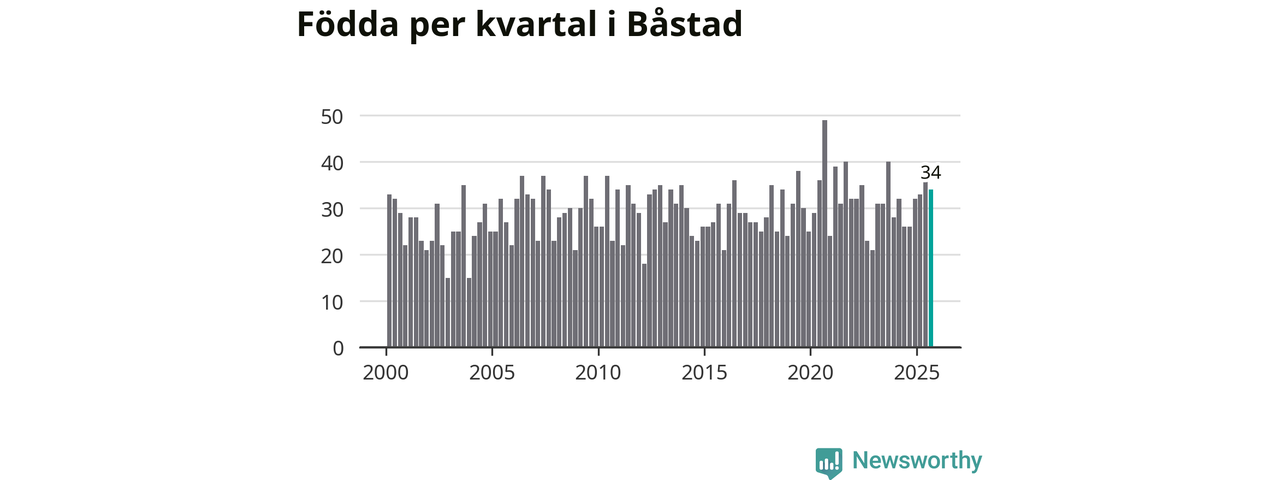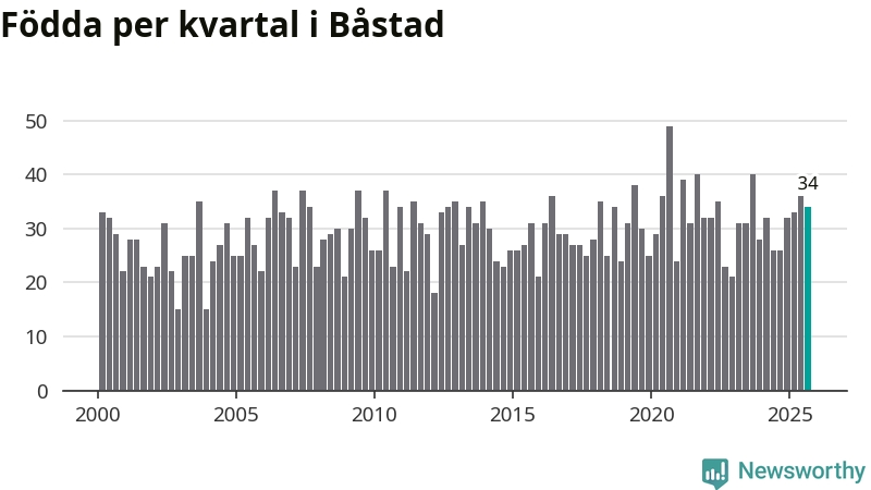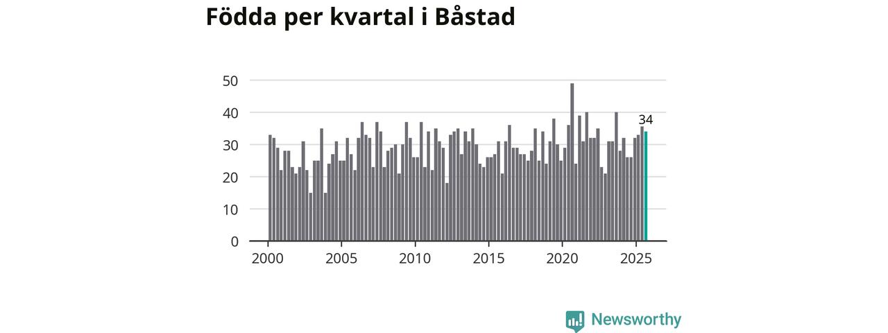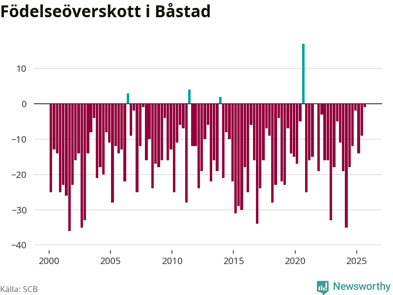 Enligt SCB:s siffror föddes 34 barn i Båstad under det senaste kvartalet. Samtidigt avled 35 personer. Skillnaden mellan antal födda och döda är så liten att det inte går att säga om det beror på något annat än SCB:s röjandeskydd. Kommunen har nästan alltid haft negativt födelsenetto tidigare.