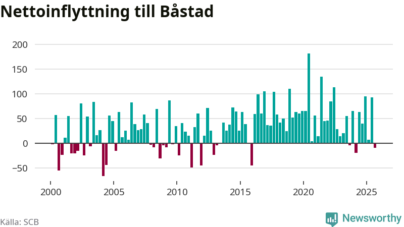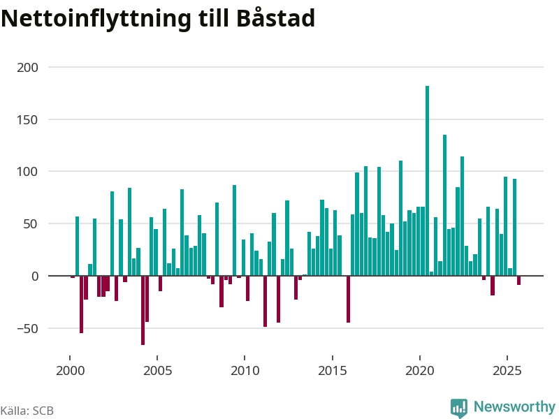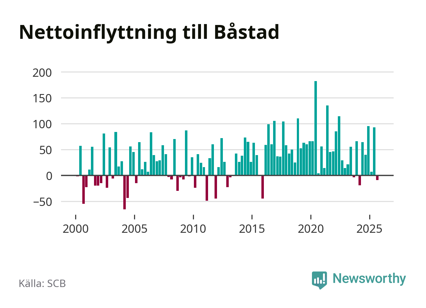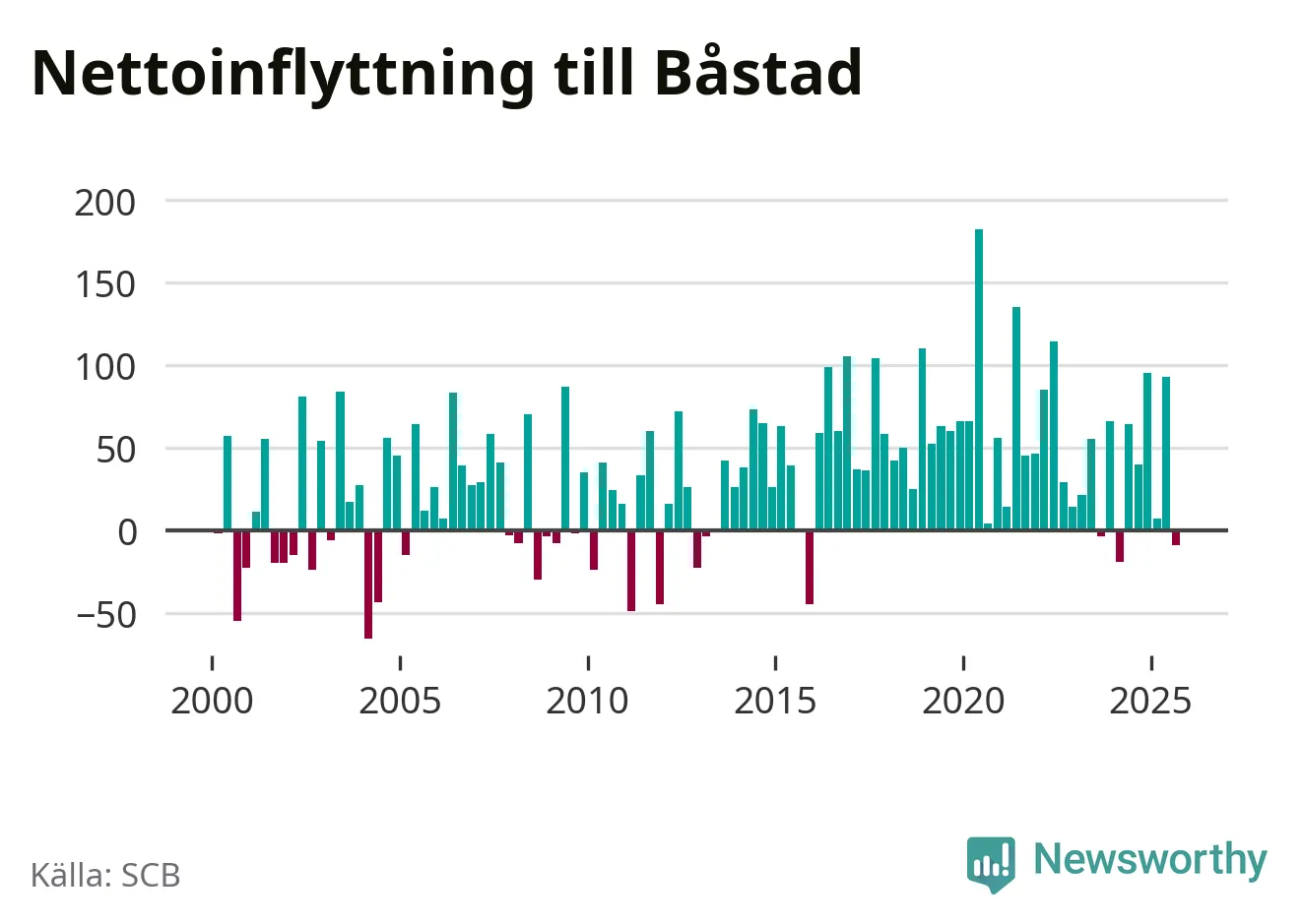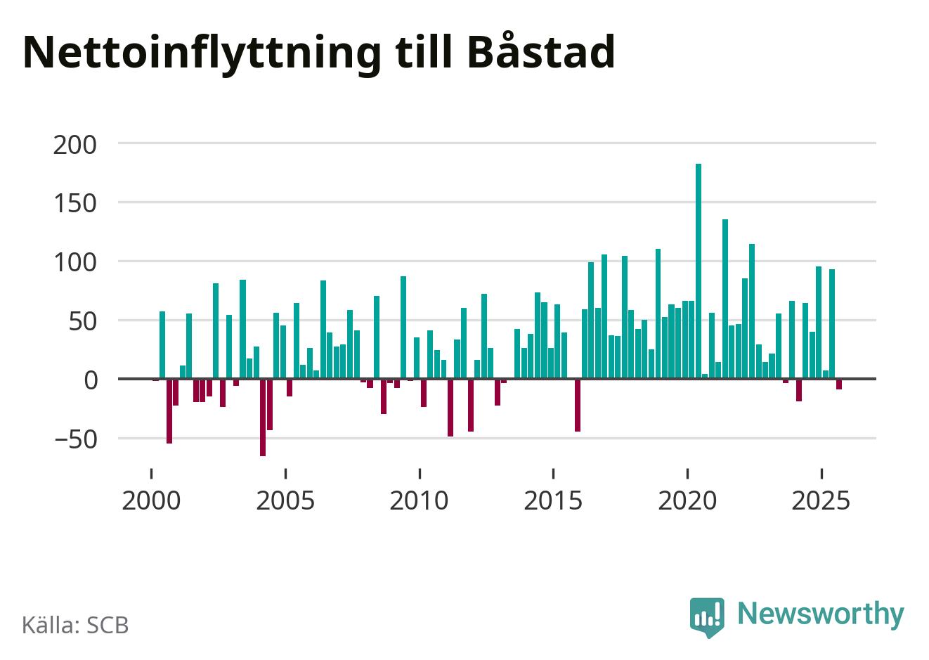 Under tredje kvartalet 2025 flyttade 321 personer till kommunen medan 330 personer flyttade därifrån. Det är historiskt sett en stor utflyttning under ett kvartal. Skillnaden mellan antalet in- och utflyttade är så liten att den lika gärna kan bero på SCB:s slumpmässiga brus. Sedan seklets början har Båstad haft ett positivt flyttnetto under nästan alla kvartal.