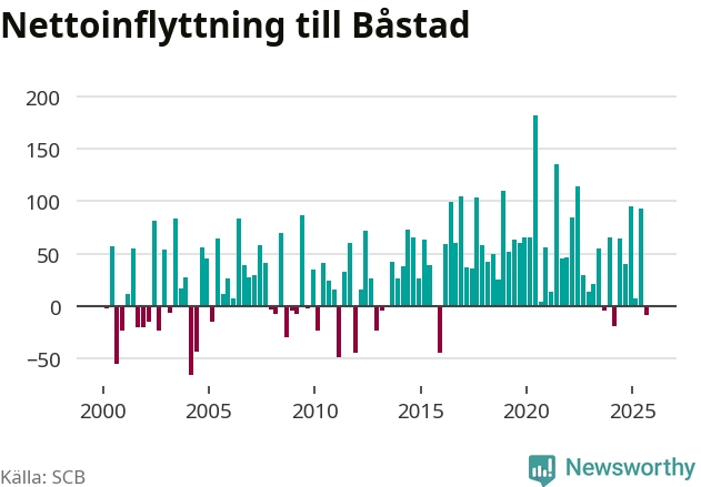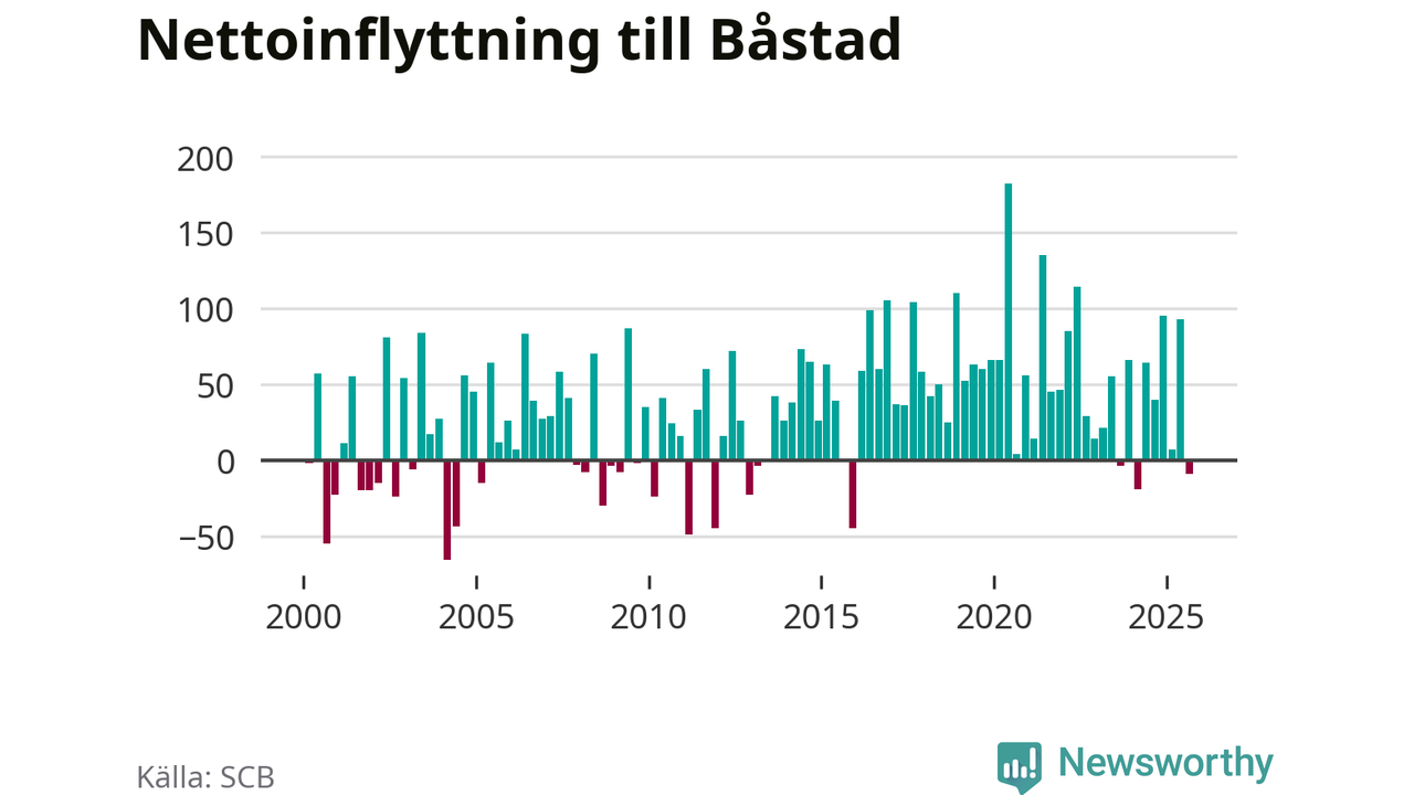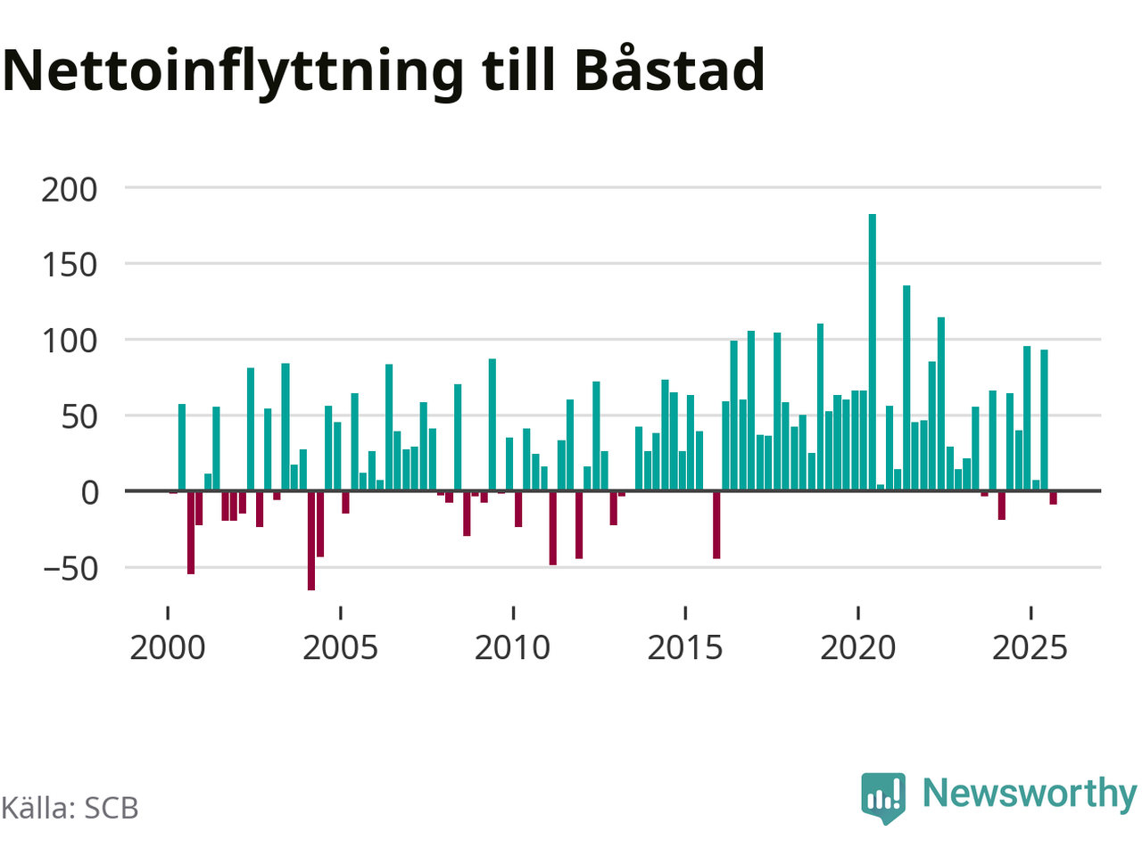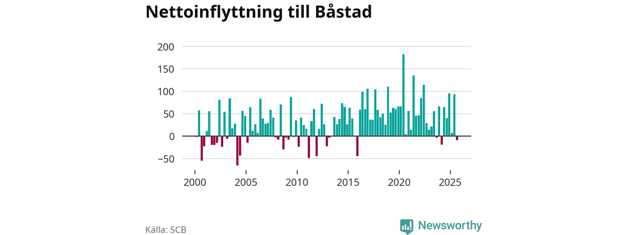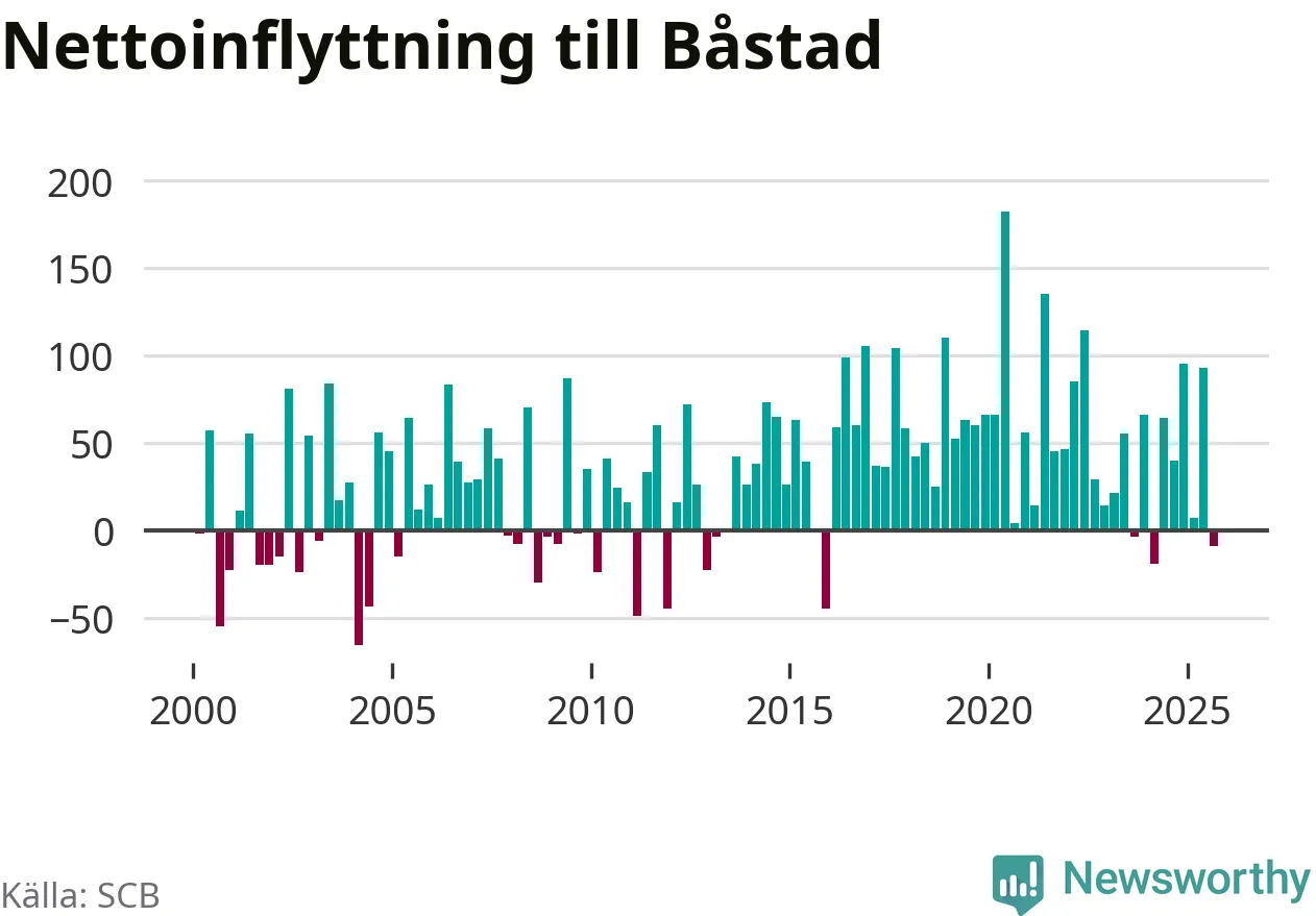 Under tredje kvartalet 2025 flyttade 321 personer till kommunen medan 330 personer flyttade därifrån. Det är historiskt sett en stor utflyttning under ett kvartal. Skillnaden mellan antalet in- och utflyttade är så liten att den lika gärna kan bero på SCB:s slumpmässiga brus. Sedan seklets början har Båstad haft ett positivt flyttnetto under nästan alla kvartal.