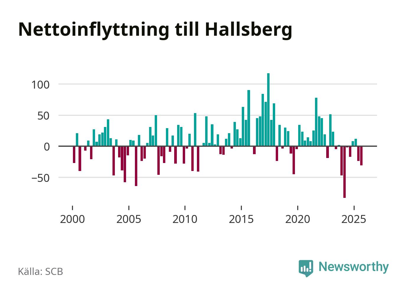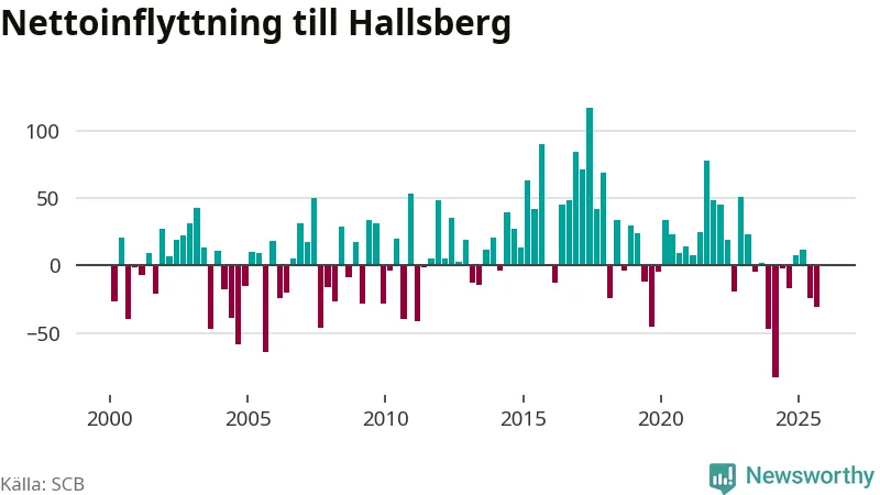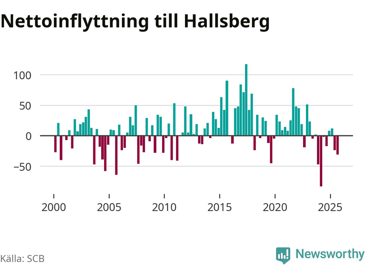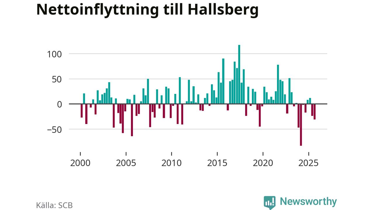 Under tredje kvartalet 2025 flyttade 250 personer till kommunen medan 281 personer flyttade därifrån. Sedan seklets början har Hallsberg oftast haft ett positivt flyttnetto.
