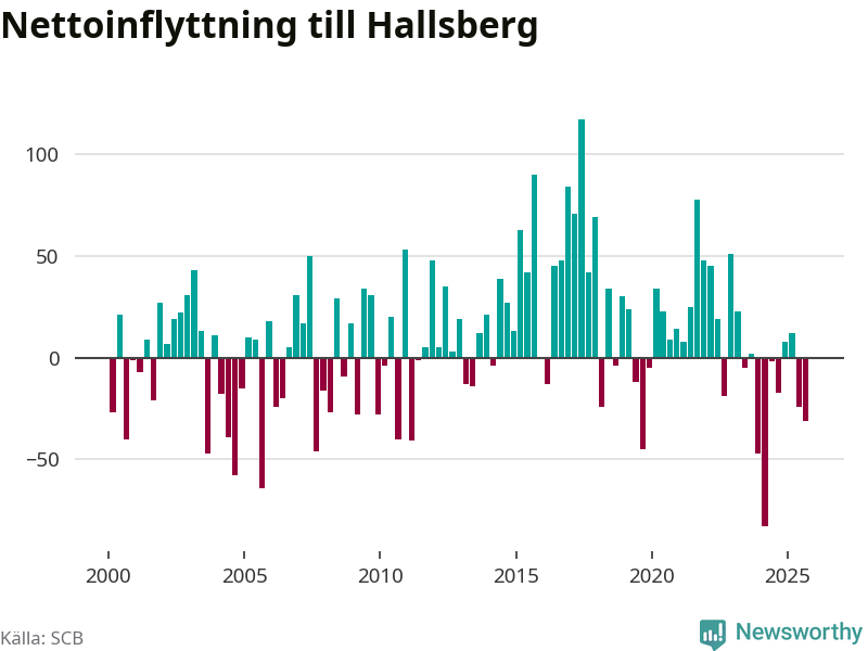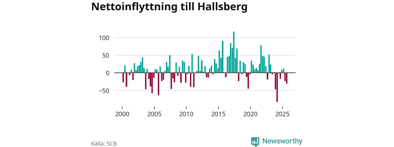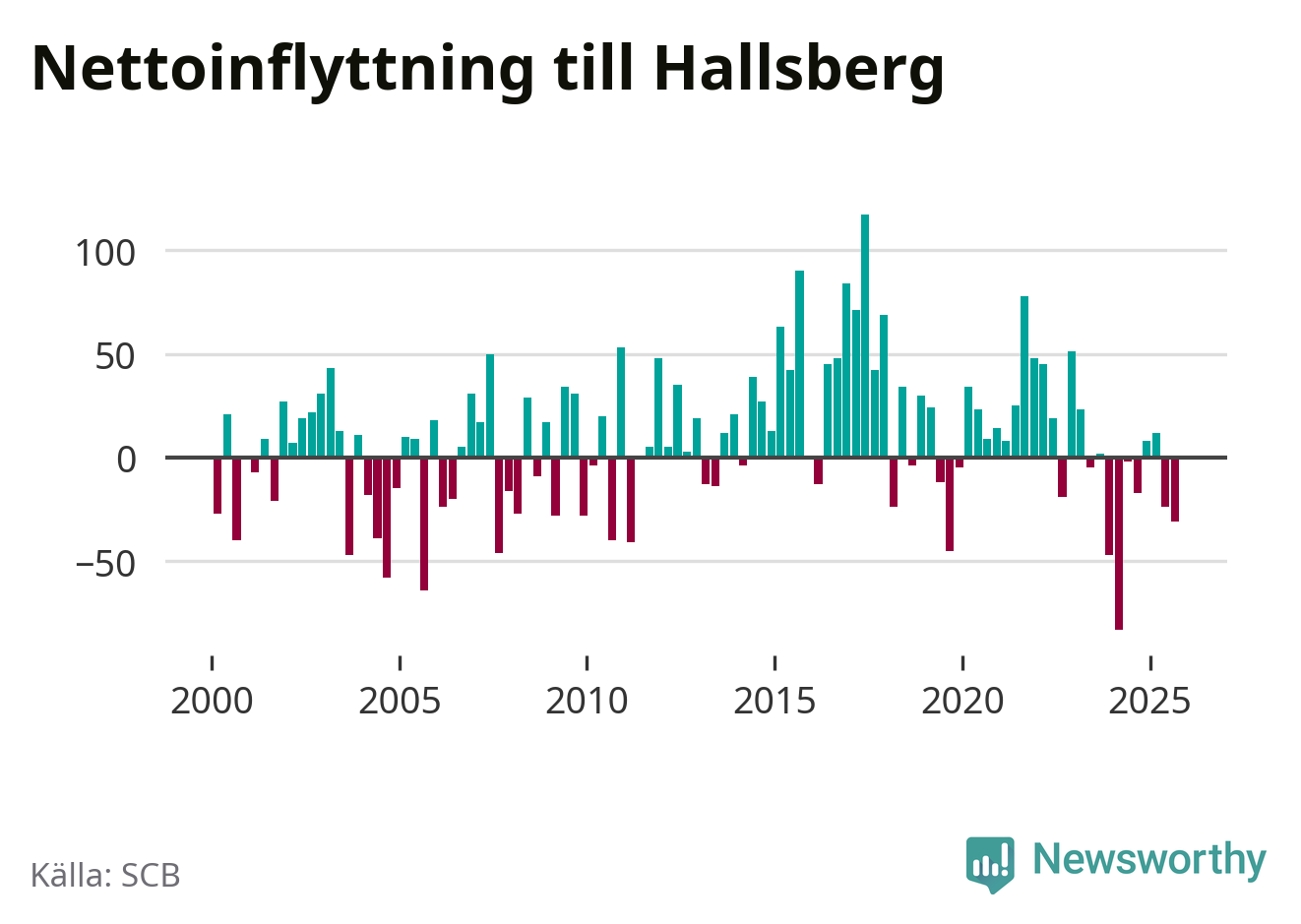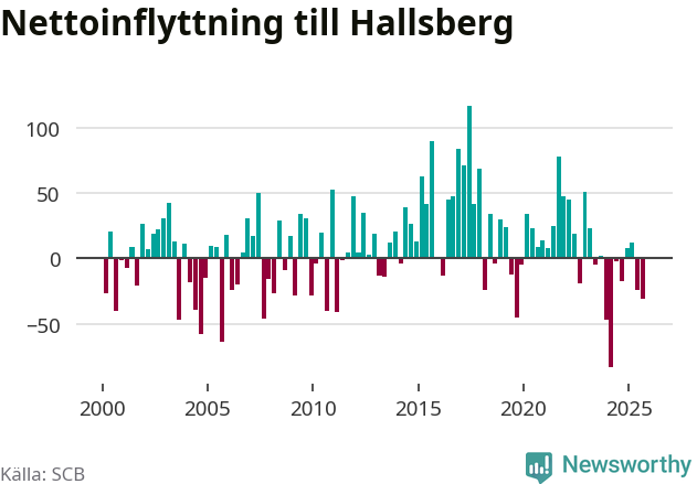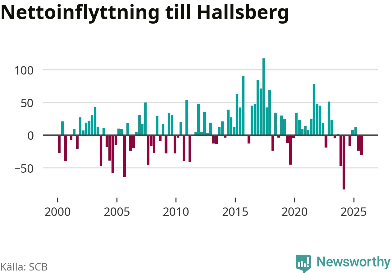 Under tredje kvartalet 2025 flyttade 250 personer till kommunen medan 281 personer flyttade därifrån. Sedan seklets början har Hallsberg oftast haft ett positivt flyttnetto.