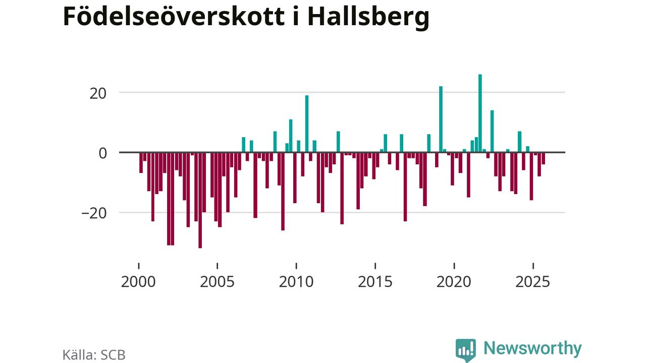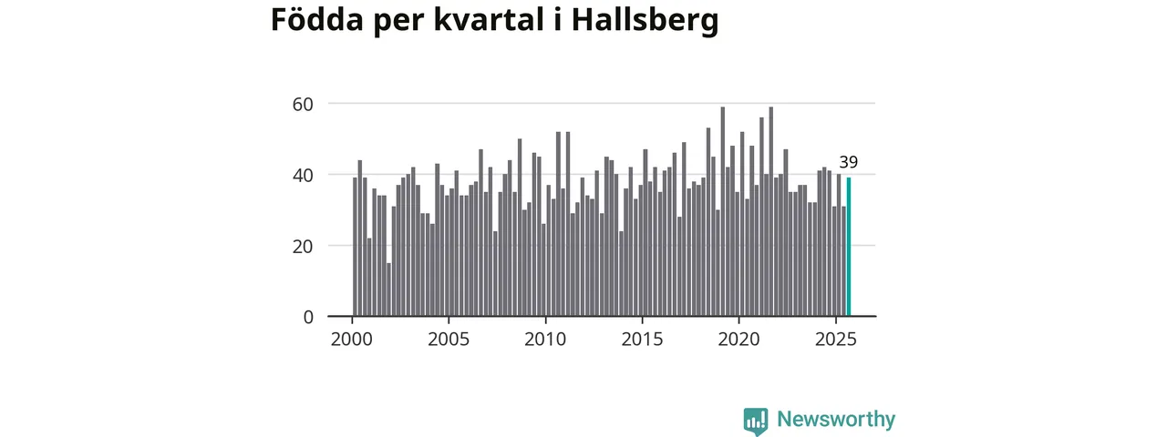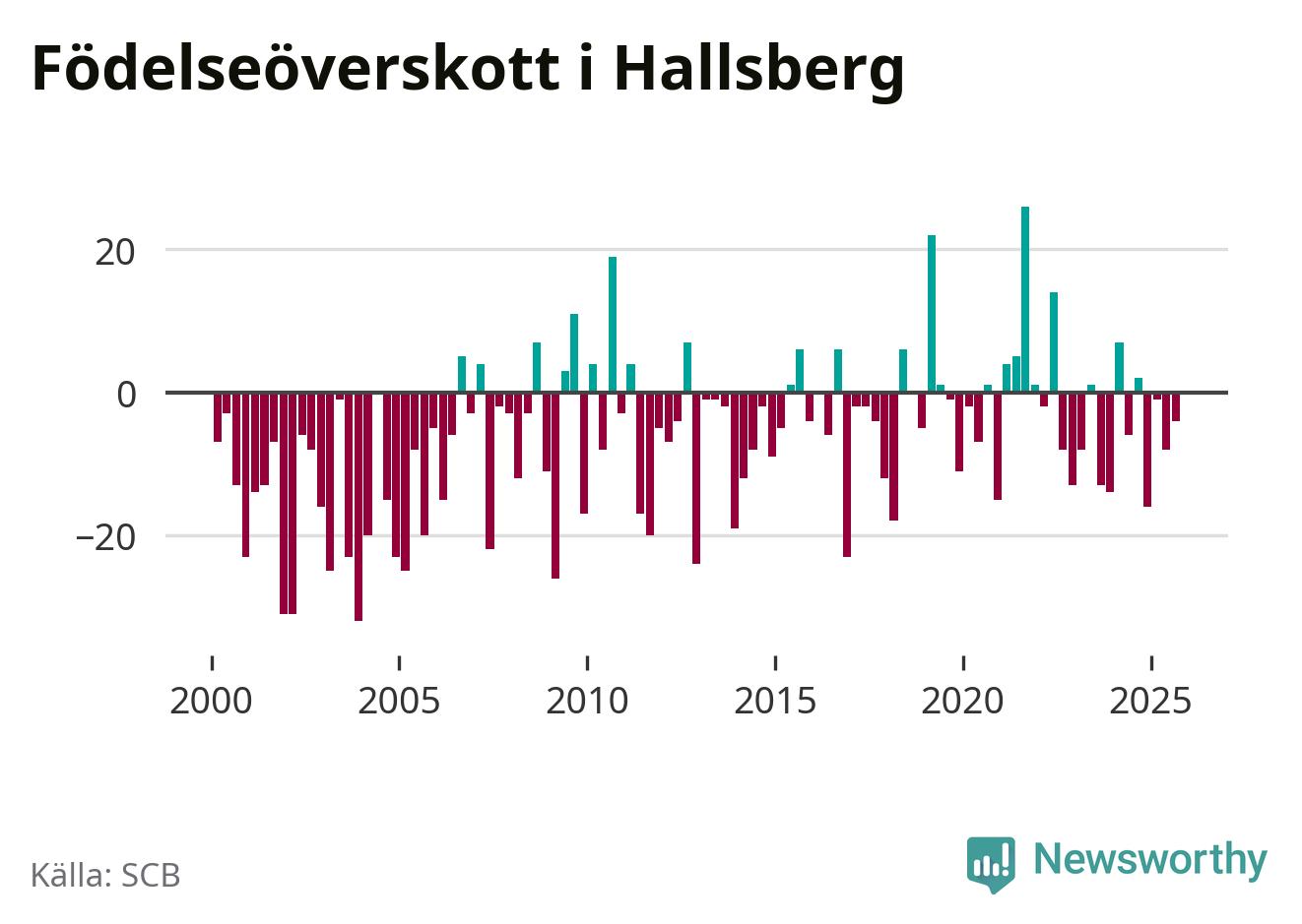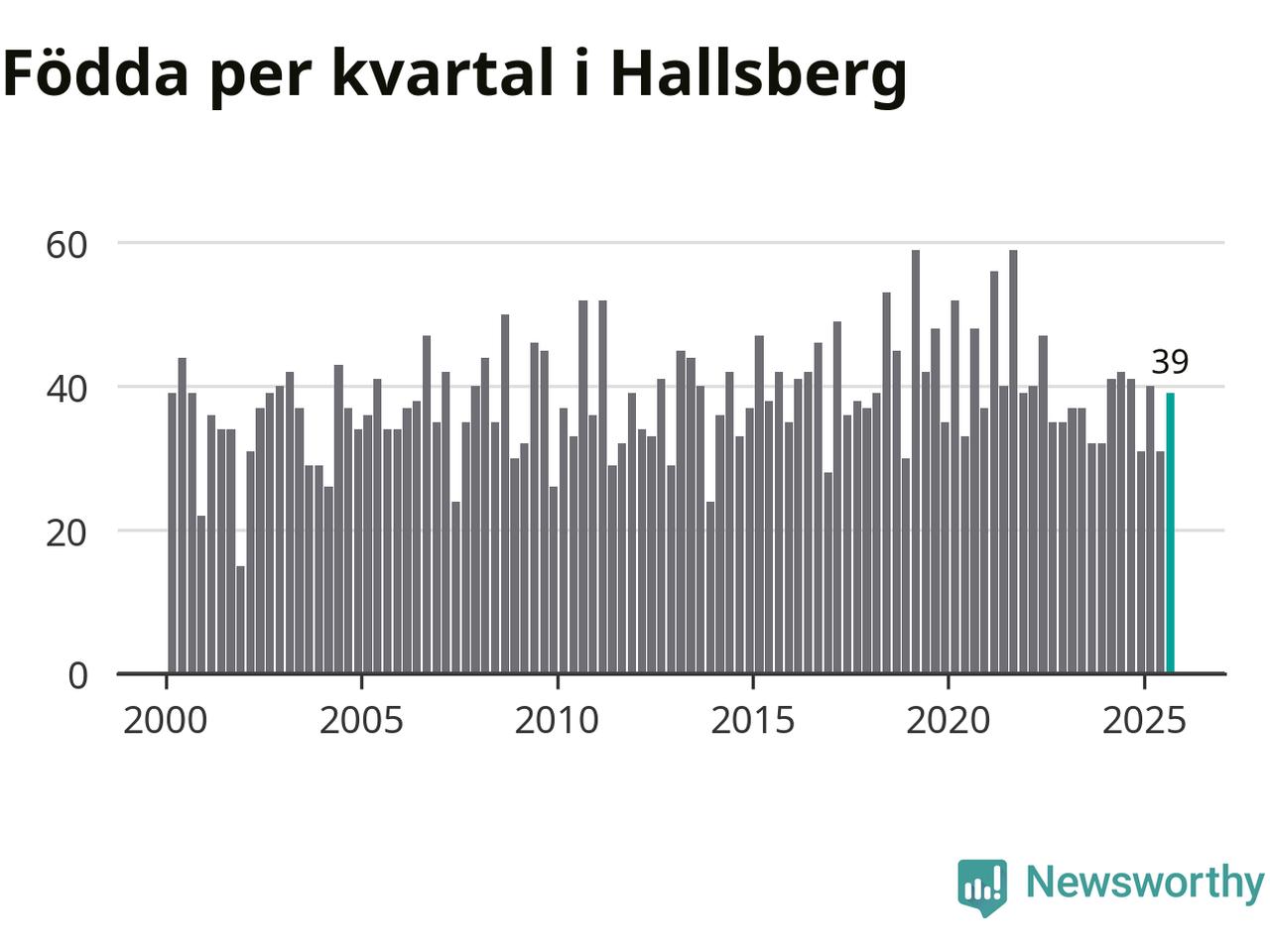 Enligt SCB:s siffror föddes 39 barn i Hallsberg under det senaste kvartalet. Samtidigt avled 43 personer. Skillnaden mellan antal födda och döda är så liten att det inte går att säga om det beror på något annat än SCB:s röjandeskydd. Kommunen har historiskt sett haft ungefär lika många kvartal med positivt födelsenetto som negativt.