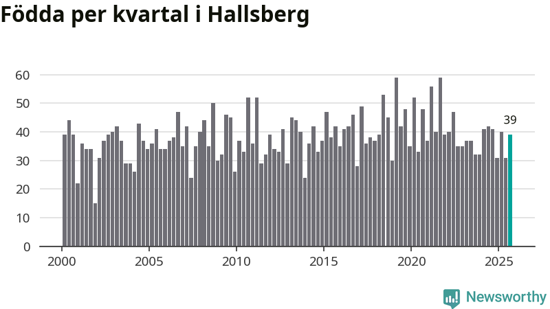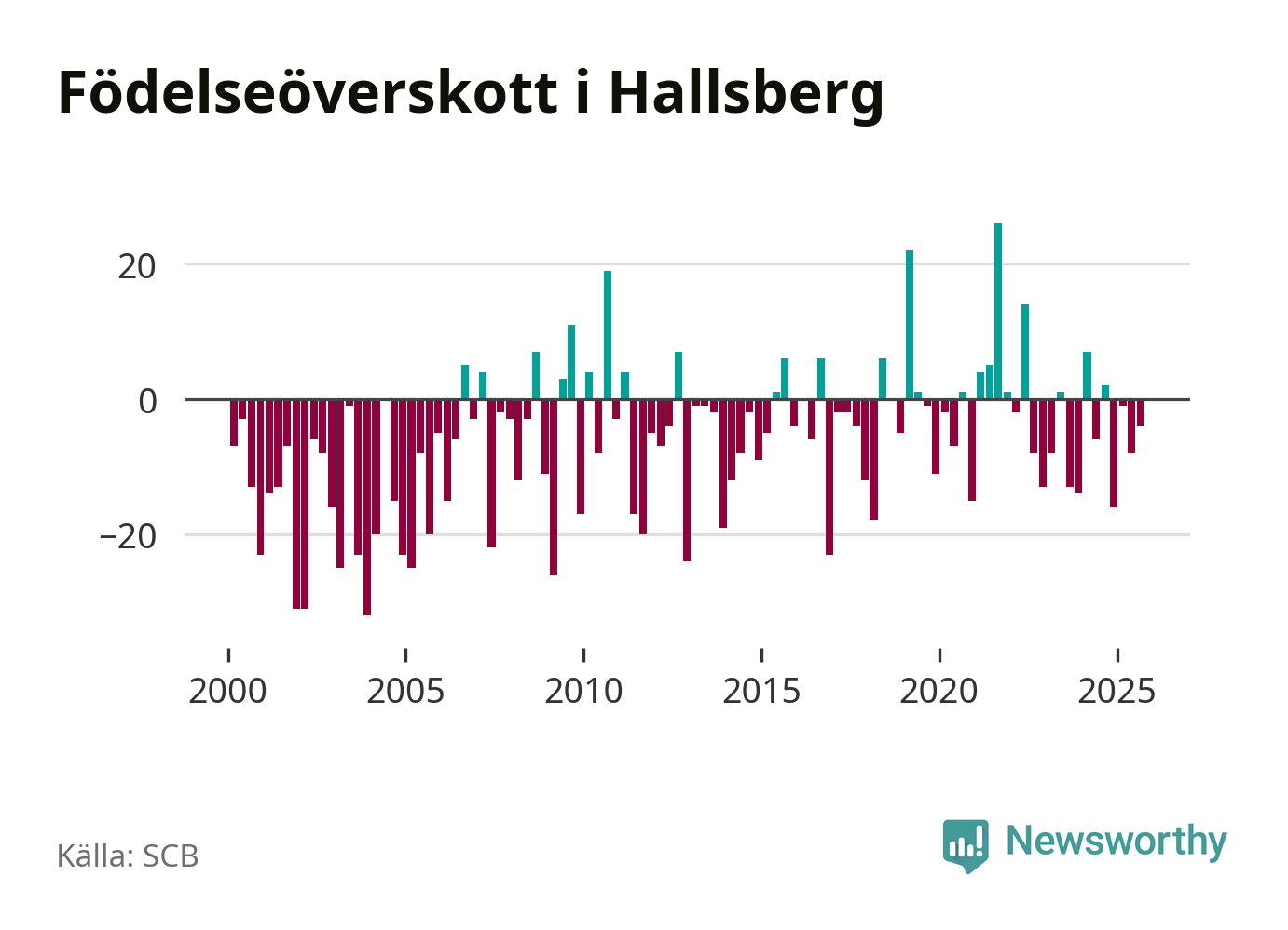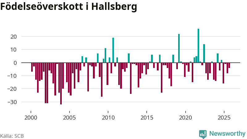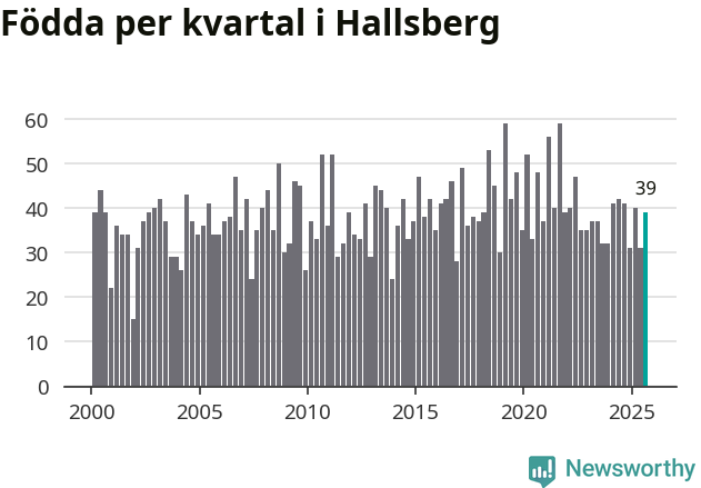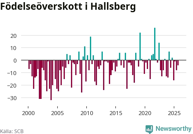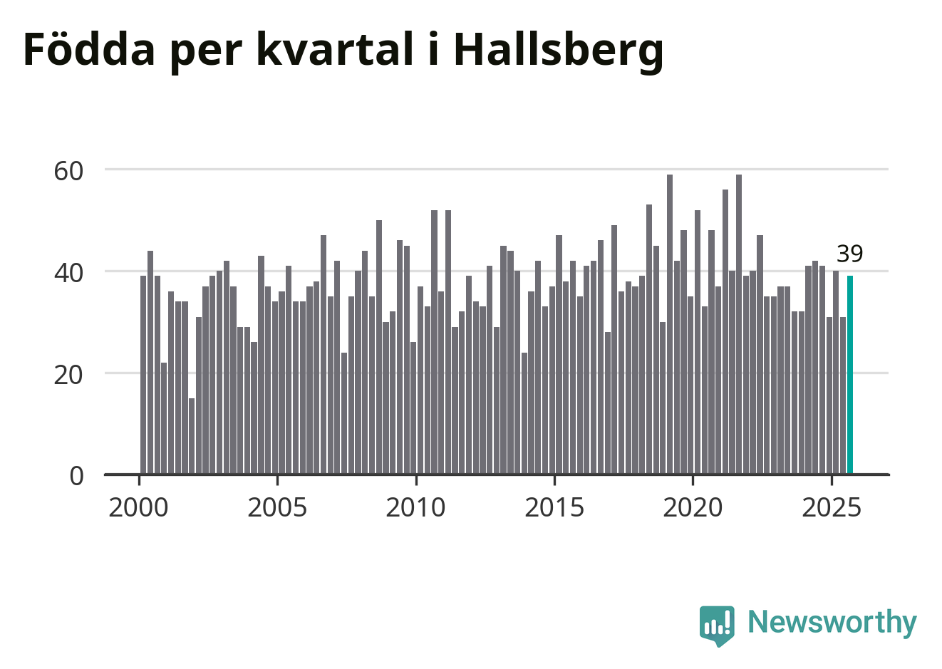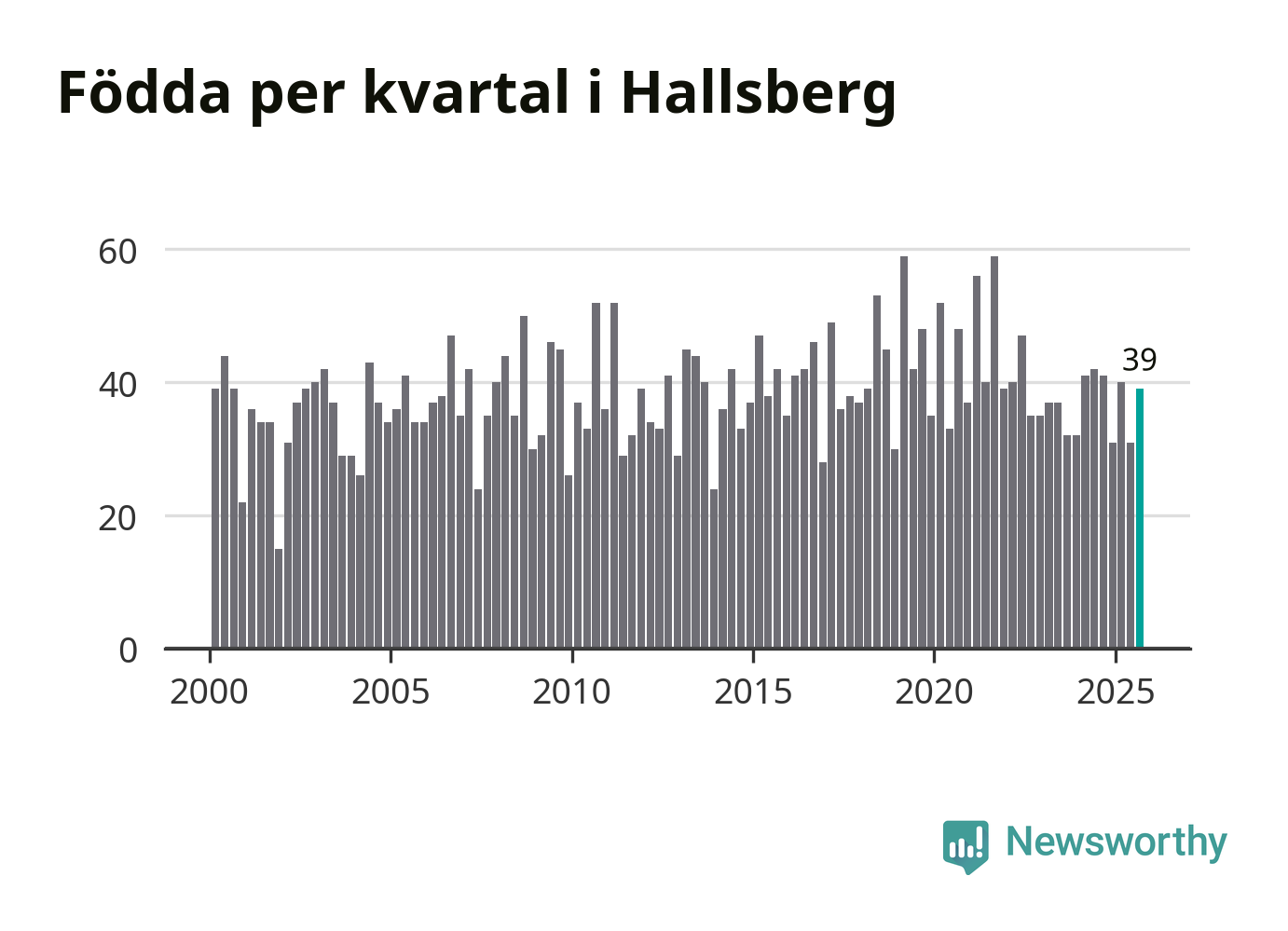Enligt SCB:s siffror föddes 39 barn i Hallsberg under det senaste kvartalet. Samtidigt avled 43 personer. Skillnaden mellan antal födda och döda är så liten att det inte går att säga om det beror på något annat än SCB:s röjandeskydd. Kommunen har historiskt sett haft ungefär lika många kvartal med positivt födelsenetto som negativt.