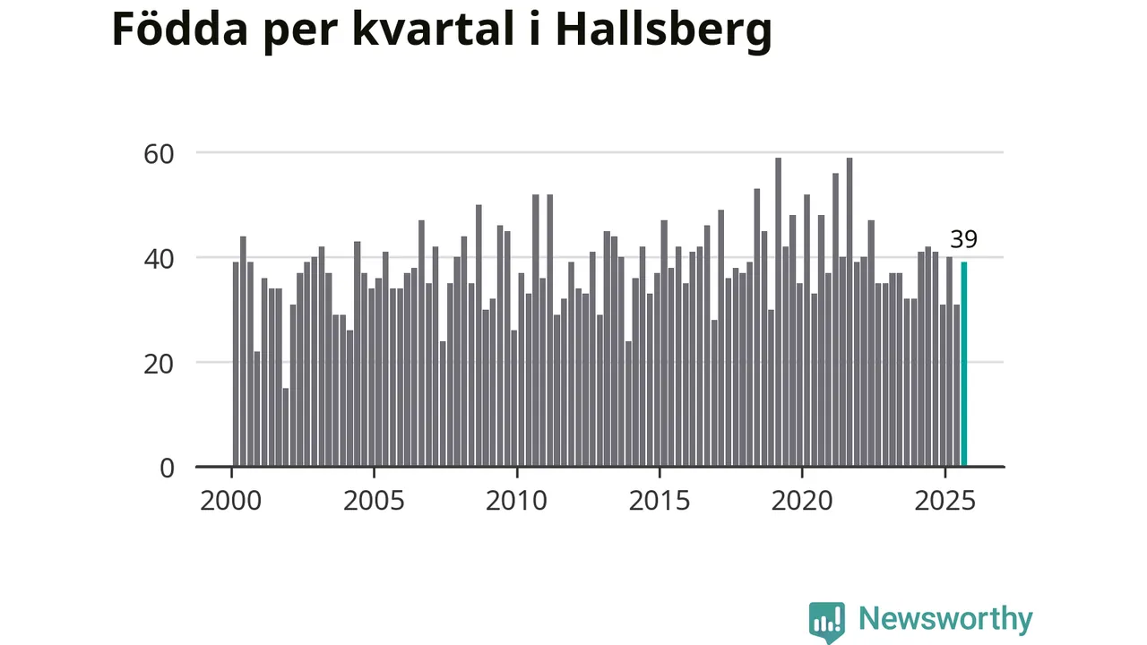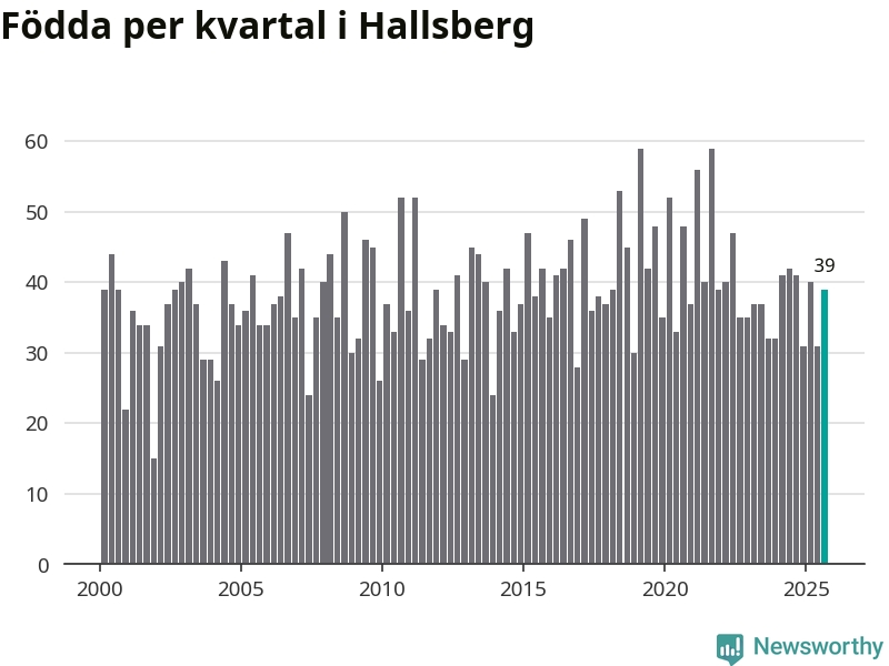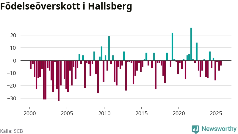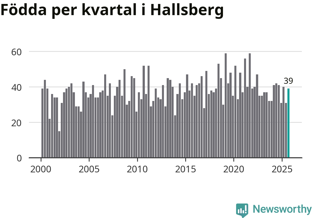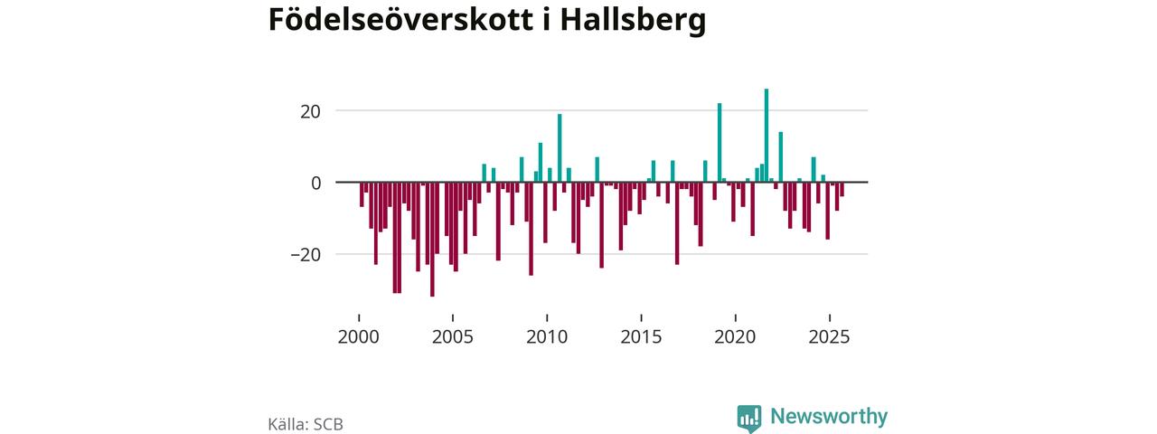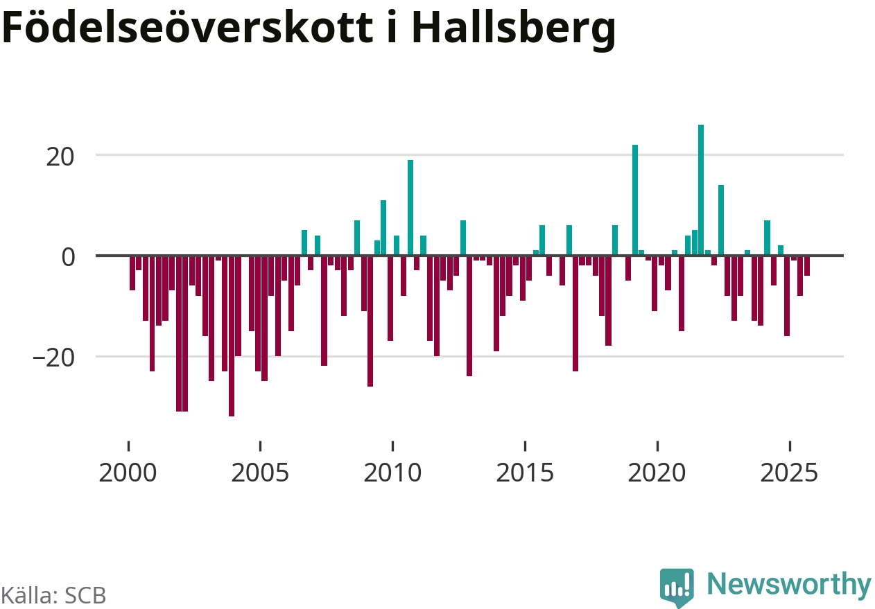Enligt SCB:s siffror föddes 39 barn i Hallsberg under det senaste kvartalet. Samtidigt avled 43 personer. Skillnaden mellan antal födda och döda är så liten att det inte går att säga om det beror på något annat än SCB:s röjandeskydd. Kommunen har historiskt sett haft ungefär lika många kvartal med positivt födelsenetto som negativt.