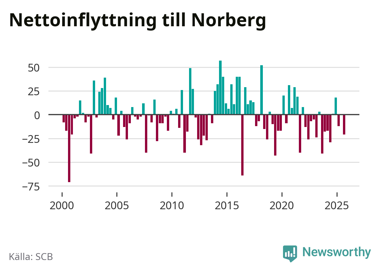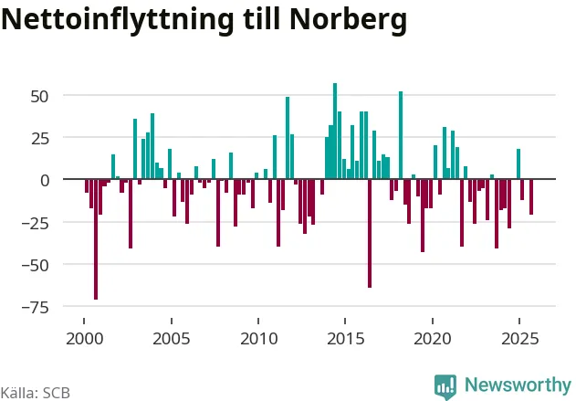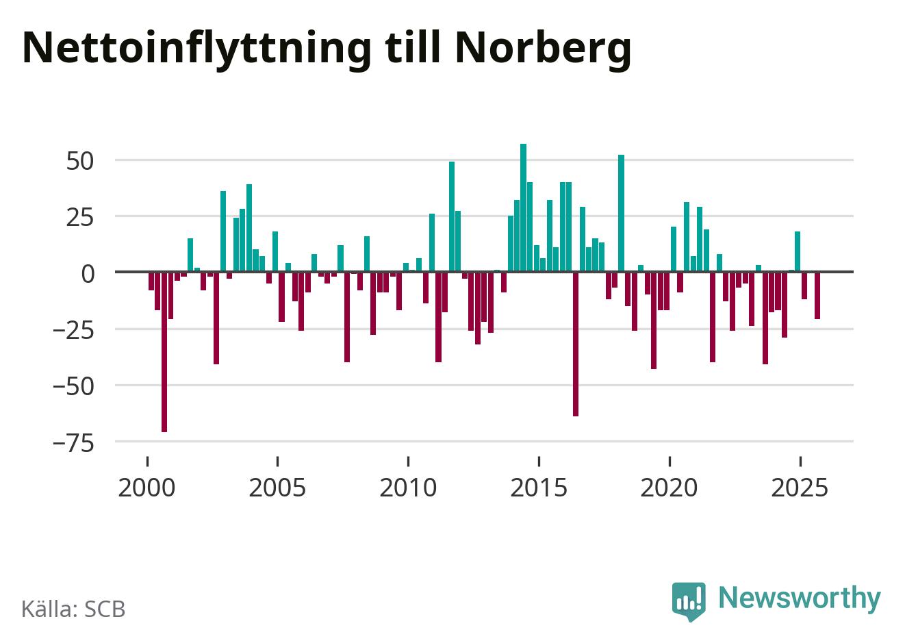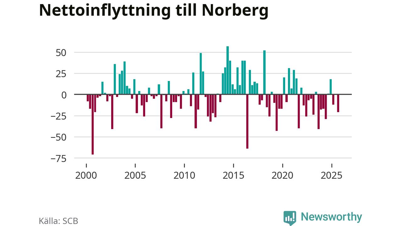 Under tredje kvartalet 2025 flyttade 82 personer till kommunen medan 103 personer flyttade därifrån. Sedan seklets början har Norberg haft ungefär lika många kvartal med positivt flyttnetto som negativt.
