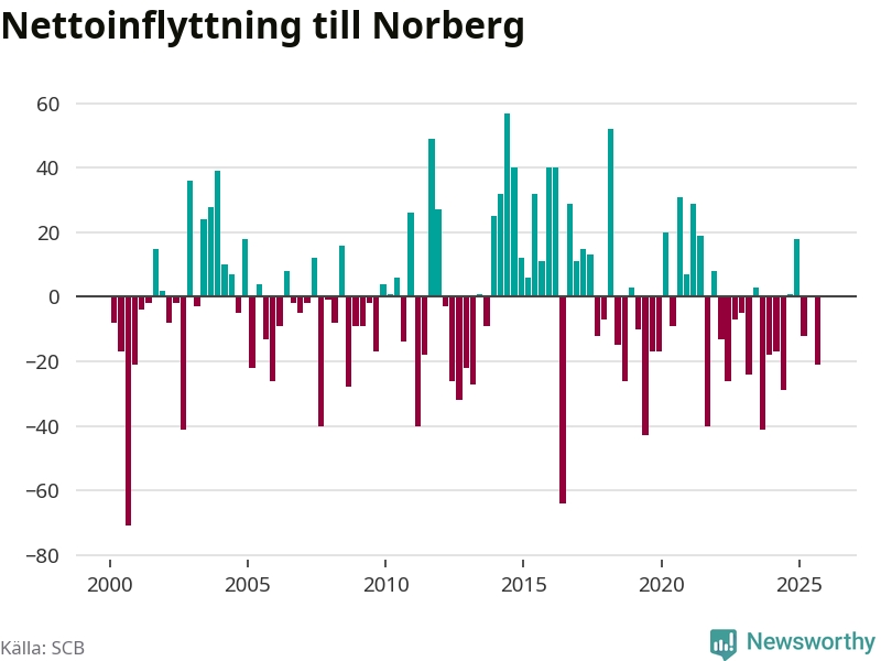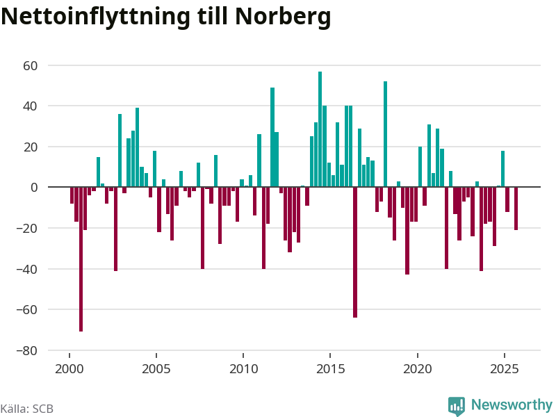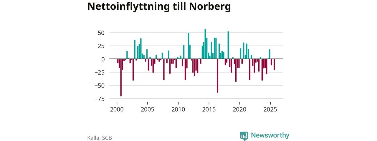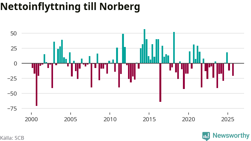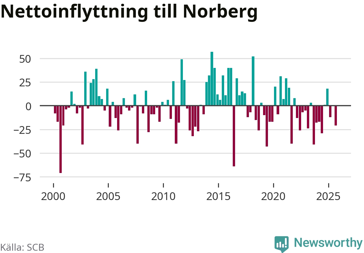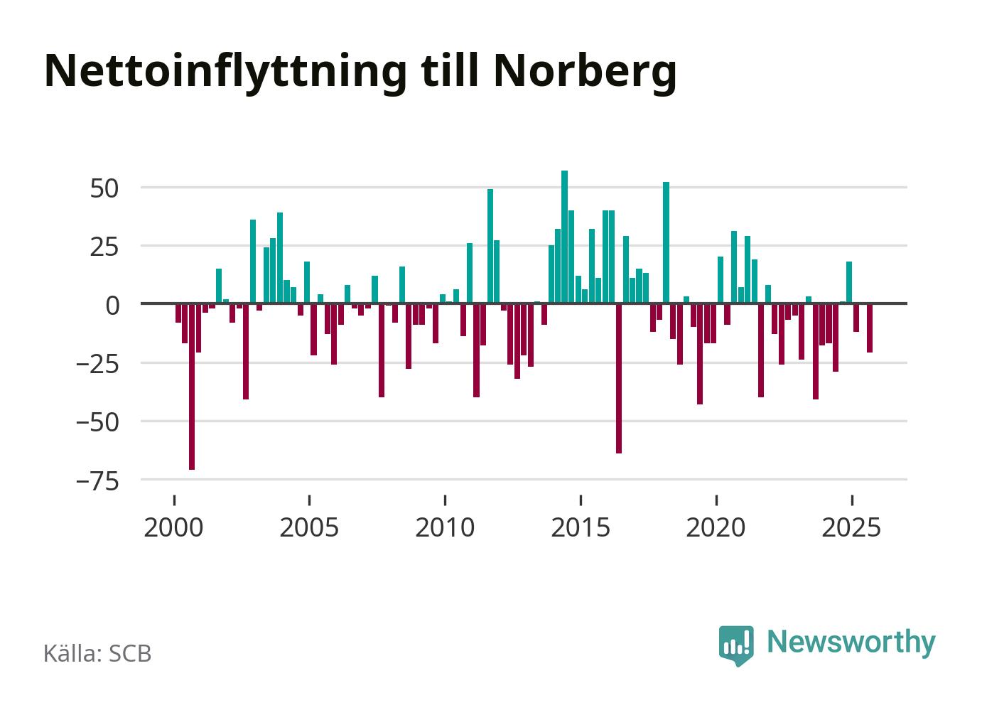 Under tredje kvartalet 2025 flyttade 82 personer till kommunen medan 103 personer flyttade därifrån. Sedan seklets början har Norberg haft ungefär lika många kvartal med positivt flyttnetto som negativt.
