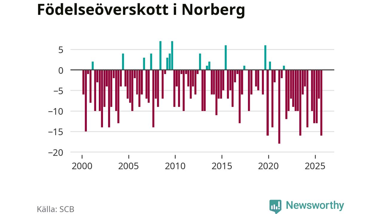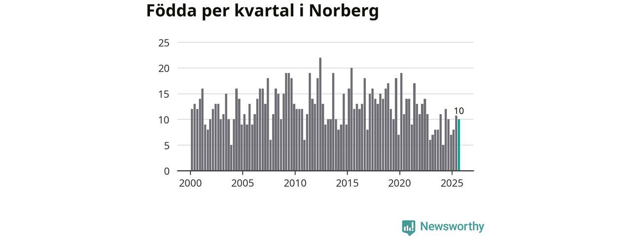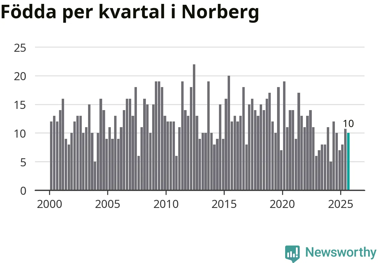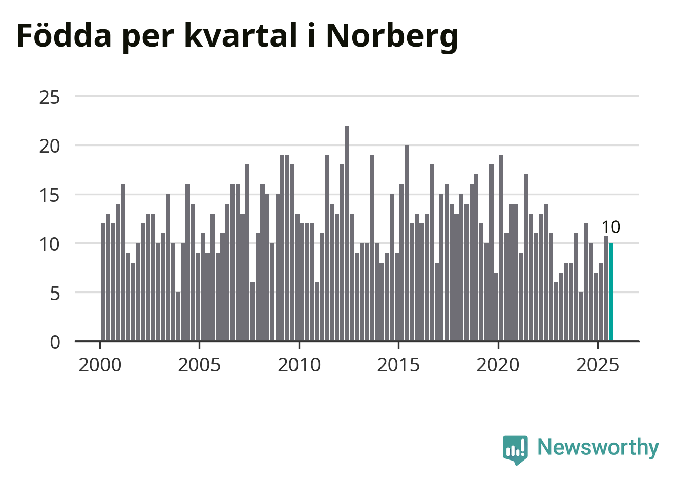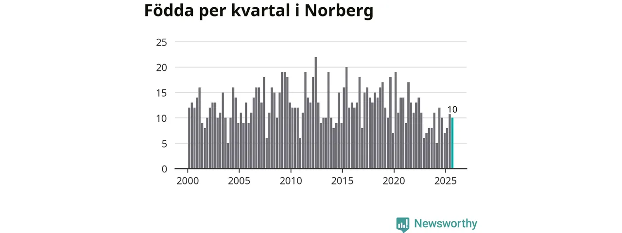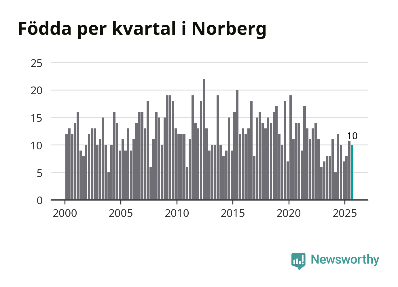 Enligt SCB:s siffror föddes tio barn i Norberg under det senaste kvartalet. Samtidigt avled relativt många – 26 personer. Norberg hade alltså ett negativt födelsenetto, vilket kommunen historiskt sett oftast har haft.