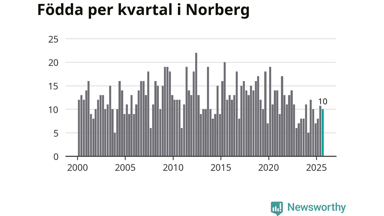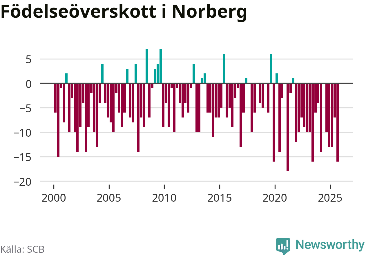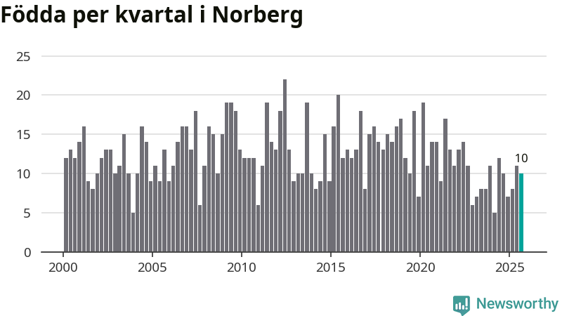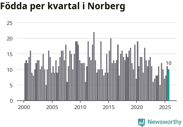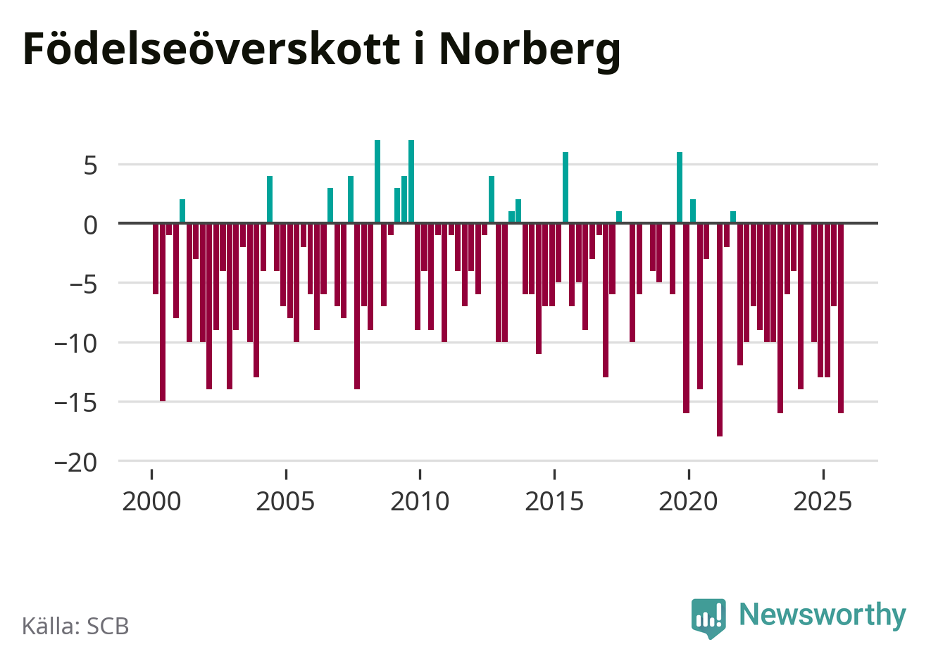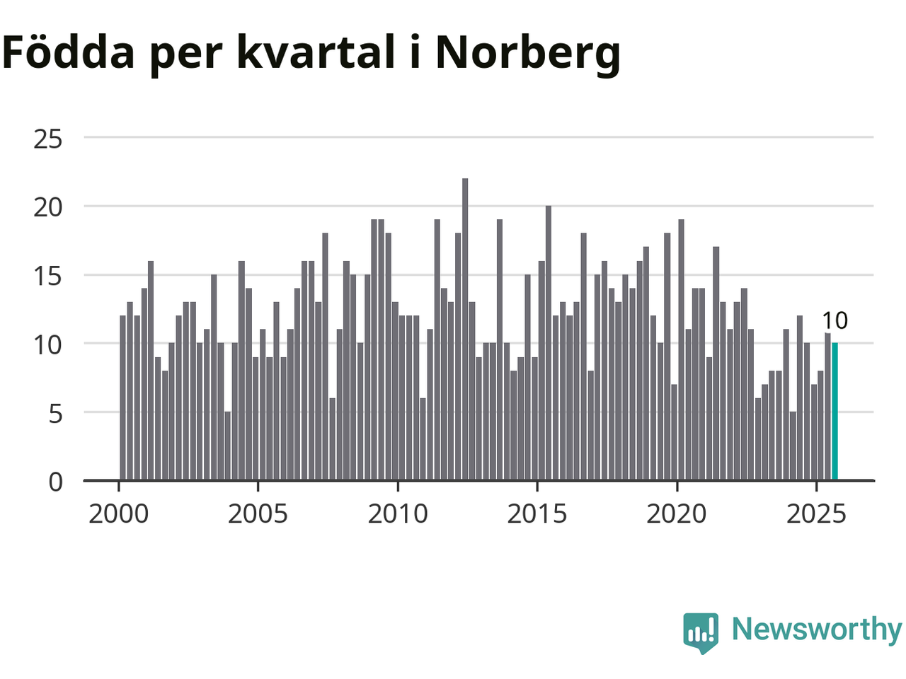 Enligt SCB:s siffror föddes tio barn i Norberg under det senaste kvartalet. Samtidigt avled relativt många – 26 personer. Norberg hade alltså ett negativt födelsenetto, vilket kommunen historiskt sett oftast har haft.