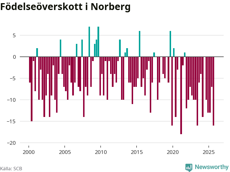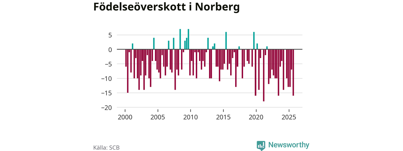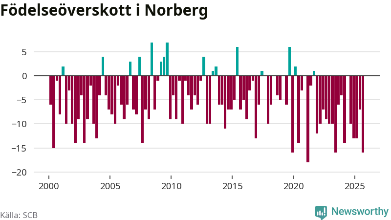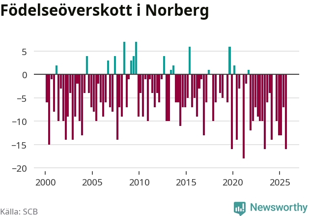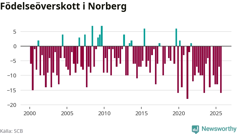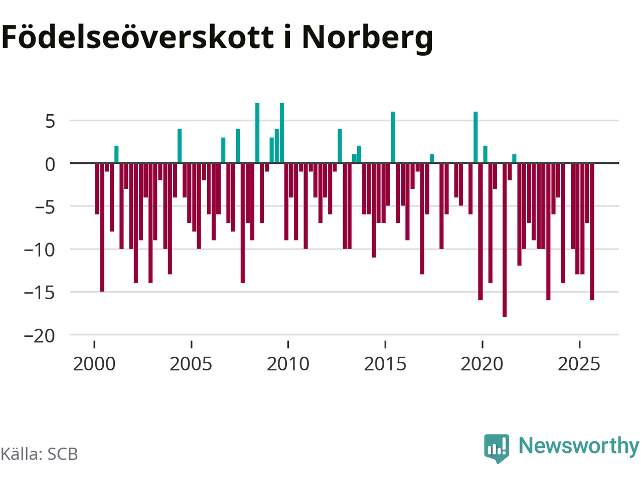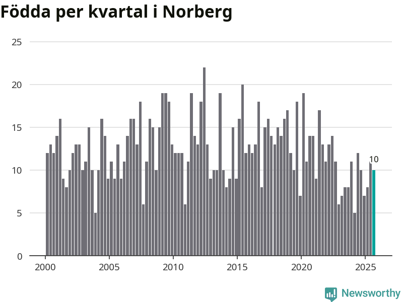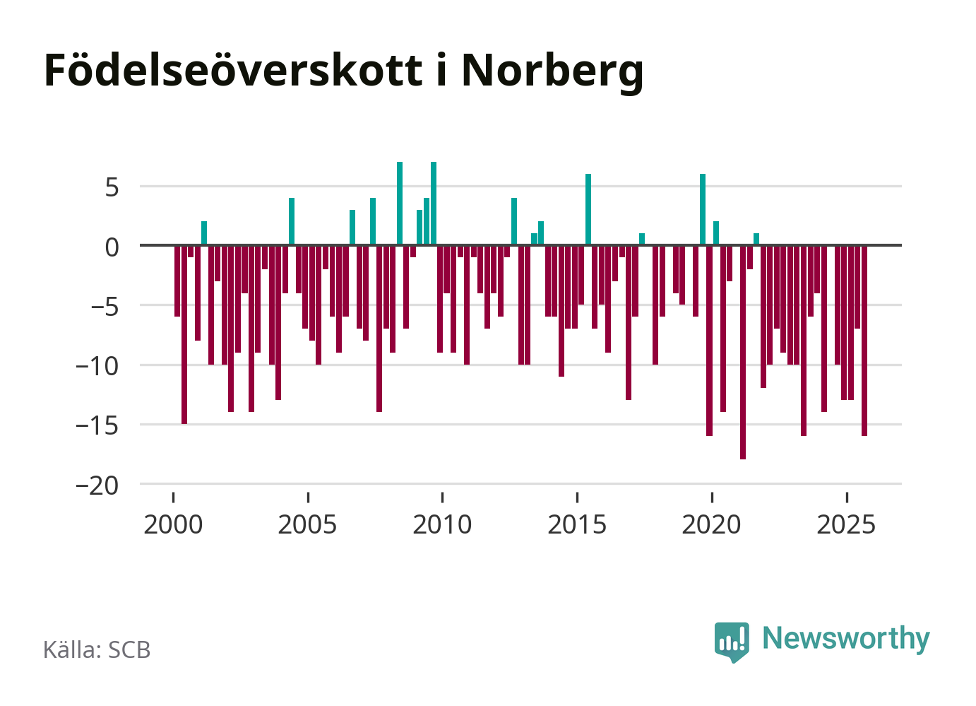 Enligt SCB:s siffror föddes tio barn i Norberg under det senaste kvartalet. Samtidigt avled relativt många – 26 personer. Norberg hade alltså ett negativt födelsenetto, vilket kommunen historiskt sett oftast har haft.