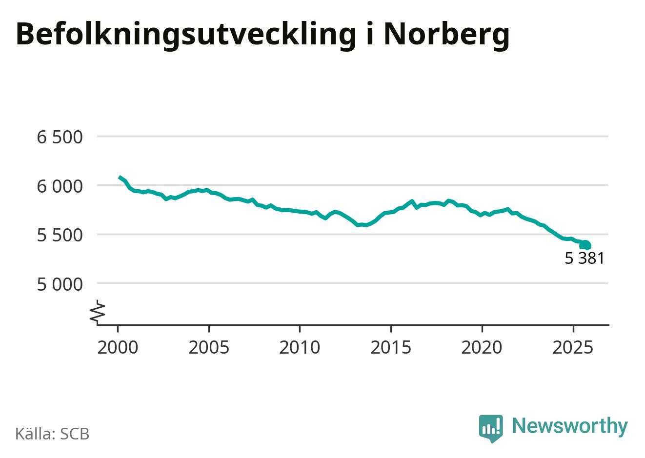 Jämfört med för ett år sedan har befolkningen i Norberg minskat med knappt 70 personer – vilket motsvarar en nedgång på 1,2 procent. Sedan millennieskiftet har folkmängden minskat med runt 690 personer, eller 11 procent.