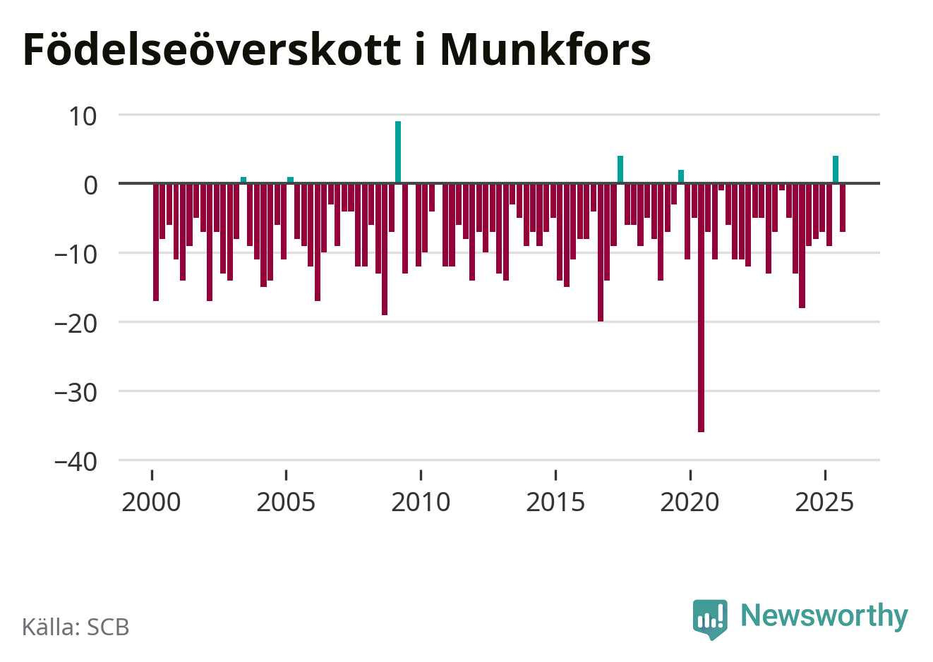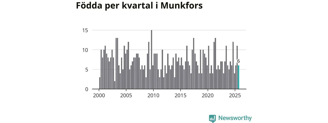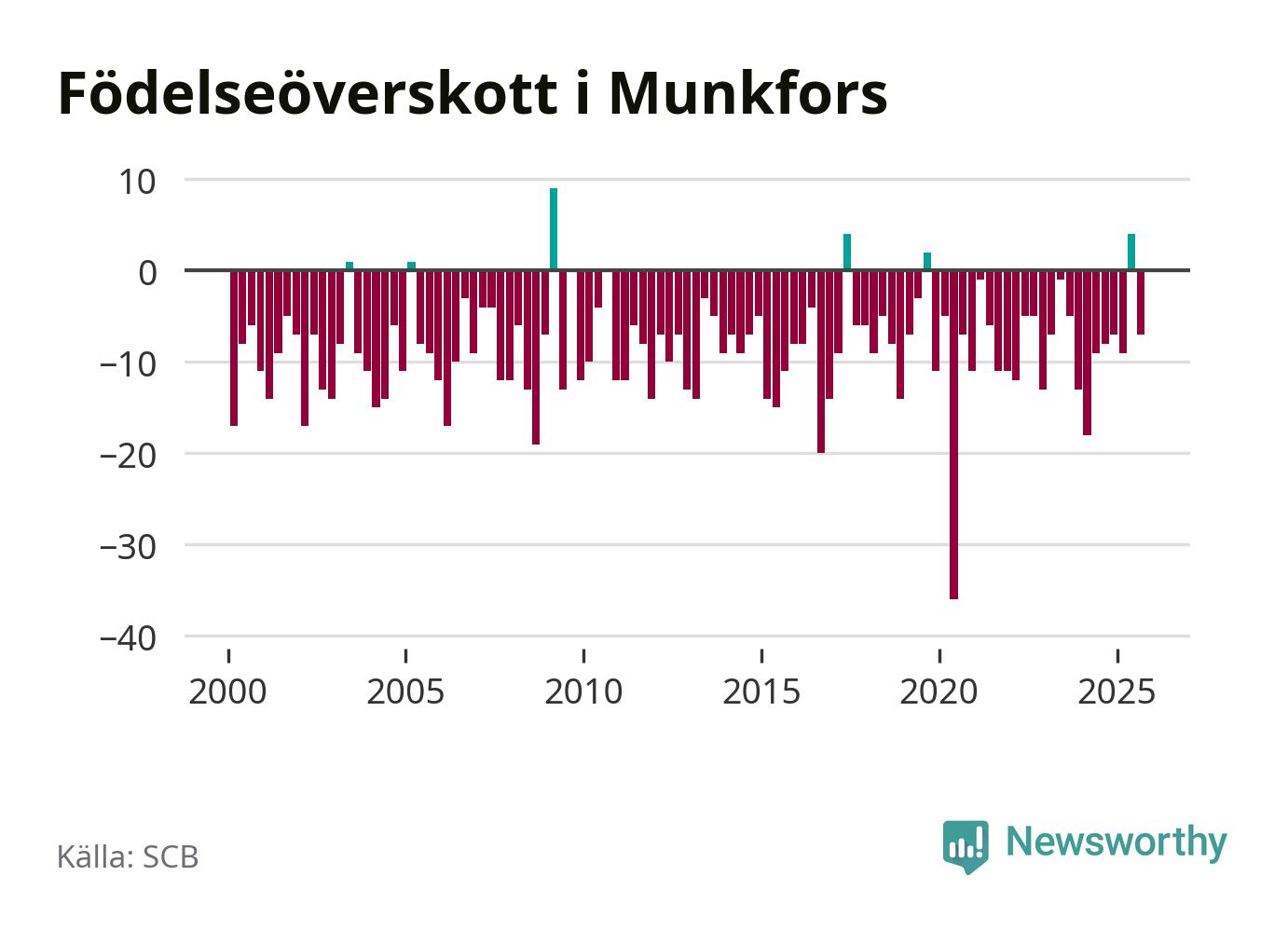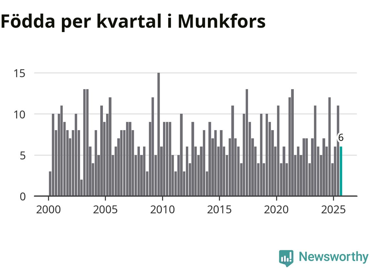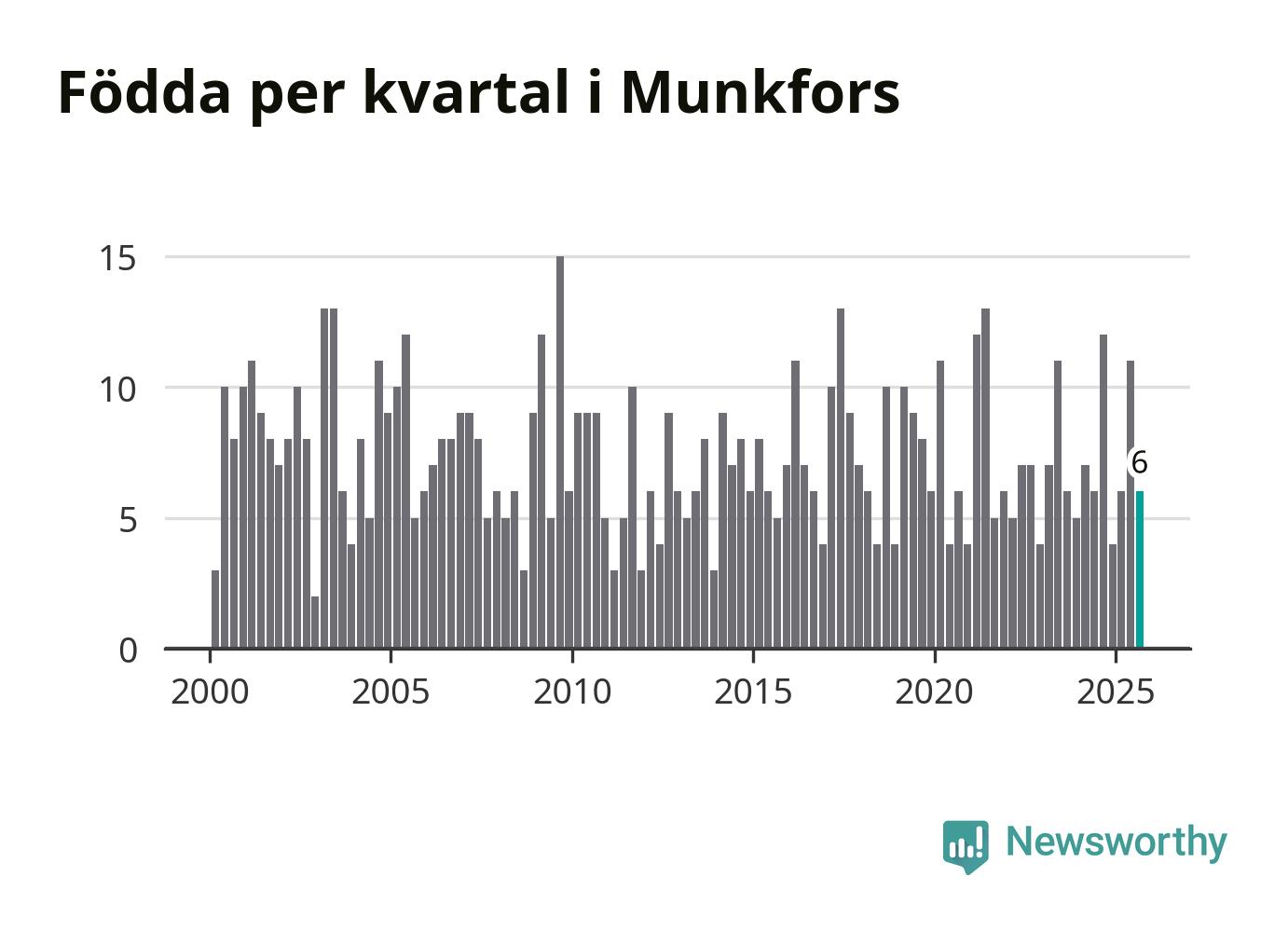 Enligt SCB:s siffror föddes sex barn i Munkfors under det senaste kvartalet. Samtidigt avled 13 personer. Skillnaden mellan antal födda och döda är så liten att det inte går att säga om det beror på något annat än SCB:s röjandeskydd. Kommunen har nästan alltid haft negativt födelsenetto tidigare.
