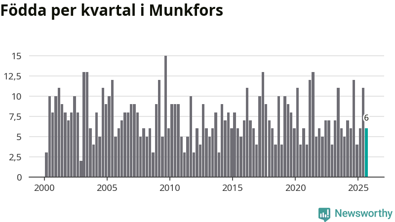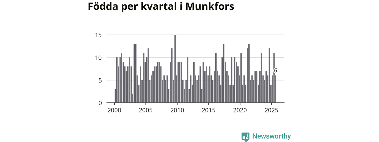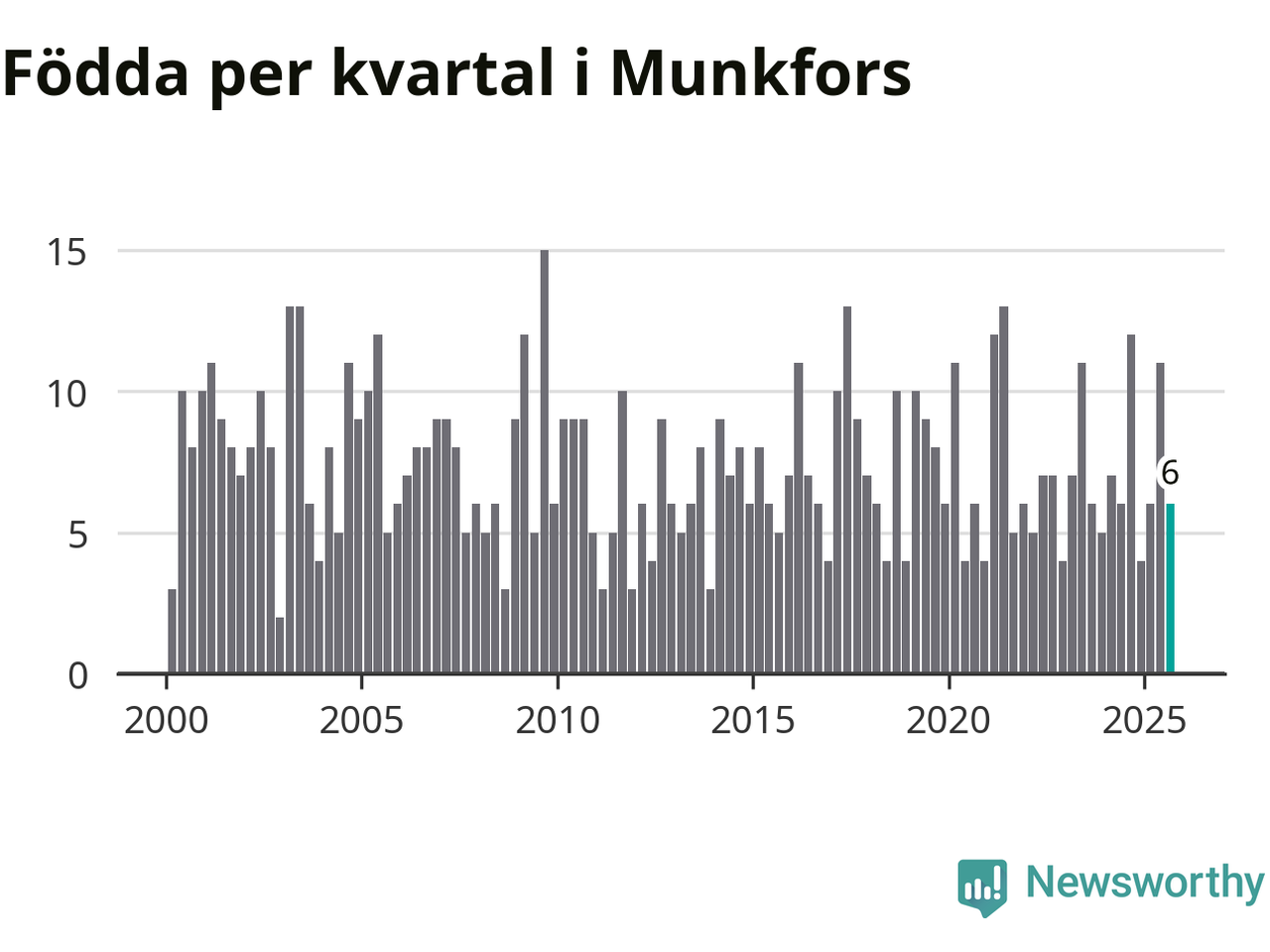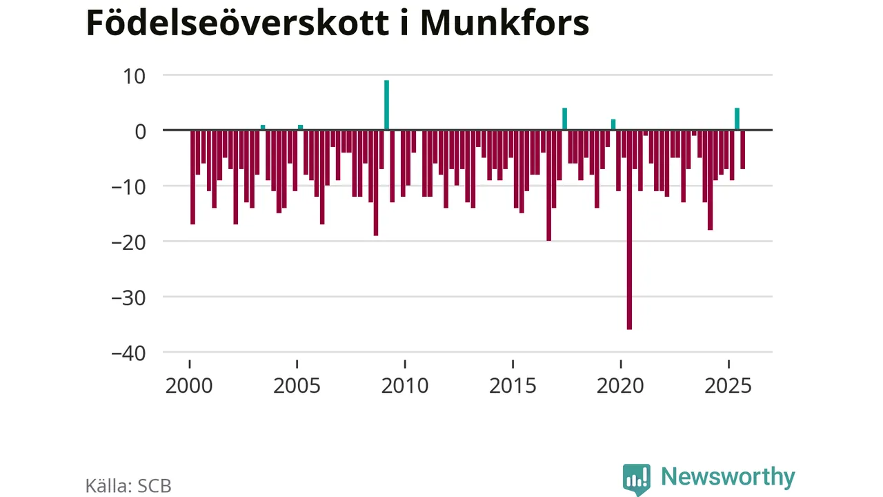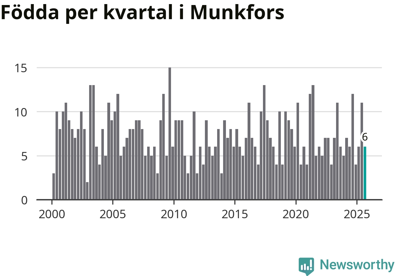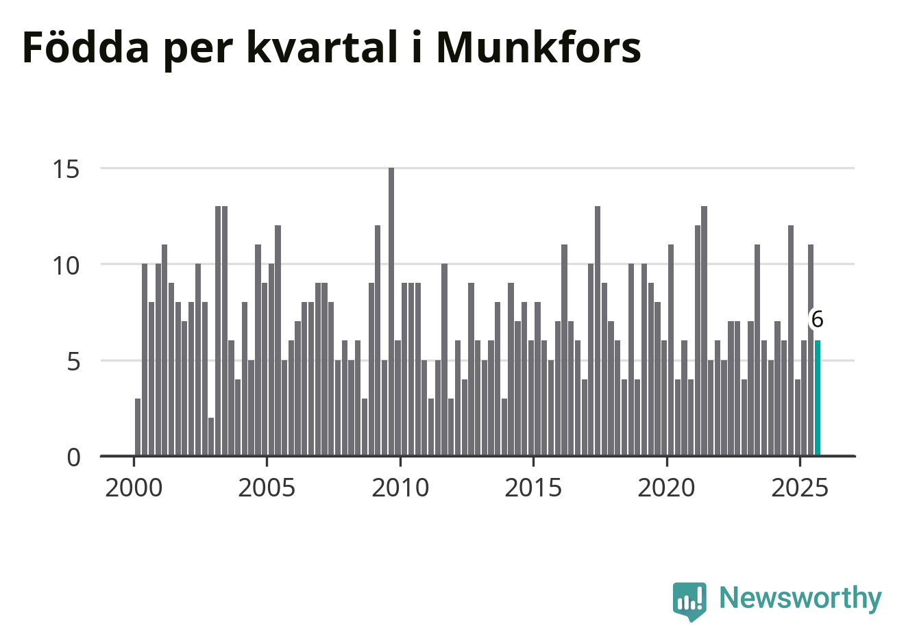 Enligt SCB:s siffror föddes sex barn i Munkfors under det senaste kvartalet. Samtidigt avled 13 personer. Skillnaden mellan antal födda och döda är så liten att det inte går att säga om det beror på något annat än SCB:s röjandeskydd. Kommunen har nästan alltid haft negativt födelsenetto tidigare.