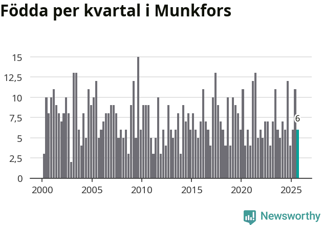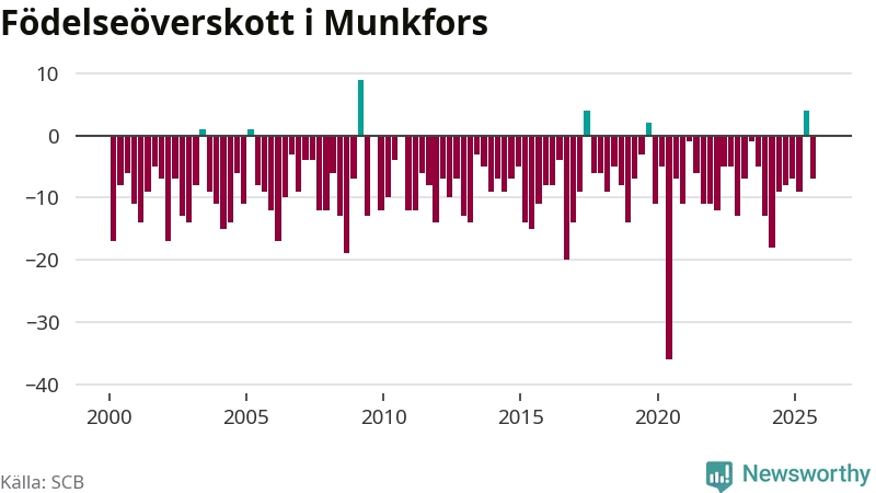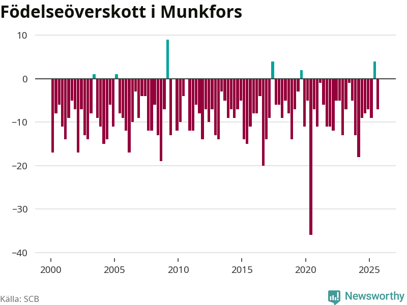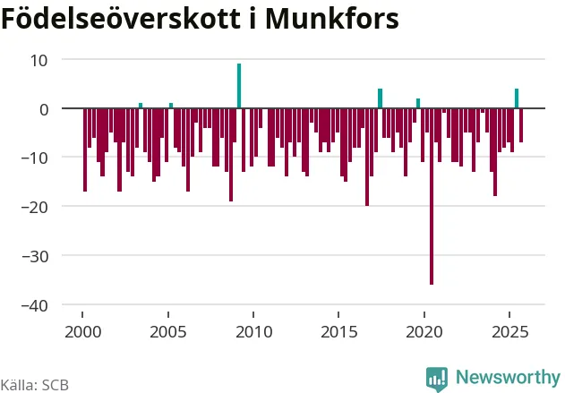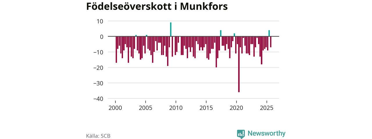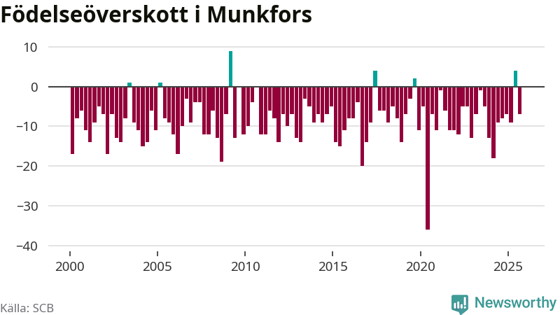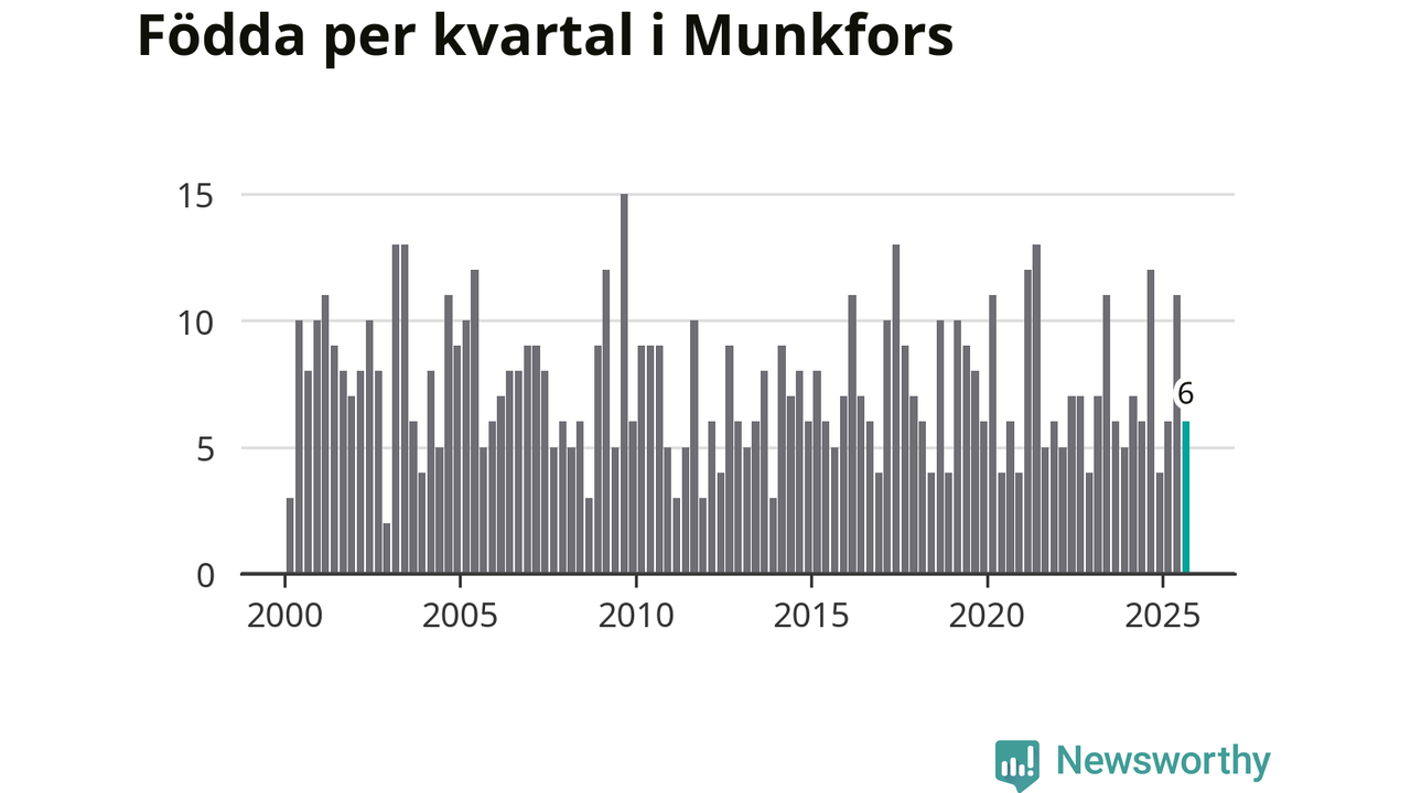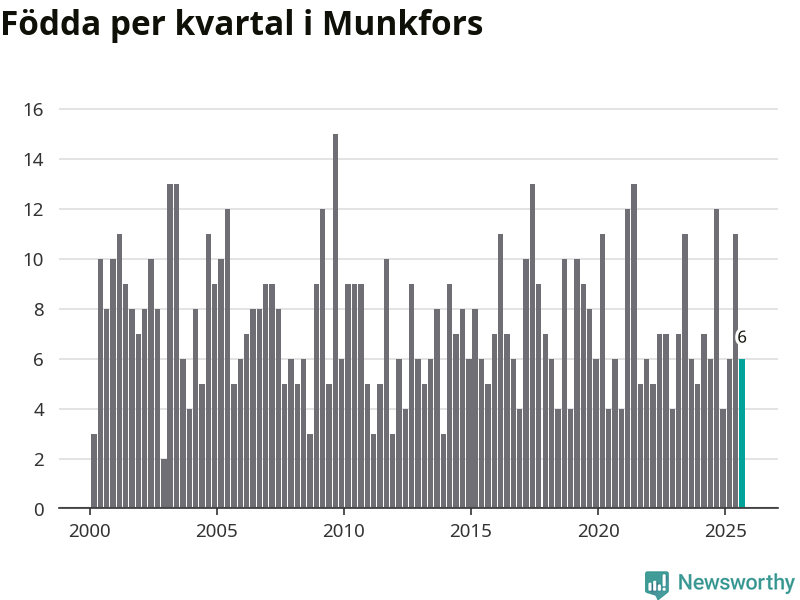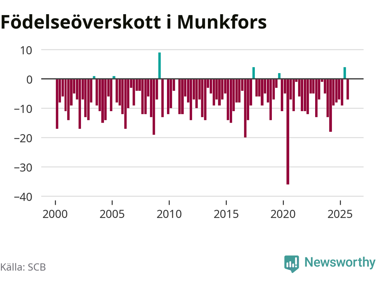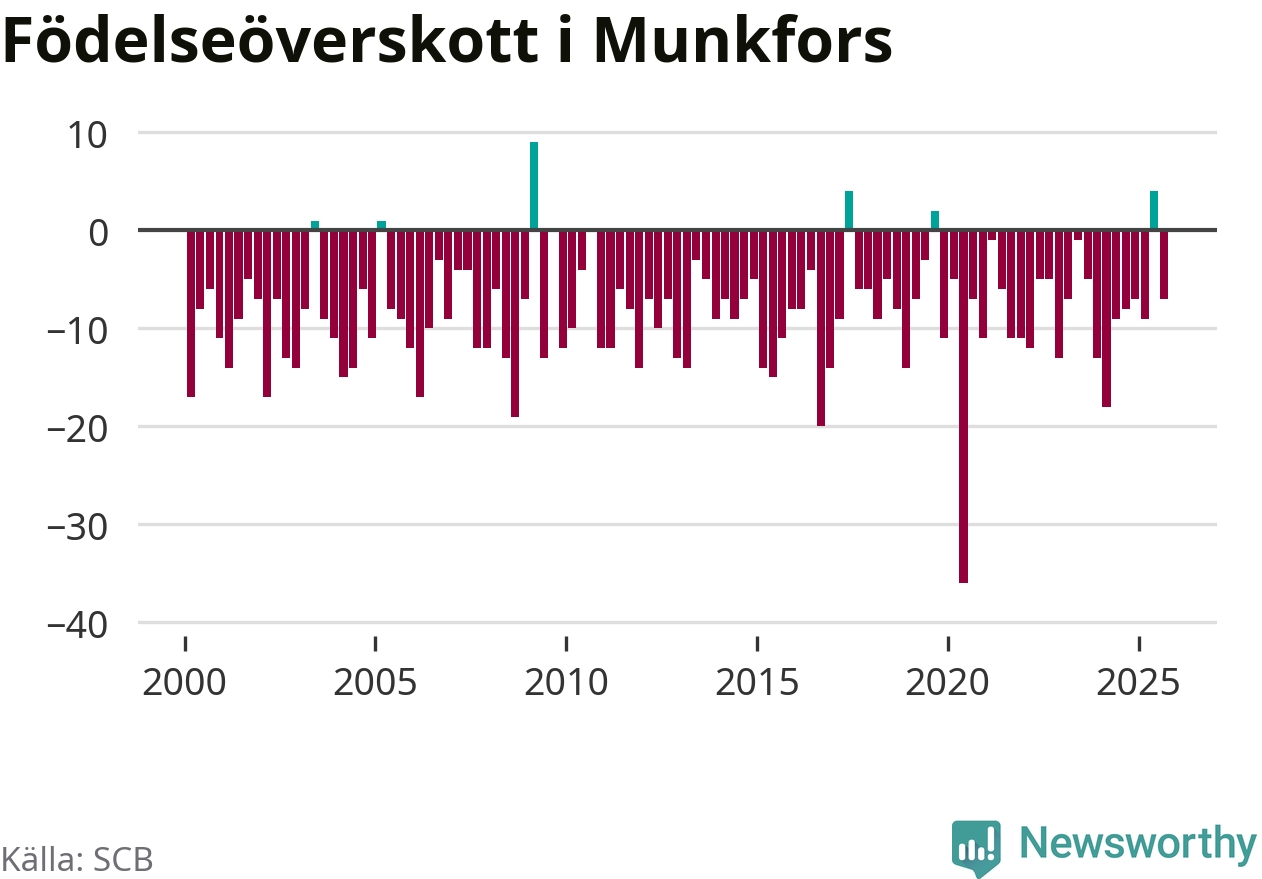 Enligt SCB:s siffror föddes sex barn i Munkfors under det senaste kvartalet. Samtidigt avled 13 personer. Skillnaden mellan antal födda och döda är så liten att det inte går att säga om det beror på något annat än SCB:s röjandeskydd. Kommunen har nästan alltid haft negativt födelsenetto tidigare.