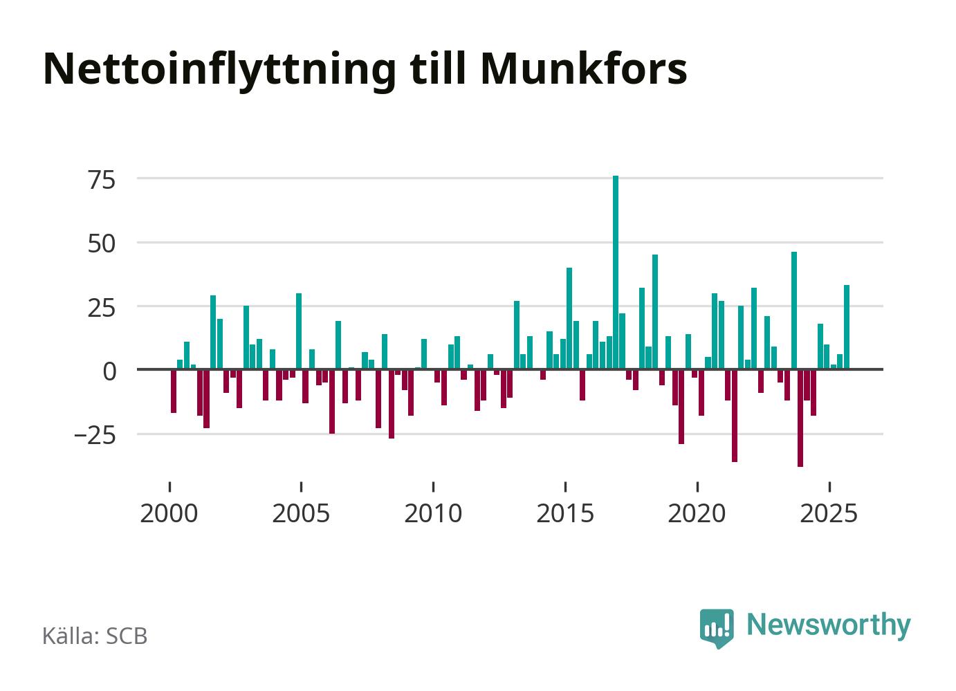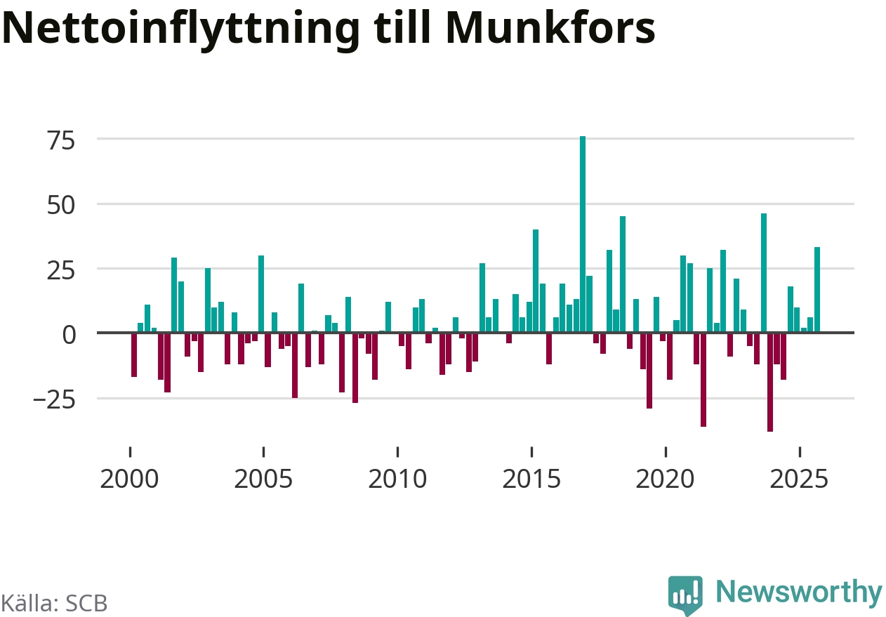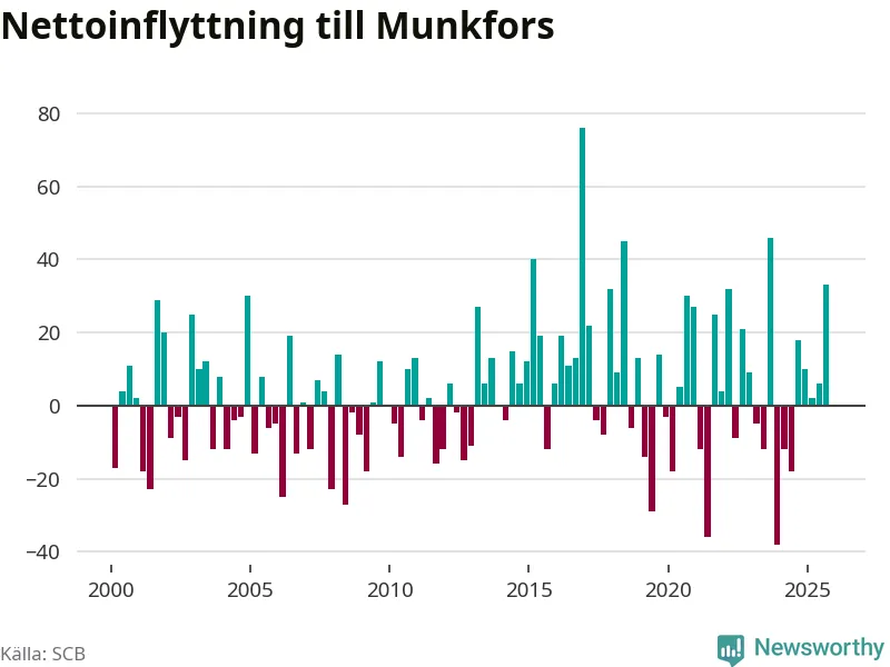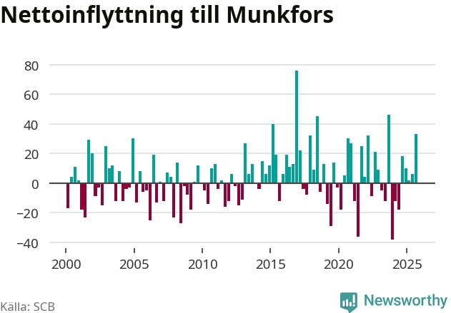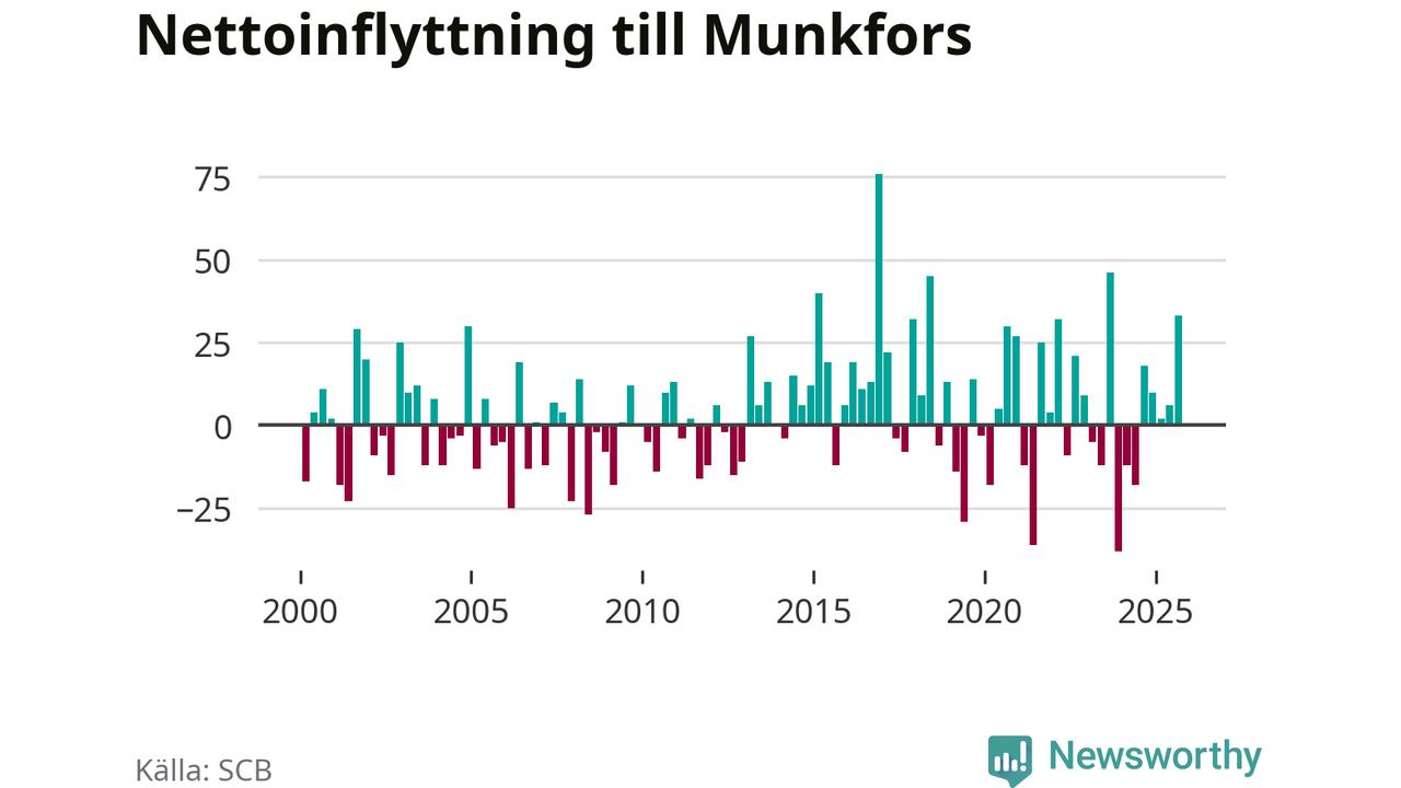 Under tredje kvartalet 2025 flyttade 82 personer till kommunen medan 49 personer flyttade därifrån. Sedan seklets början har Munkfors oftast haft ett positivt flyttnetto, inklusive det senaste kvartalet.