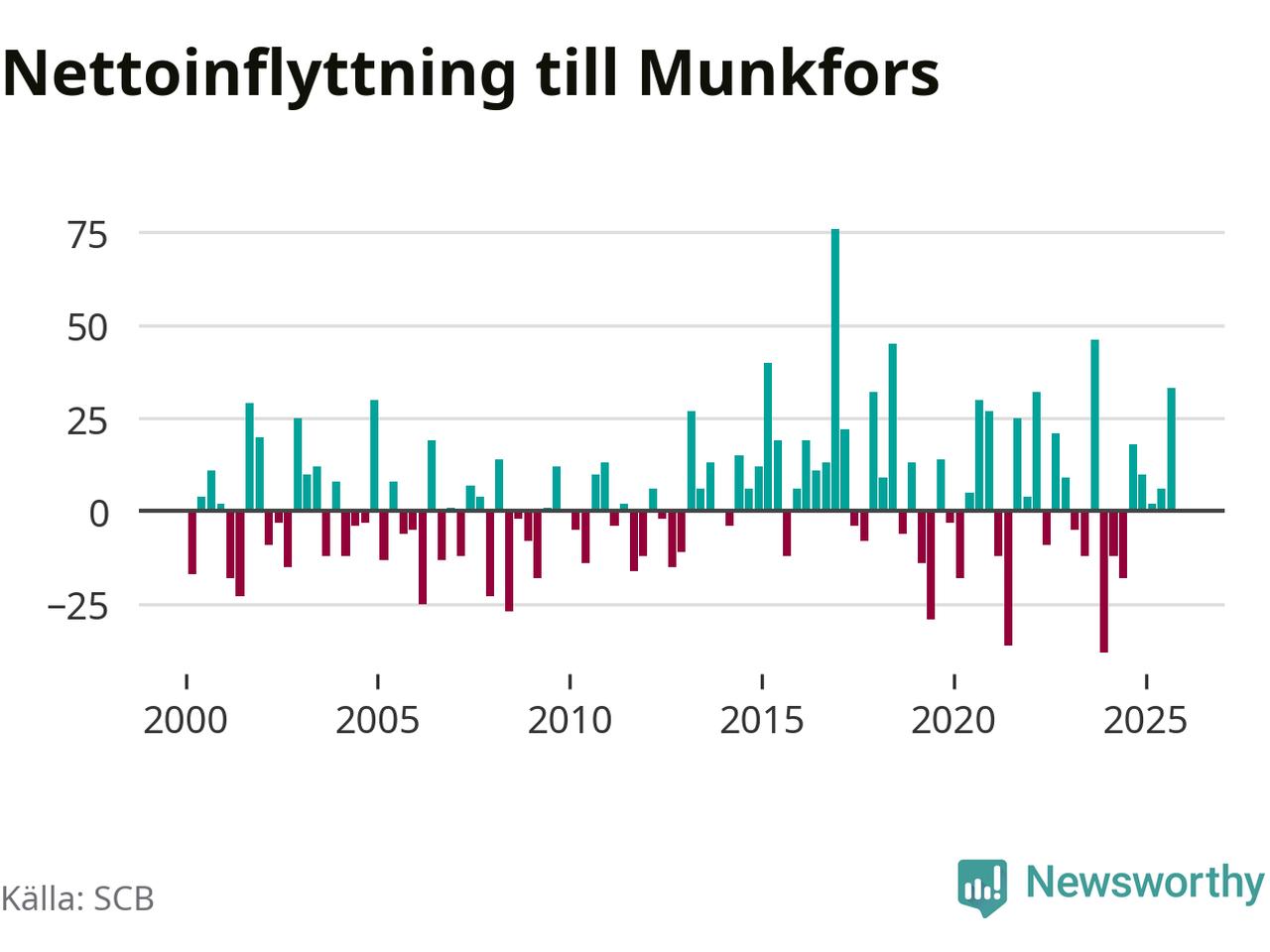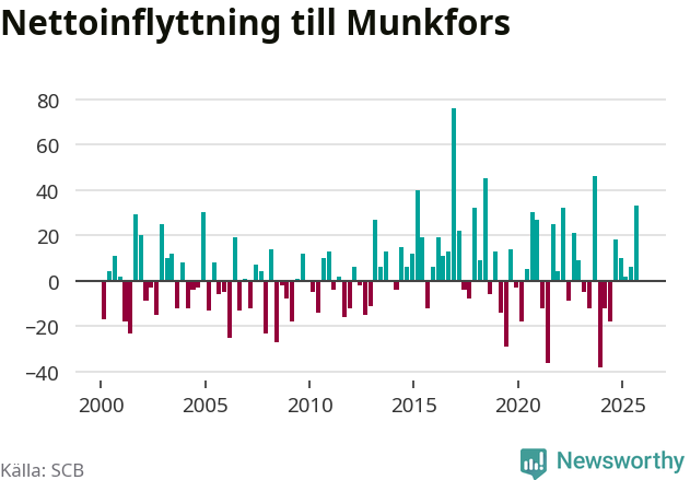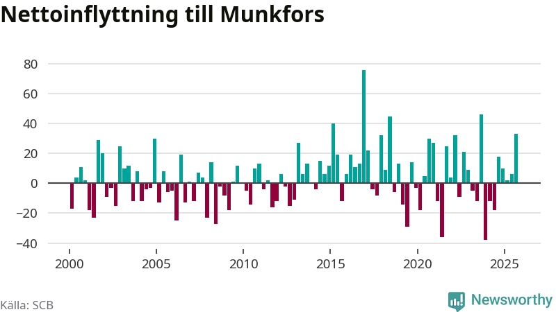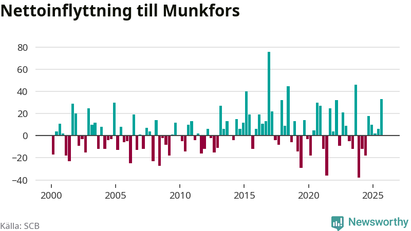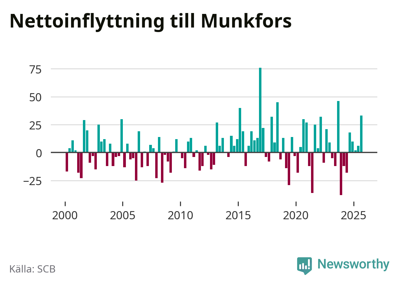 Under tredje kvartalet 2025 flyttade 82 personer till kommunen medan 49 personer flyttade därifrån. Sedan seklets början har Munkfors oftast haft ett positivt flyttnetto, inklusive det senaste kvartalet.