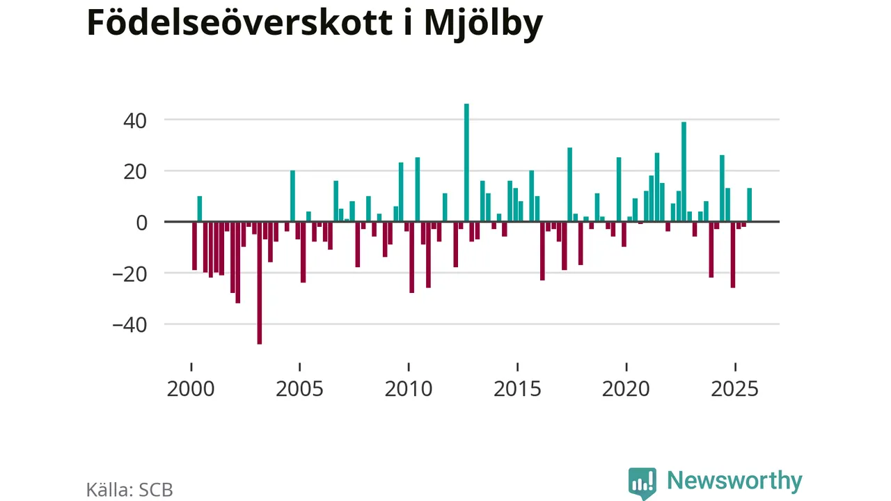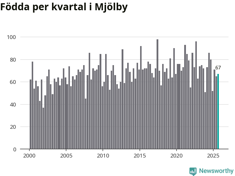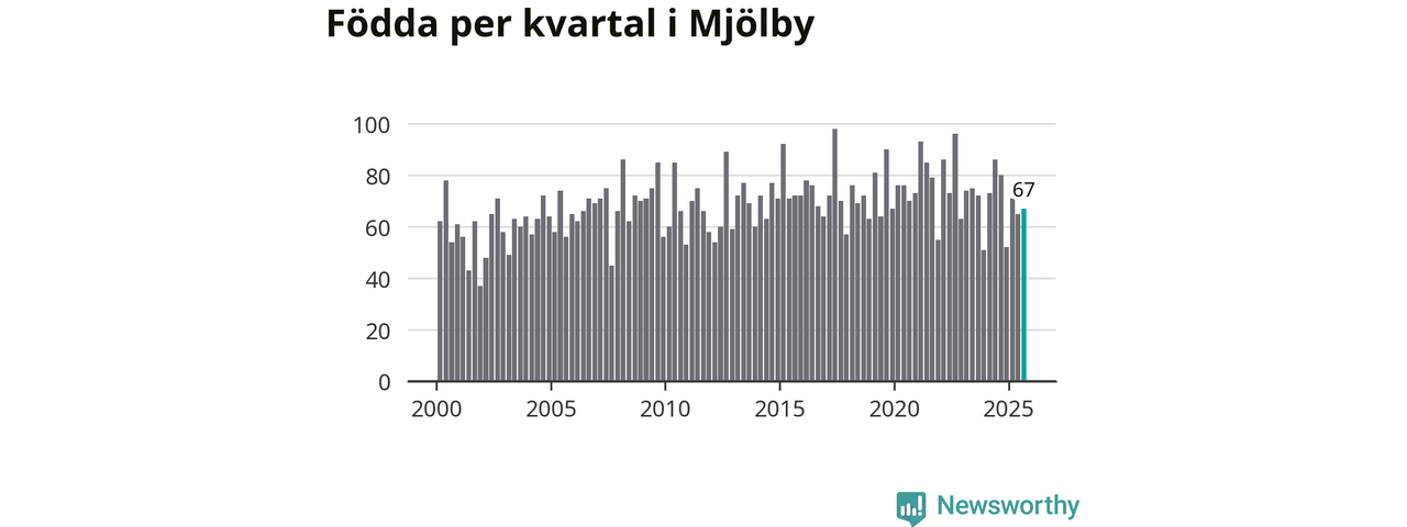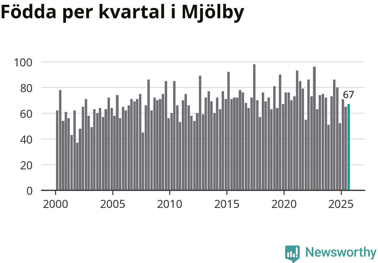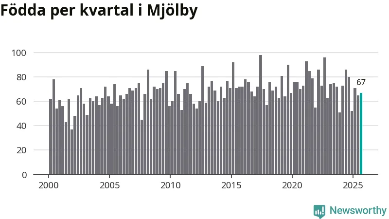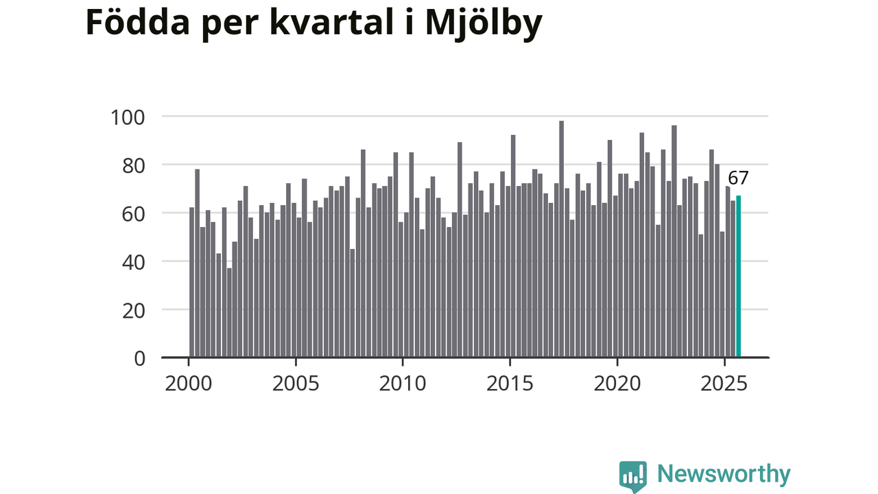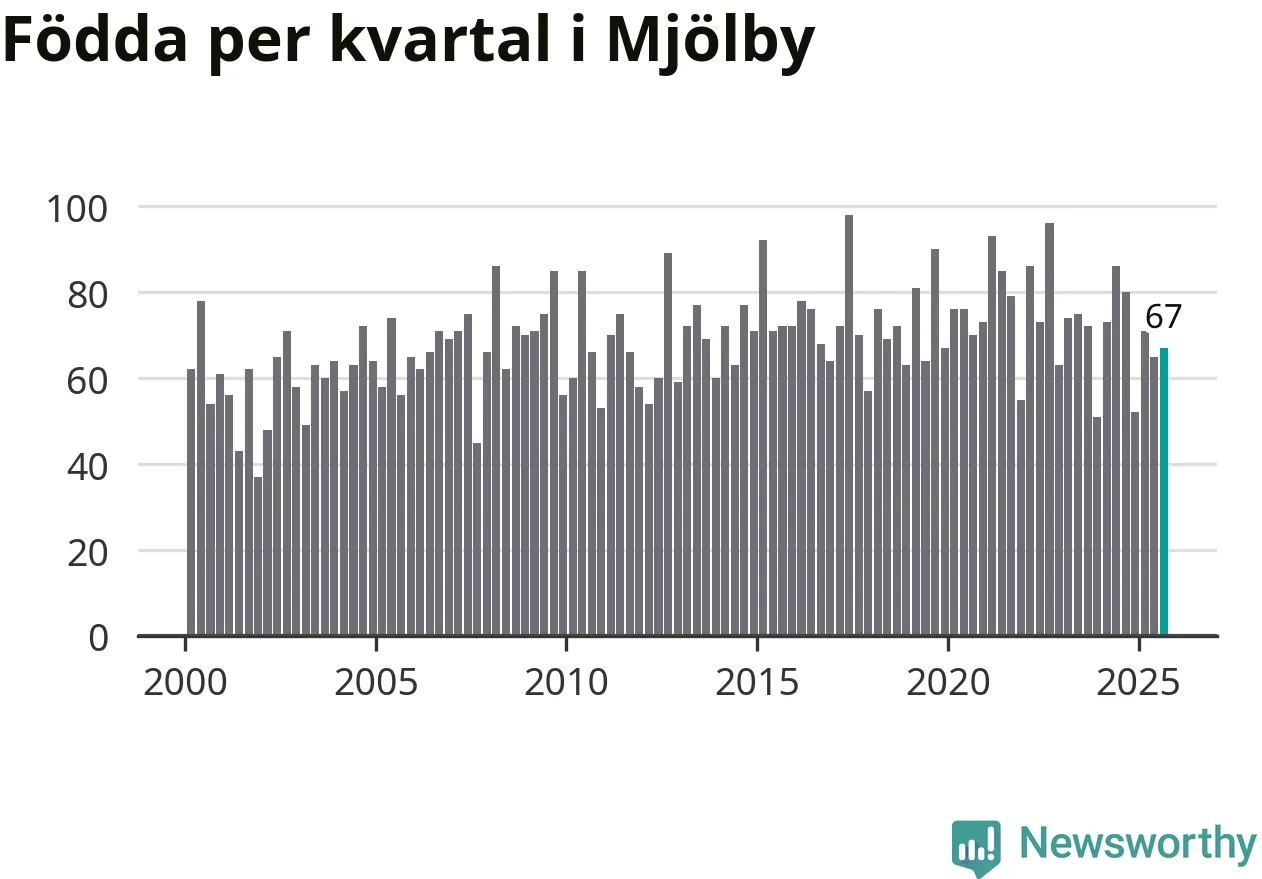 Enligt SCB:s siffror föddes 67 barn i Mjölby under det senaste kvartalet. Samtidigt avled relativt få – 54 personer. Mjölby hade alltså ett positivt födelsenetto, vilket kommunen historiskt sett oftast har haft.