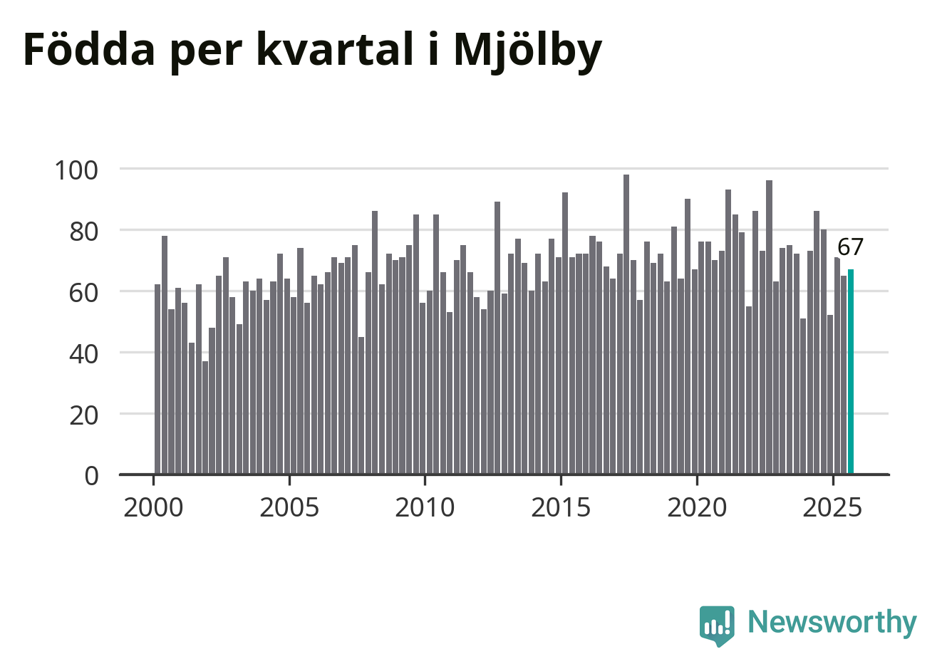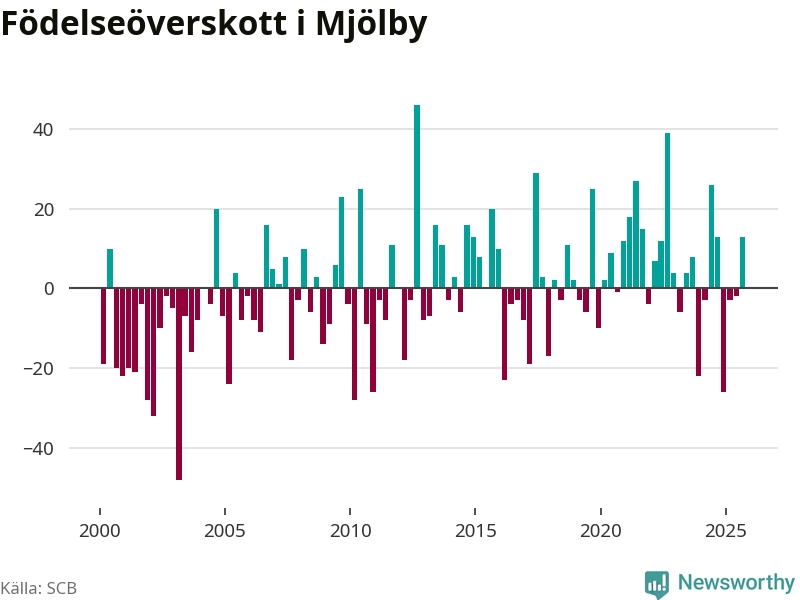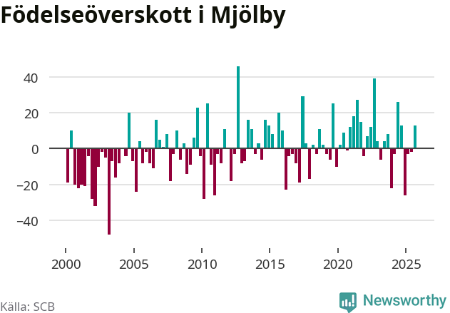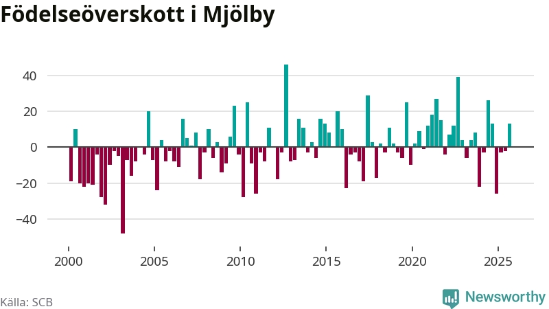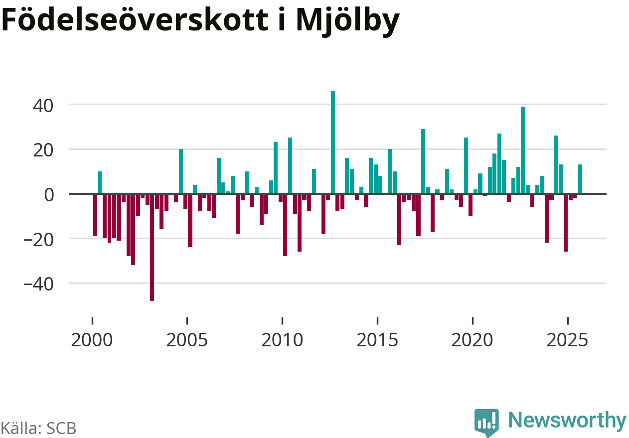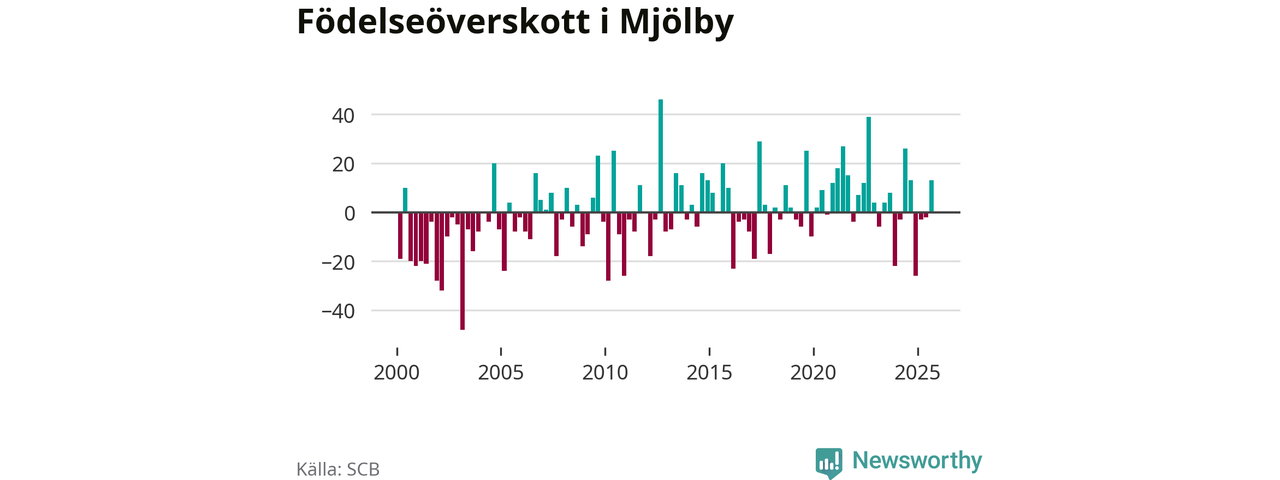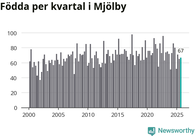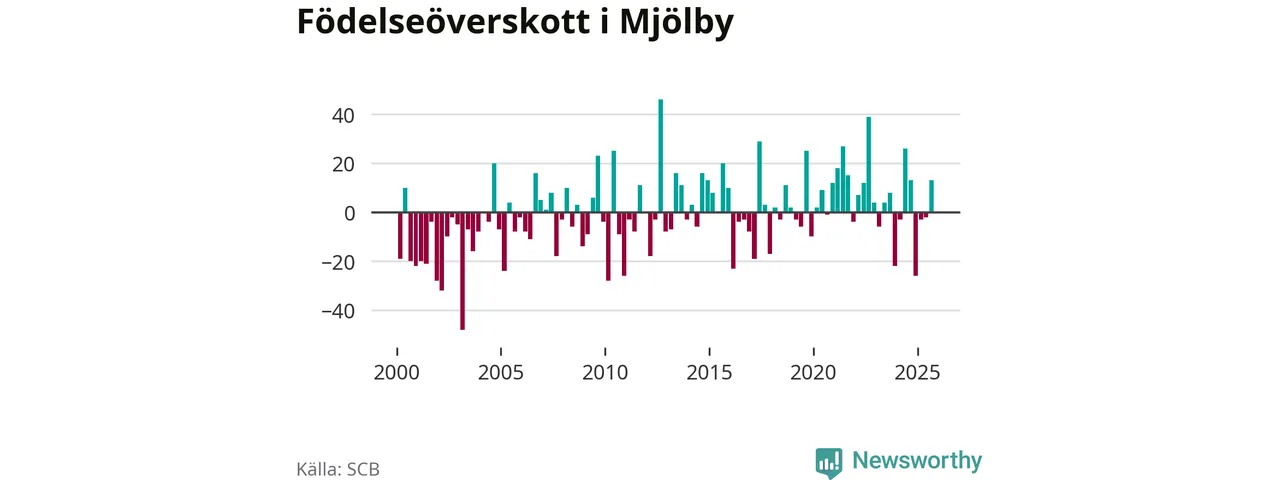 Enligt SCB:s siffror föddes 67 barn i Mjölby under det senaste kvartalet. Samtidigt avled relativt få – 54 personer. Mjölby hade alltså ett positivt födelsenetto, vilket kommunen historiskt sett oftast har haft.