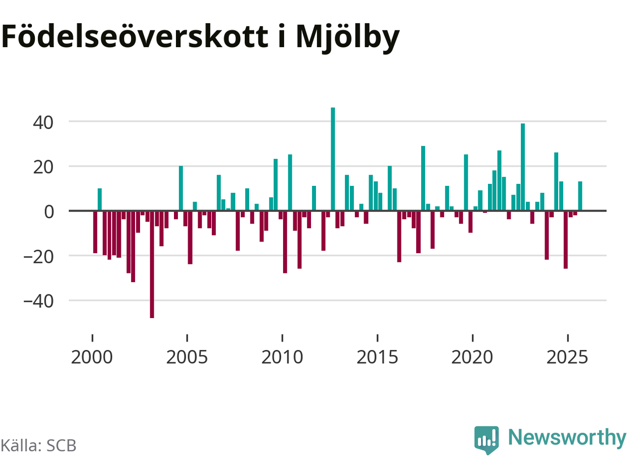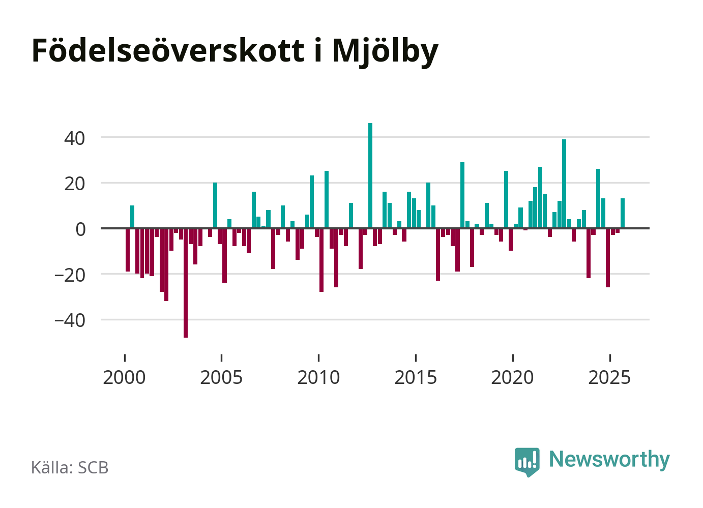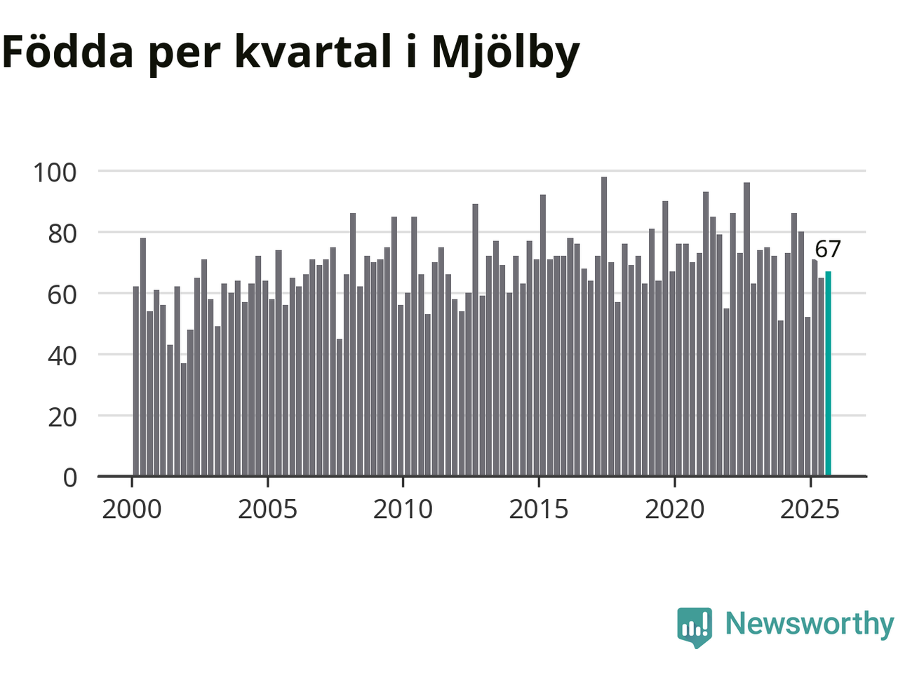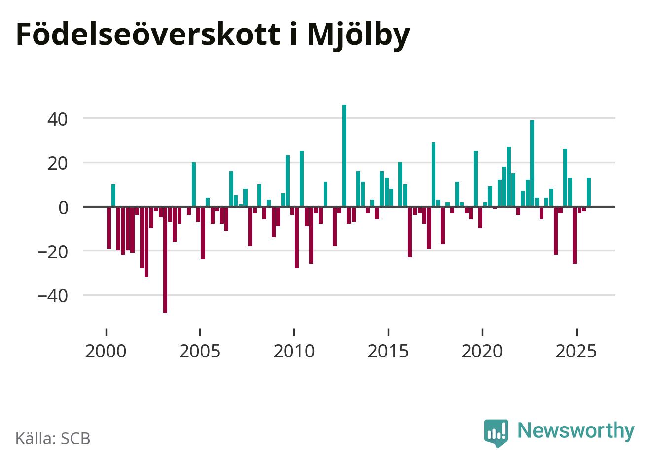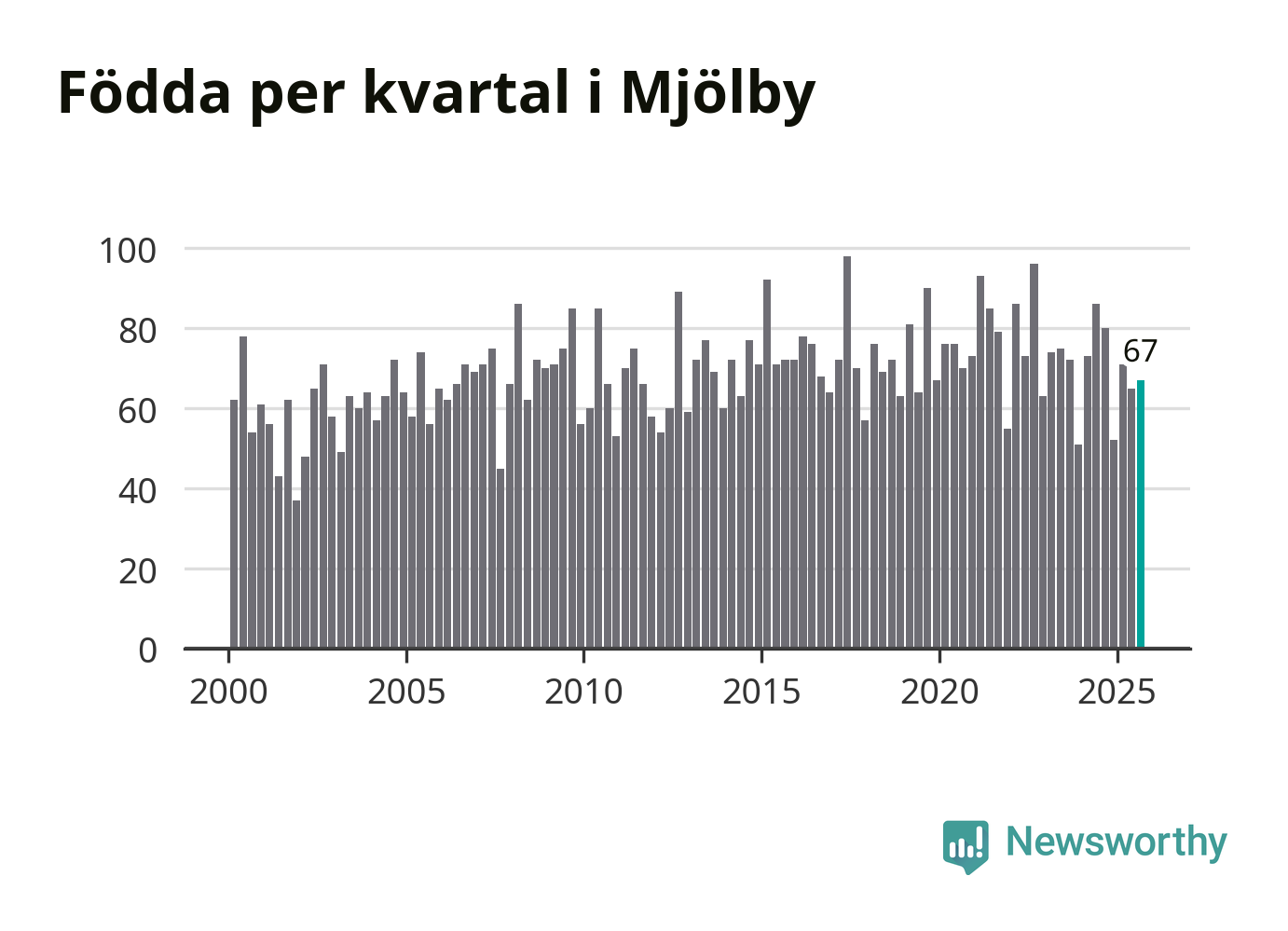 Enligt SCB:s siffror föddes 67 barn i Mjölby under det senaste kvartalet. Samtidigt avled relativt få – 54 personer. Mjölby hade alltså ett positivt födelsenetto, vilket kommunen historiskt sett oftast har haft.