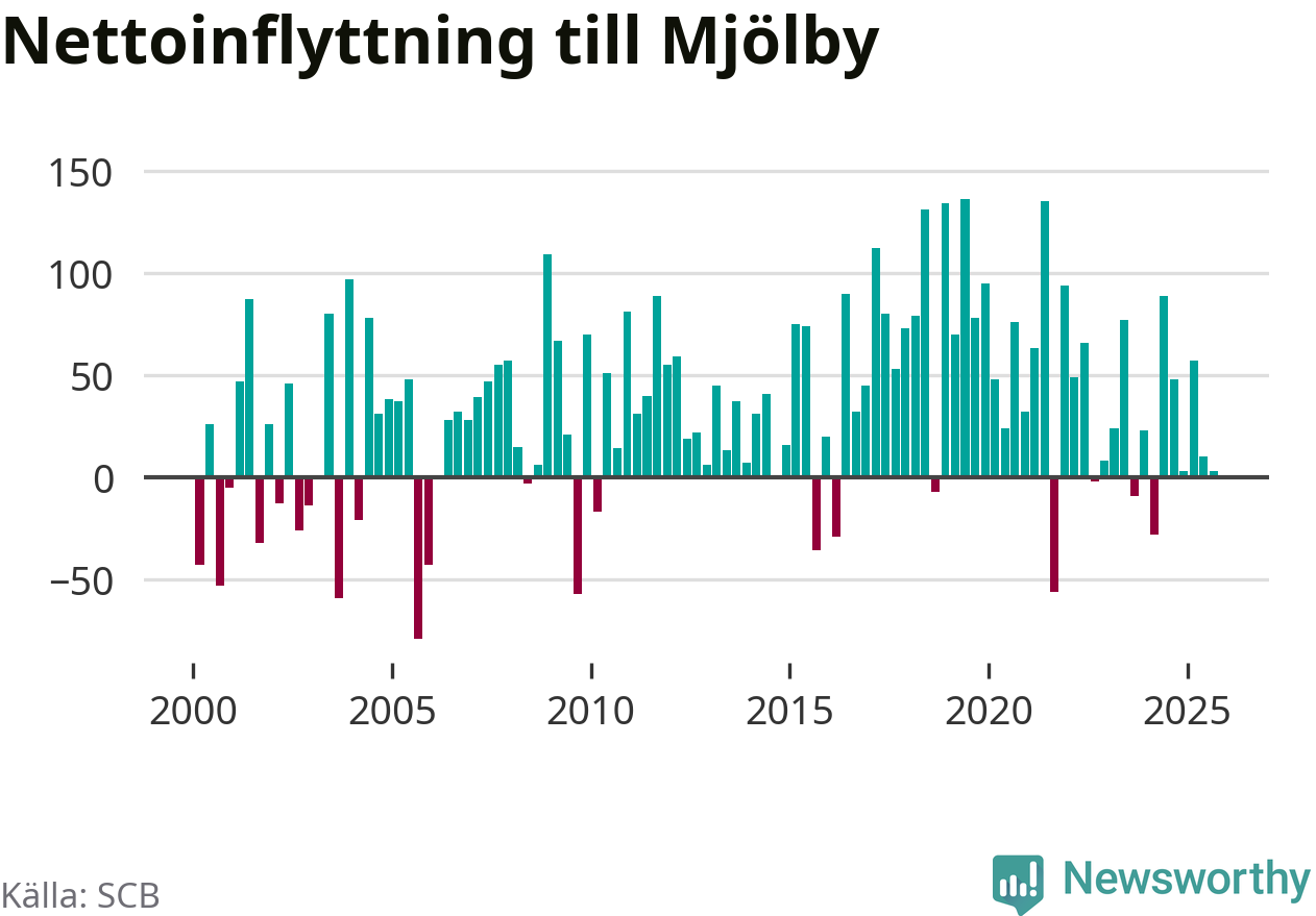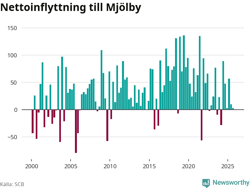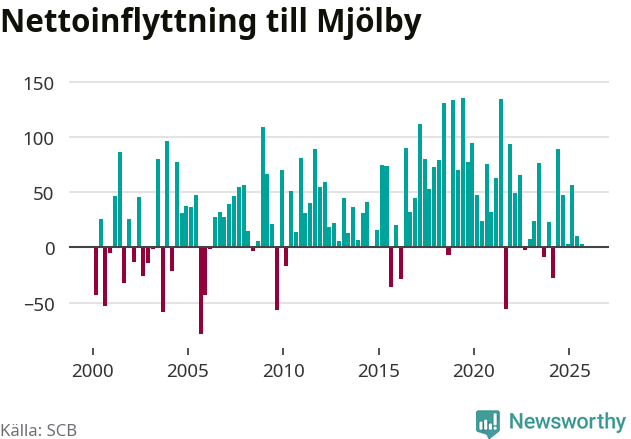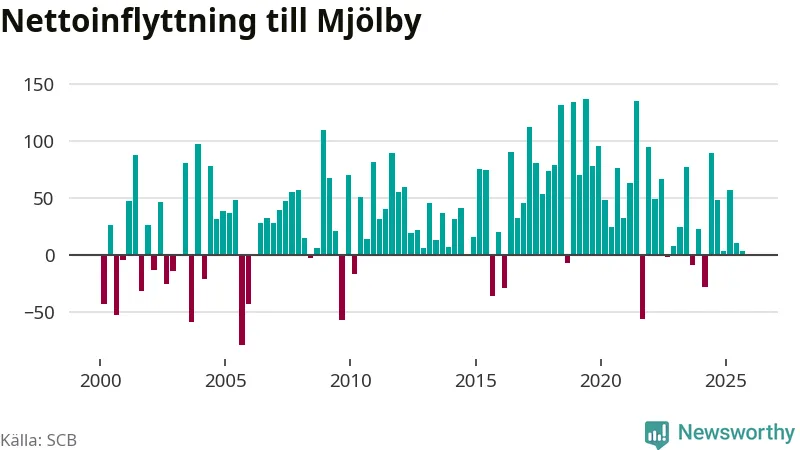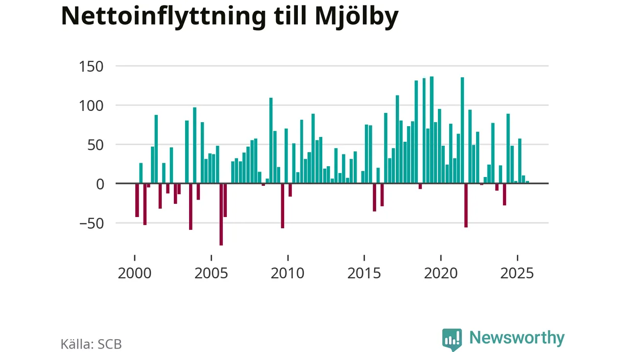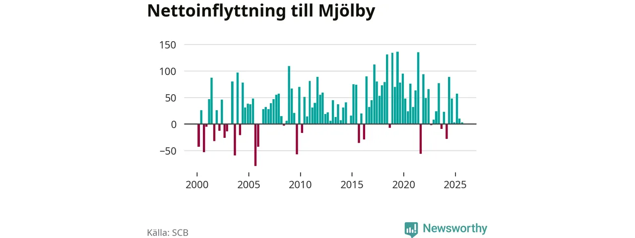 Under tredje kvartalet 2025 flyttade 386 personer till kommunen medan 383 personer flyttade därifrån. Det är historiskt sett en stor utflyttning under ett kvartal. Skillnaden mellan antalet in- och utflyttade är så liten att den lika gärna kan bero på SCB:s slumpmässiga brus. Sedan seklets början har Mjölby oftast haft ett positivt flyttnetto.