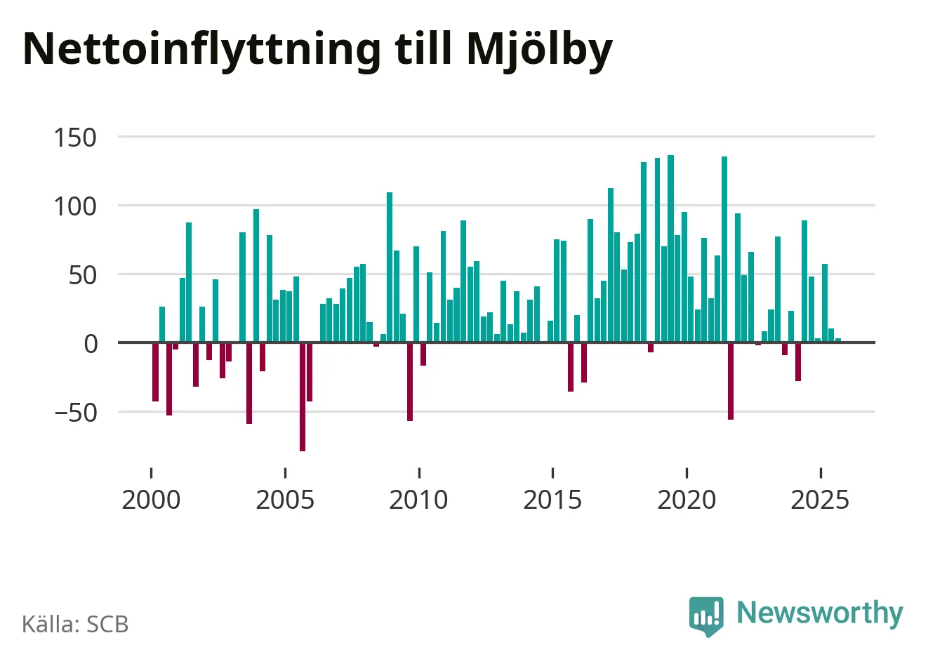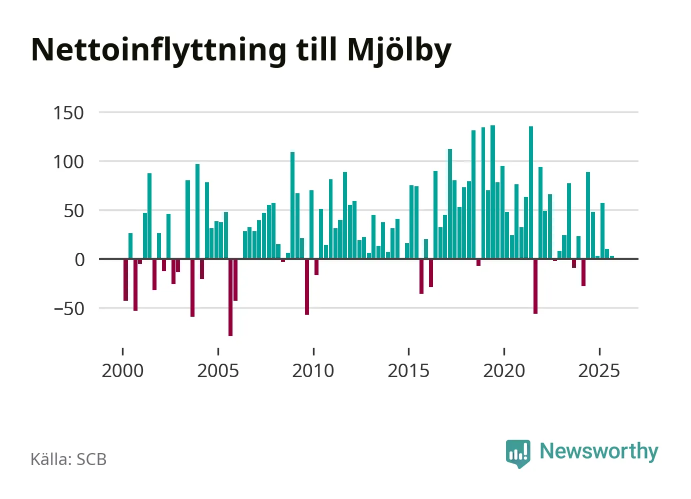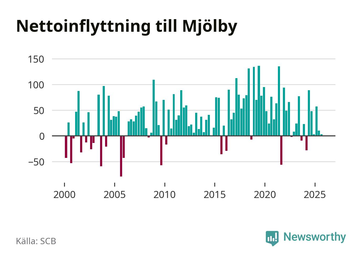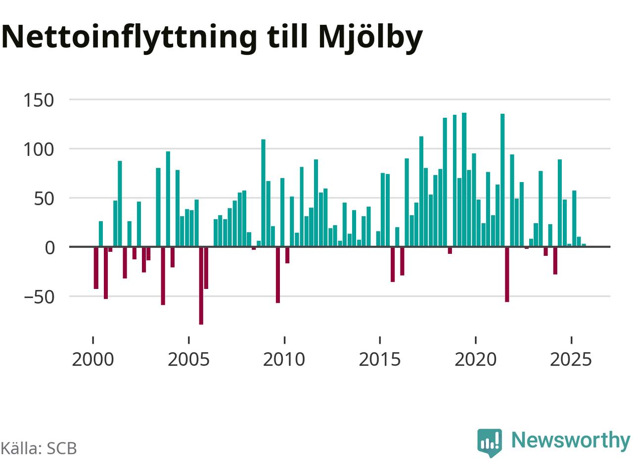 Under tredje kvartalet 2025 flyttade 386 personer till kommunen medan 383 personer flyttade därifrån. Det är historiskt sett en stor utflyttning under ett kvartal. Skillnaden mellan antalet in- och utflyttade är så liten att den lika gärna kan bero på SCB:s slumpmässiga brus. Sedan seklets början har Mjölby oftast haft ett positivt flyttnetto.