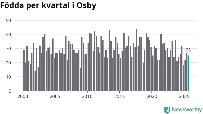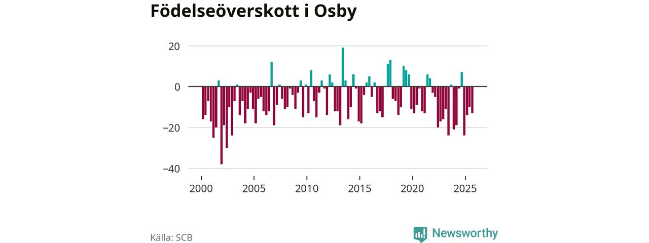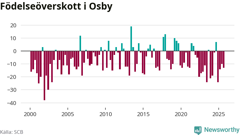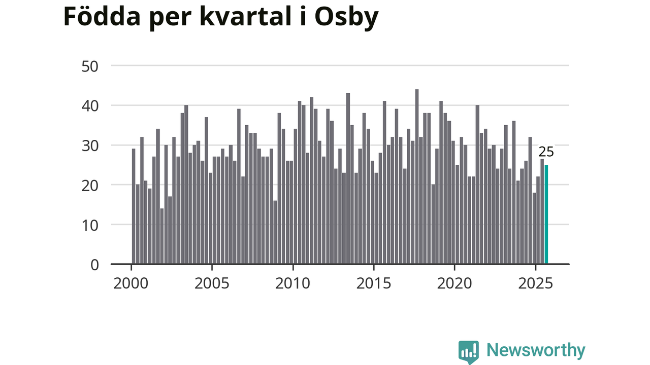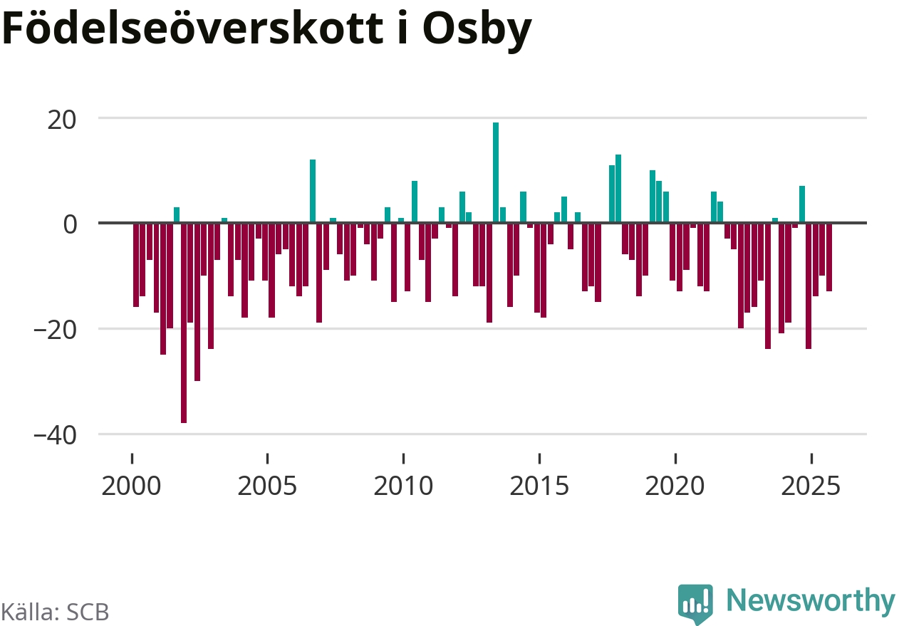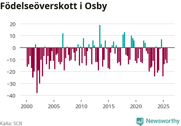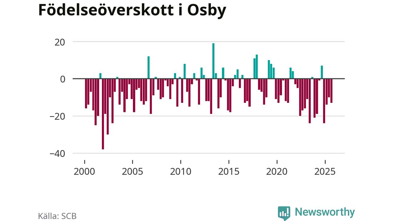 Enligt SCB:s siffror föddes 25 barn i Osby under det senaste kvartalet. Samtidigt avled 38 personer. Osby hade alltså ett negativt födelsenetto, vilket kommunen historiskt sett oftast har haft.