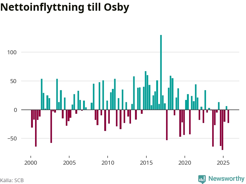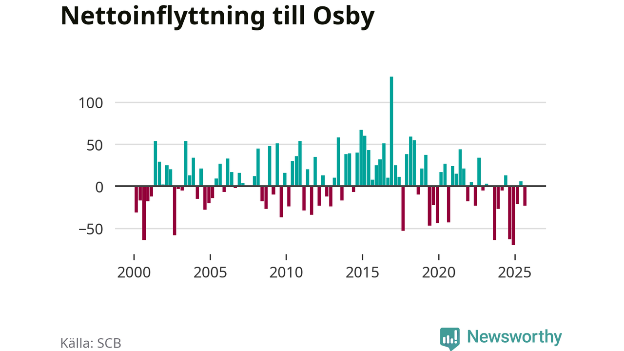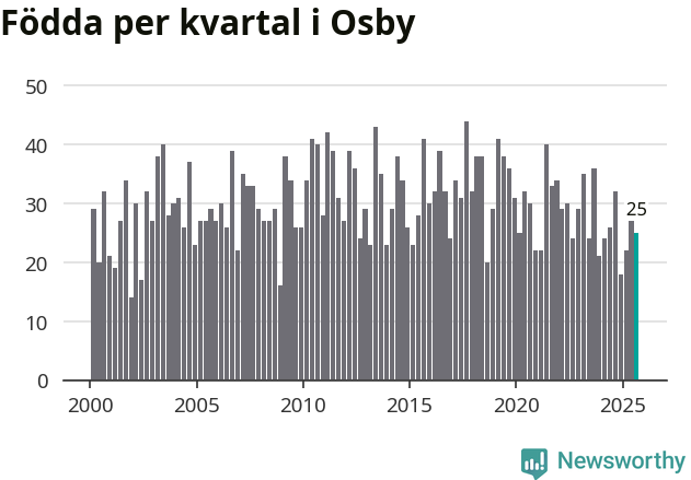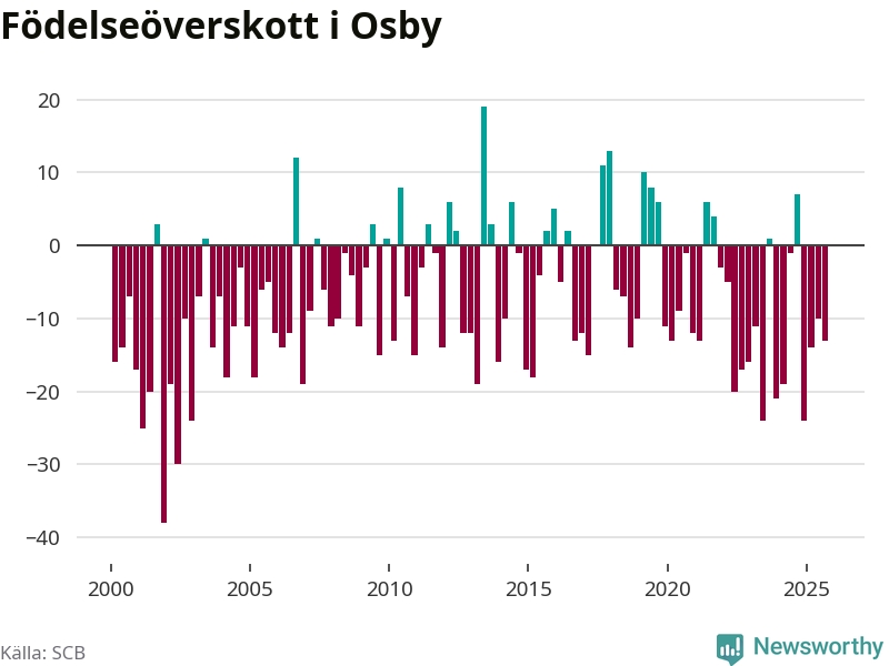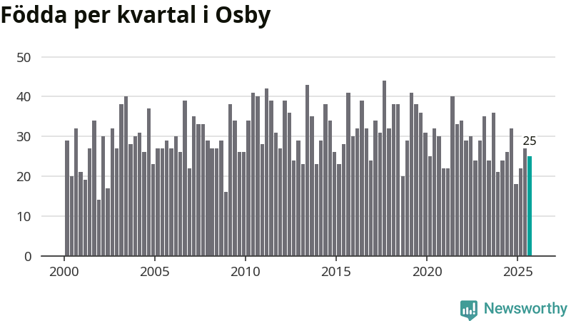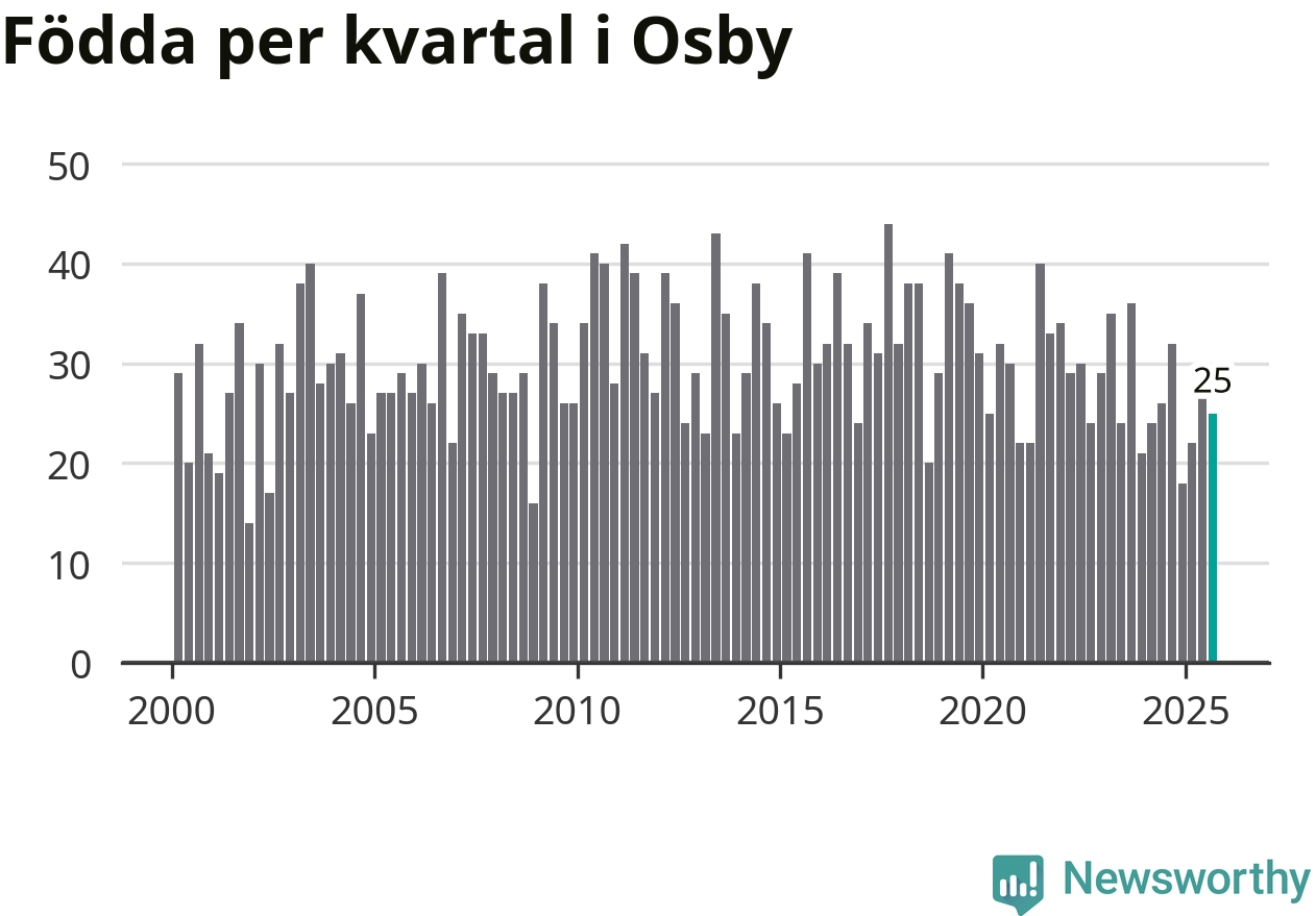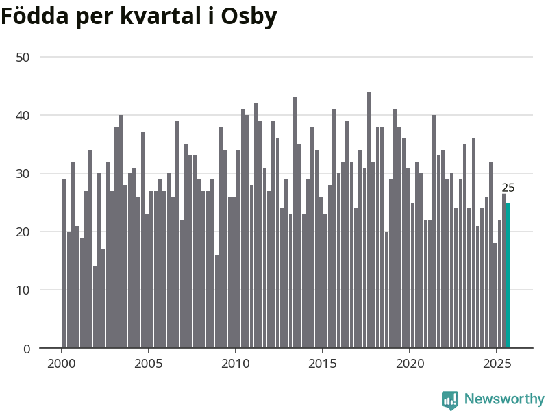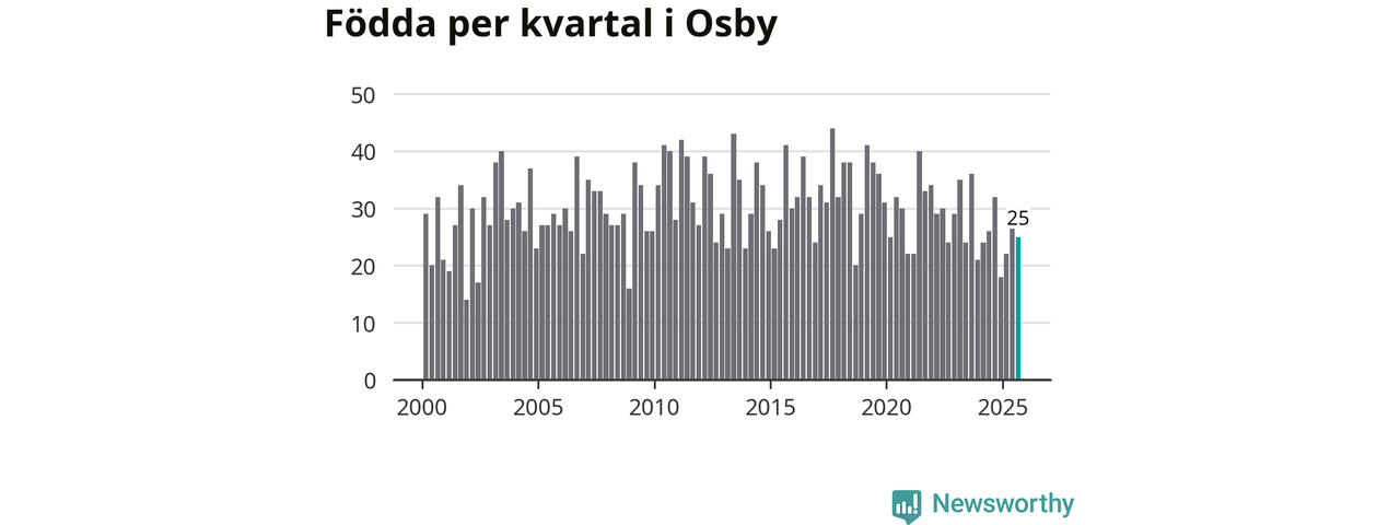 Enligt SCB:s siffror föddes 25 barn i Osby under det senaste kvartalet. Samtidigt avled 38 personer. Osby hade alltså ett negativt födelsenetto, vilket kommunen historiskt sett oftast har haft.