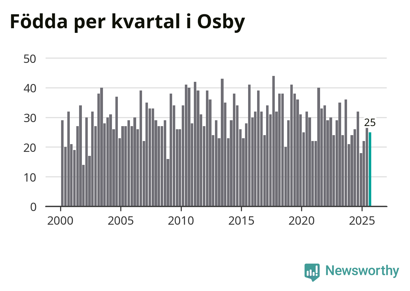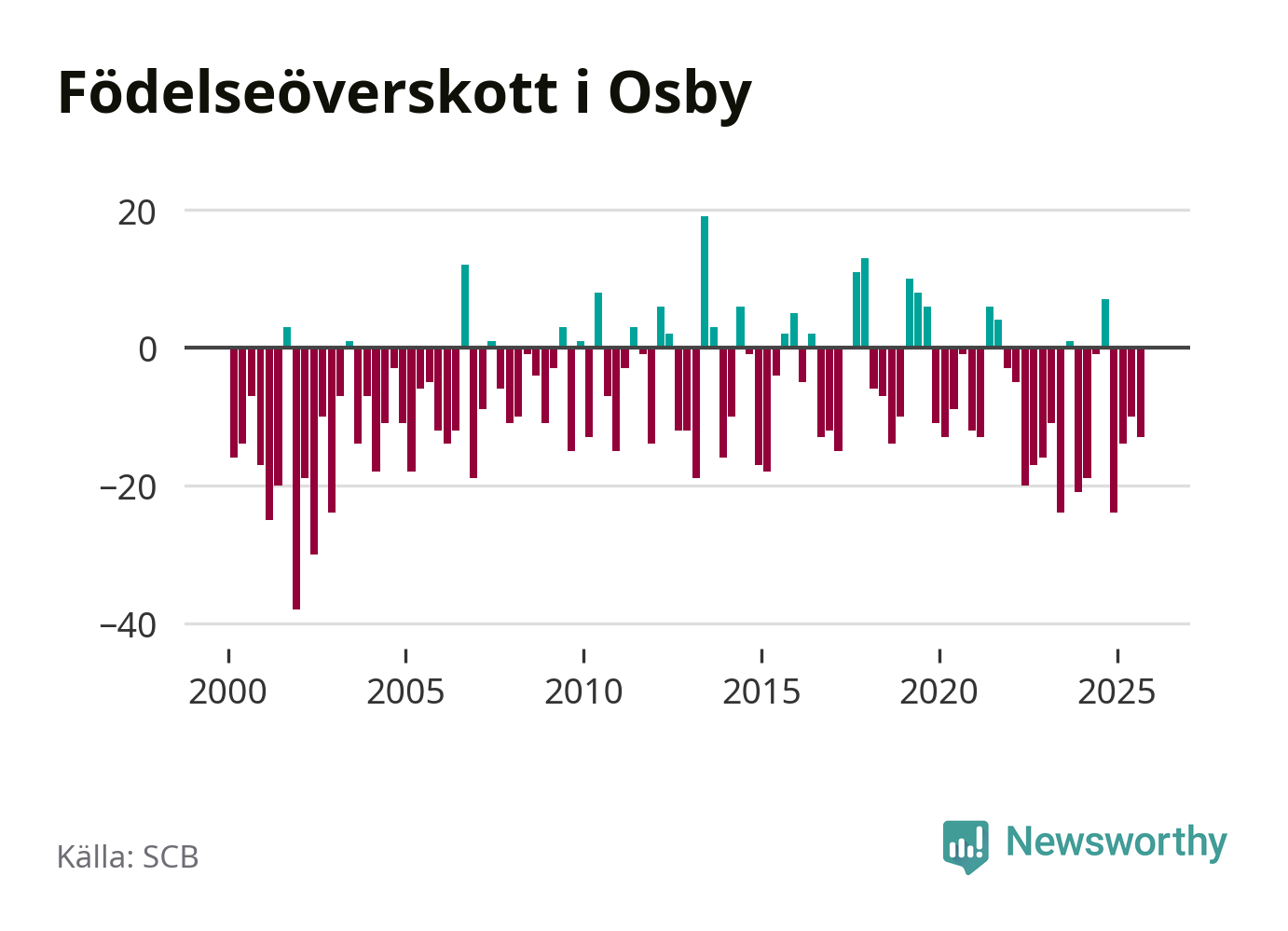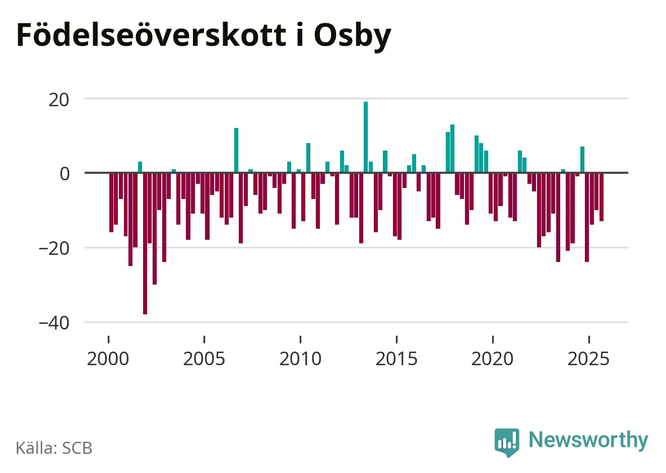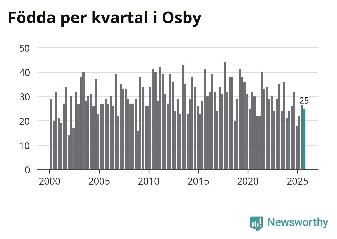 Enligt SCB:s siffror föddes 25 barn i Osby under det senaste kvartalet. Samtidigt avled 38 personer. Osby hade alltså ett negativt födelsenetto, vilket kommunen historiskt sett oftast har haft.