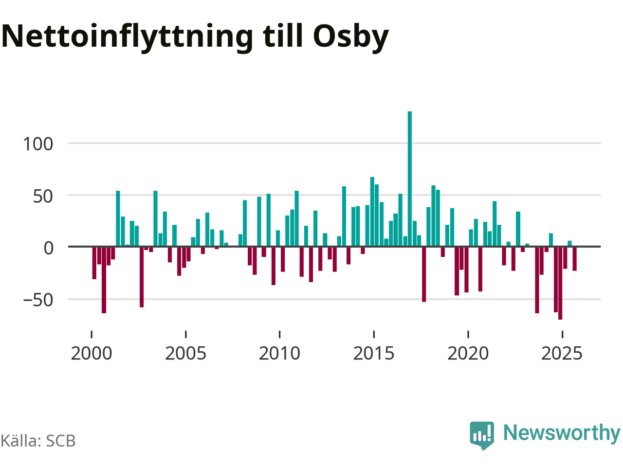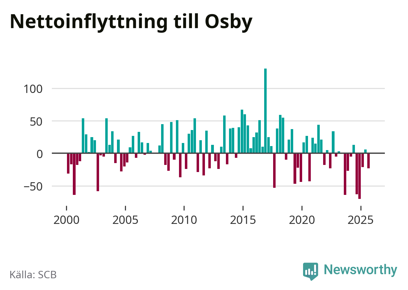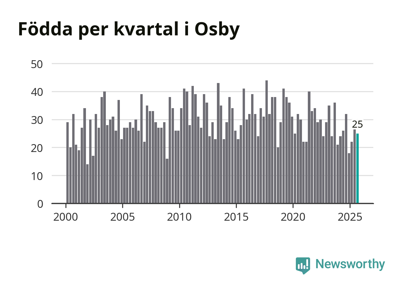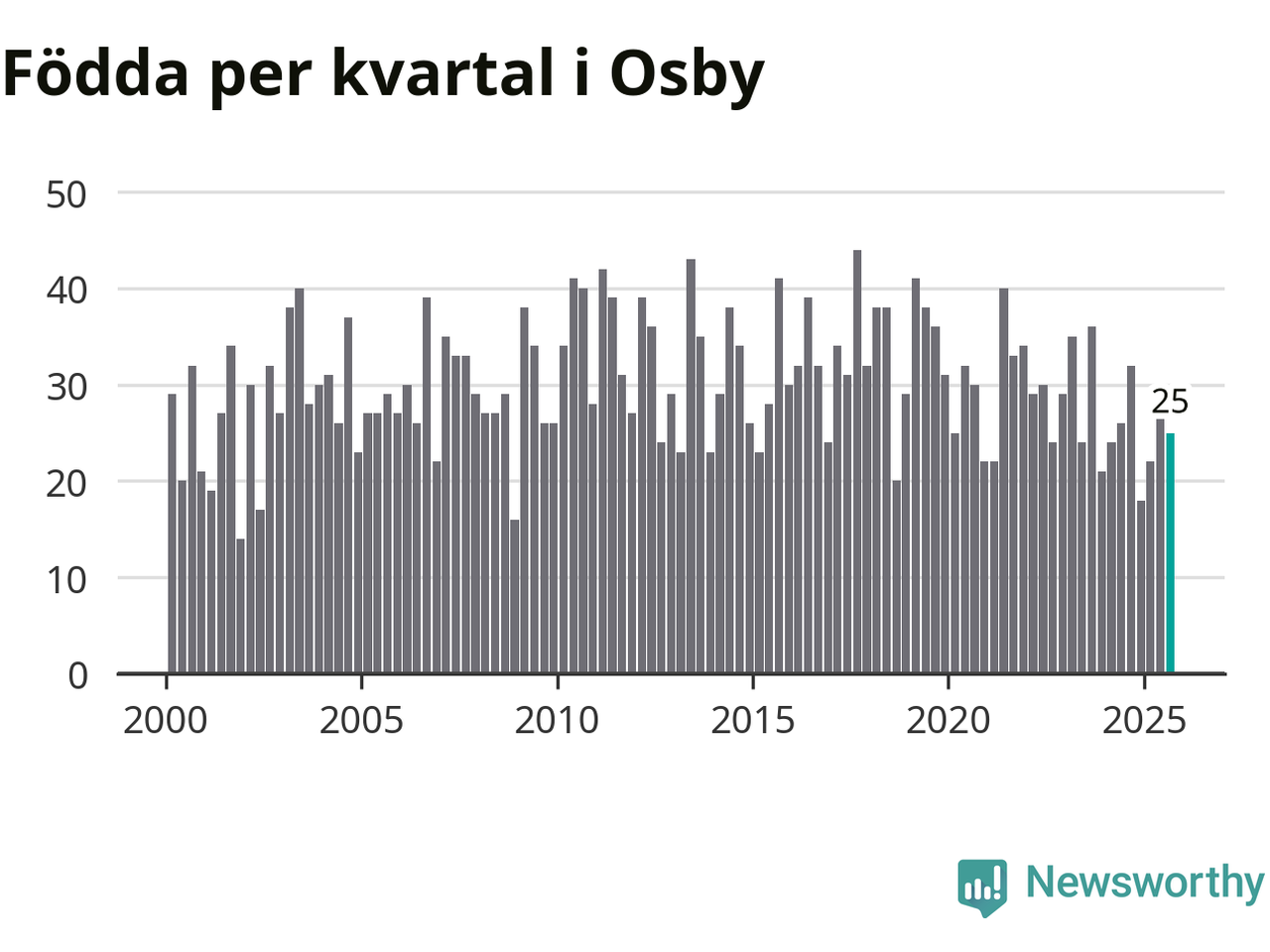 Enligt SCB:s siffror föddes 25 barn i Osby under det senaste kvartalet. Samtidigt avled 38 personer. Osby hade alltså ett negativt födelsenetto, vilket kommunen historiskt sett oftast har haft.