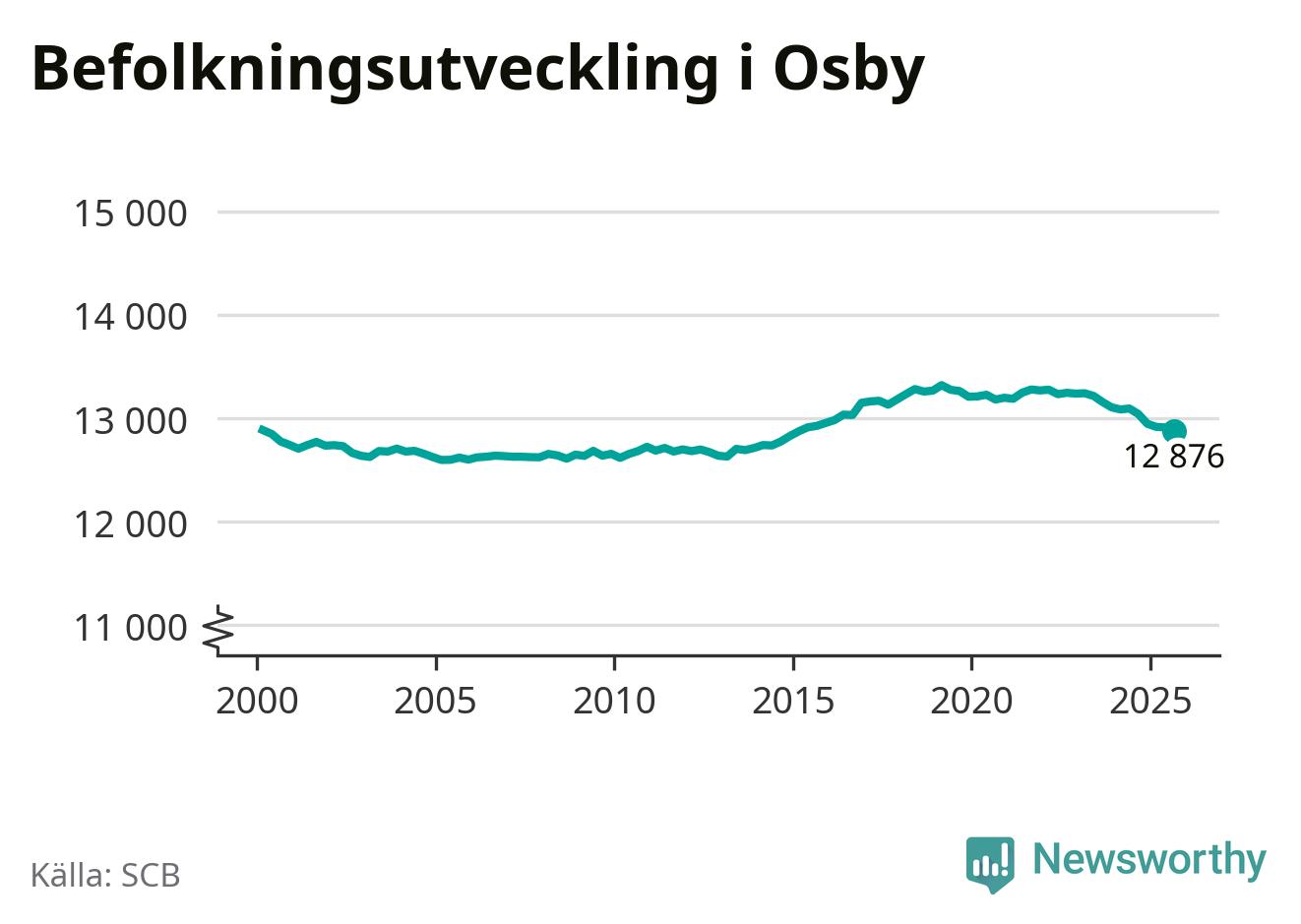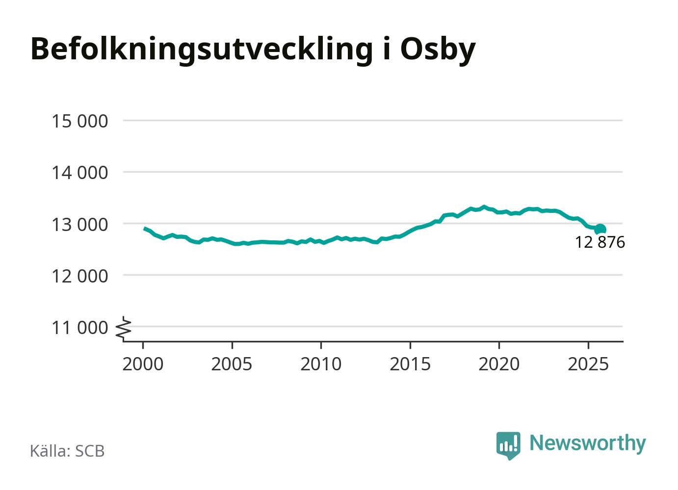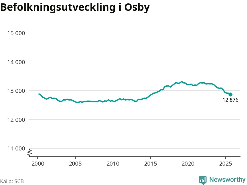 Jämfört med för ett år sedan har befolkningen i Osby minskat med knappt 170 personer – vilket motsvarar en nedgång på 1,3 procent. Sedan millennieskiftet har folkmängden minskat med 10 personer.