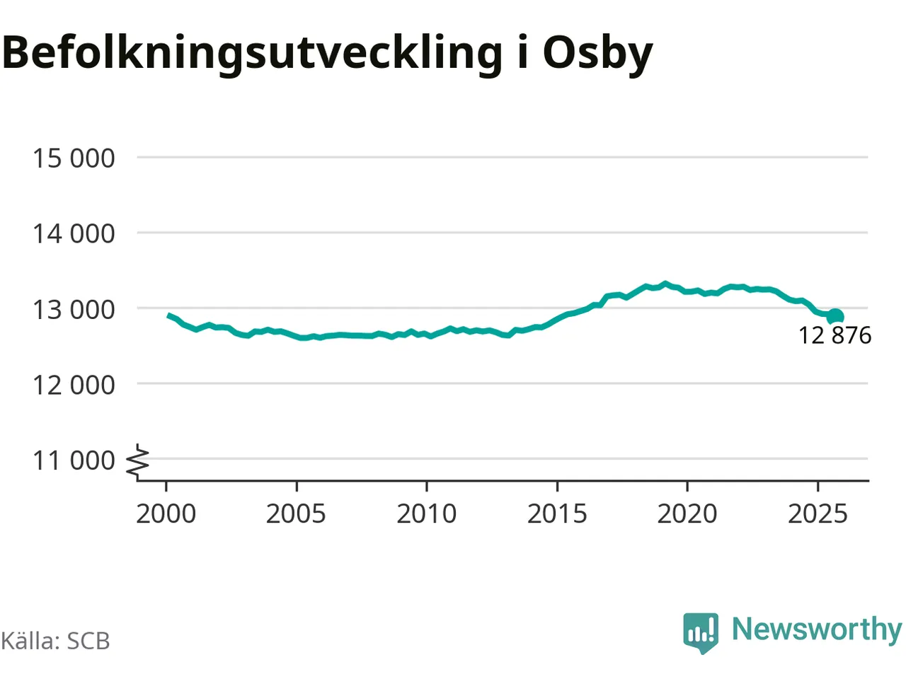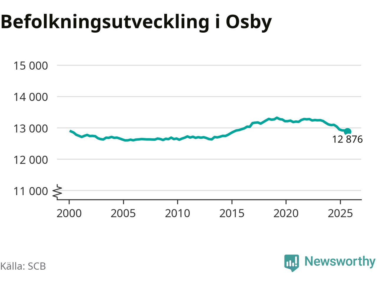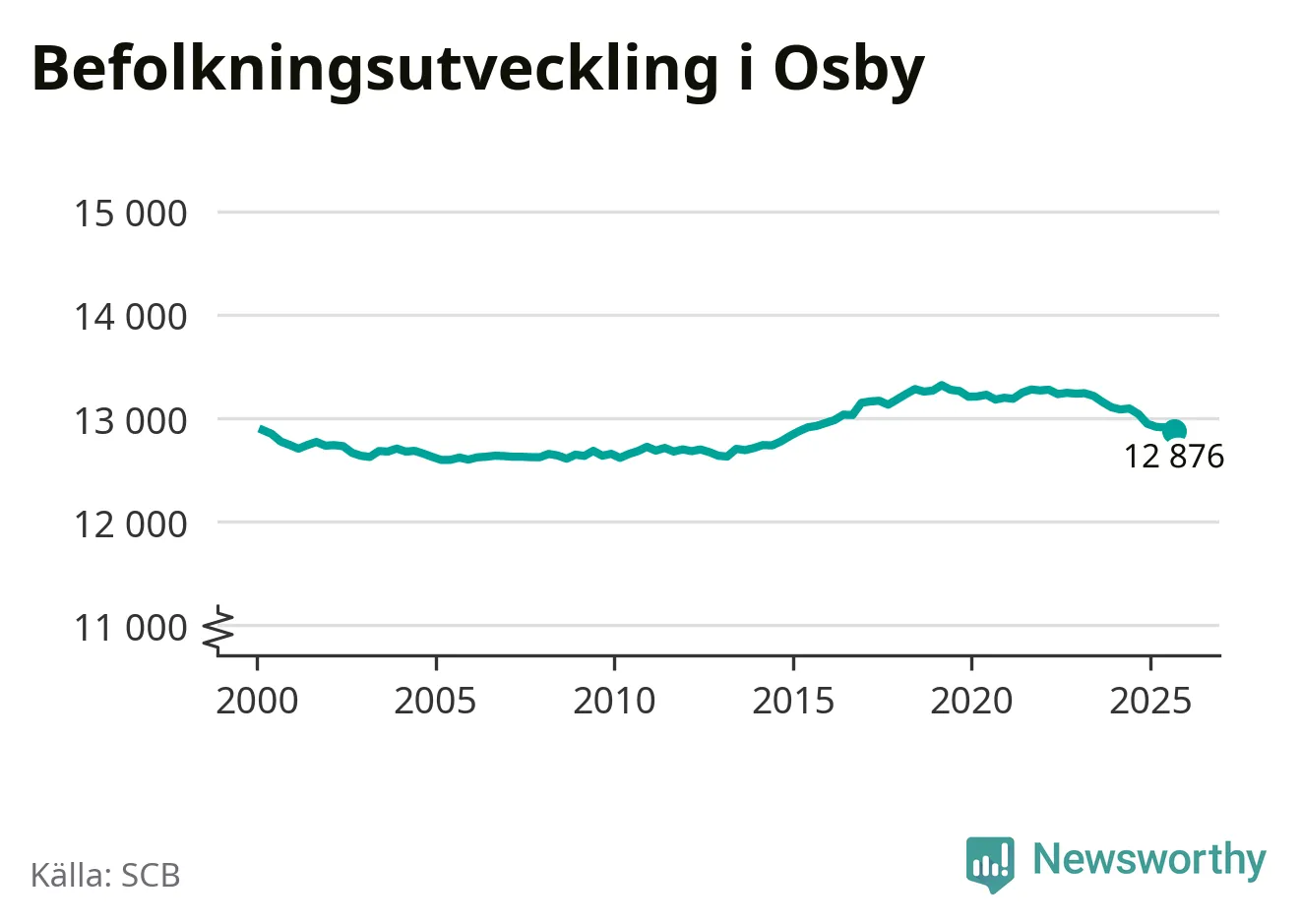 Jämfört med för ett år sedan har befolkningen i Osby minskat med knappt 170 personer – vilket motsvarar en nedgång på 1,3 procent. Sedan millennieskiftet har folkmängden minskat med 10 personer.