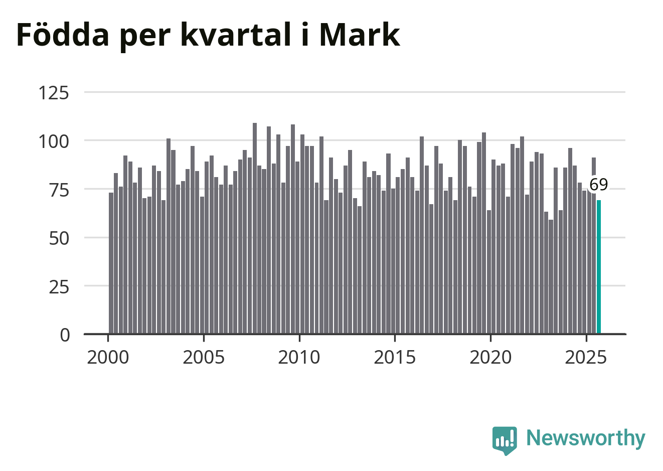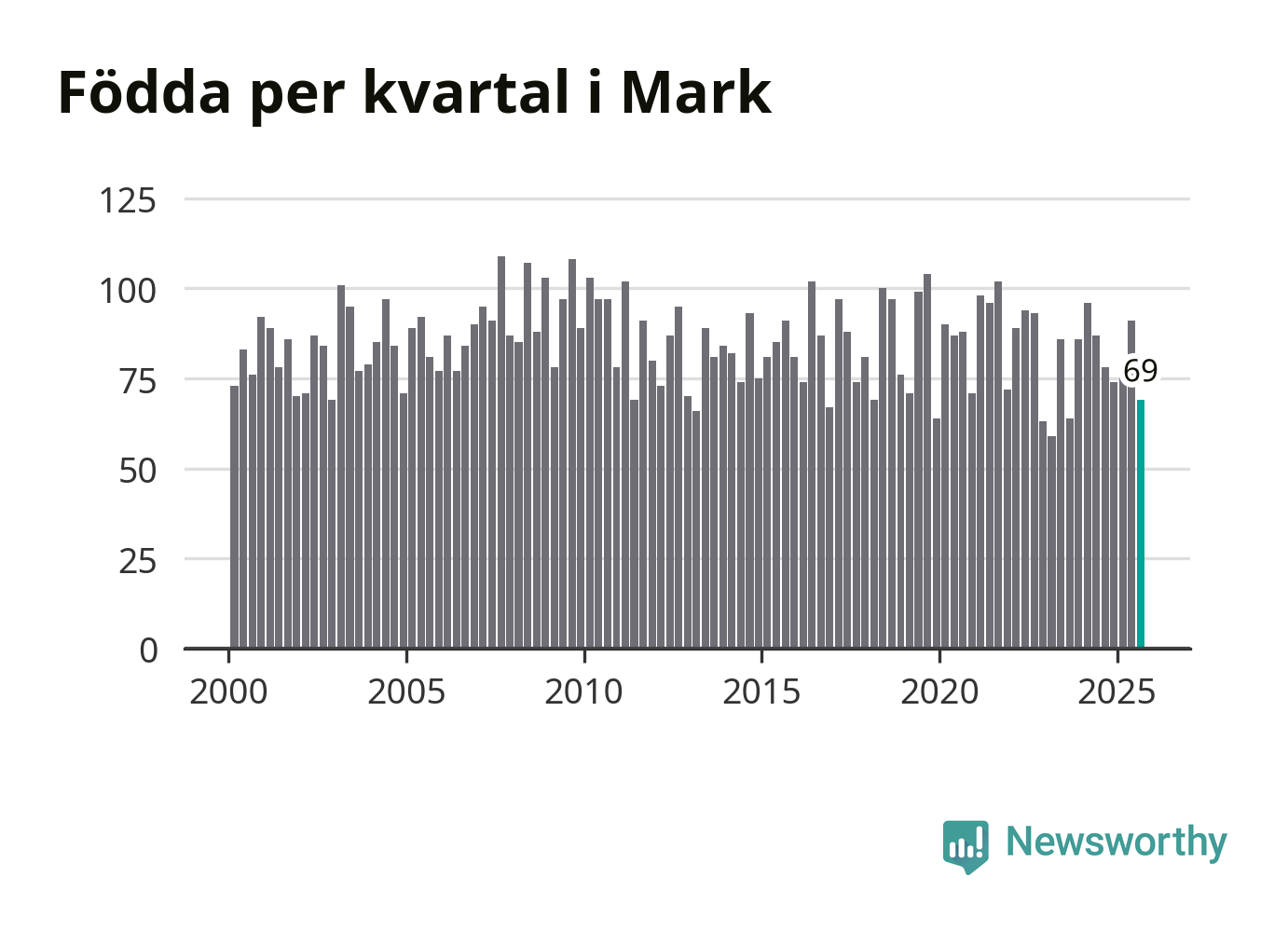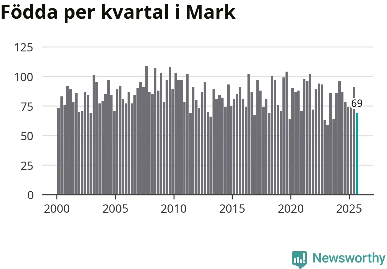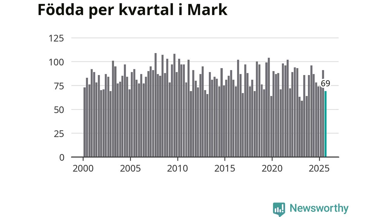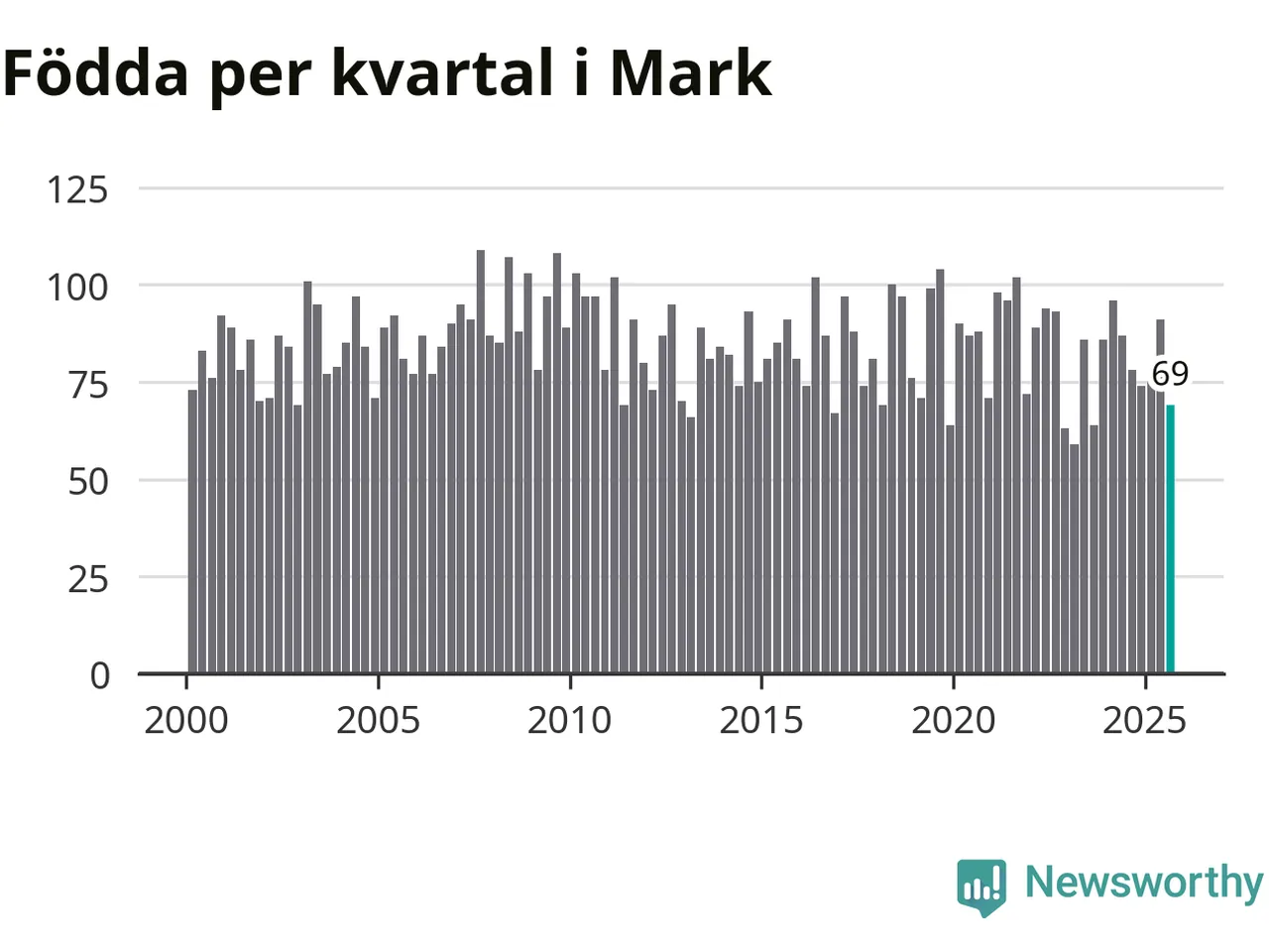 Enligt SCB:s siffror föddes 69 barn i Mark under det senaste kvartalet. Samtidigt avled 103 personer. Mark hade alltså ett negativt födelsenetto, vilket kommunen historiskt sett oftast har haft.