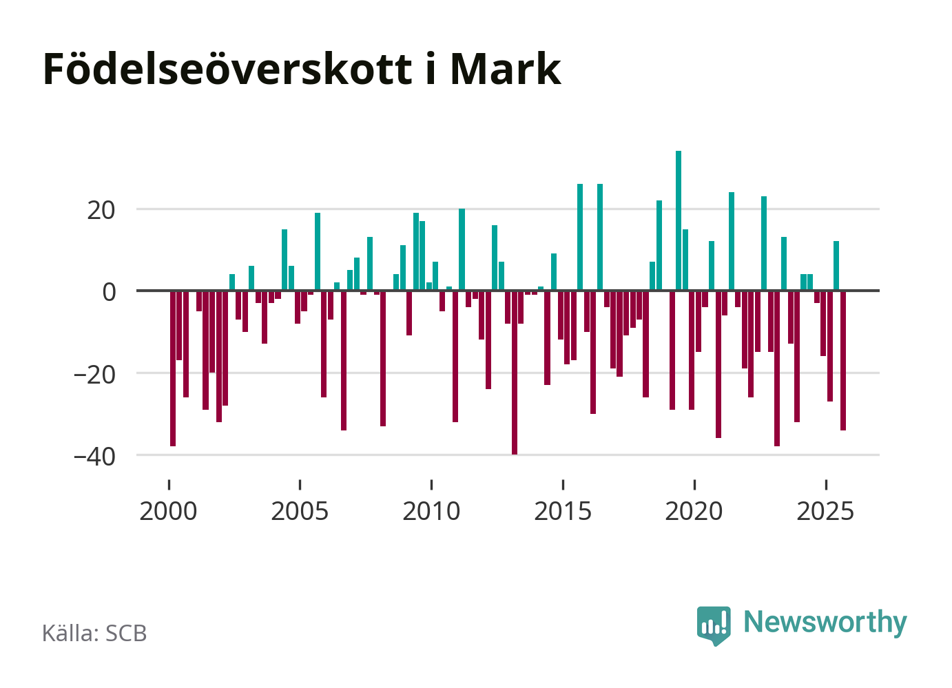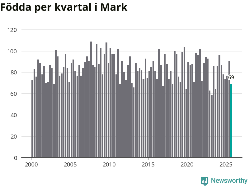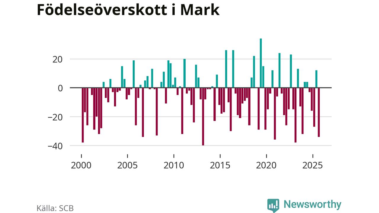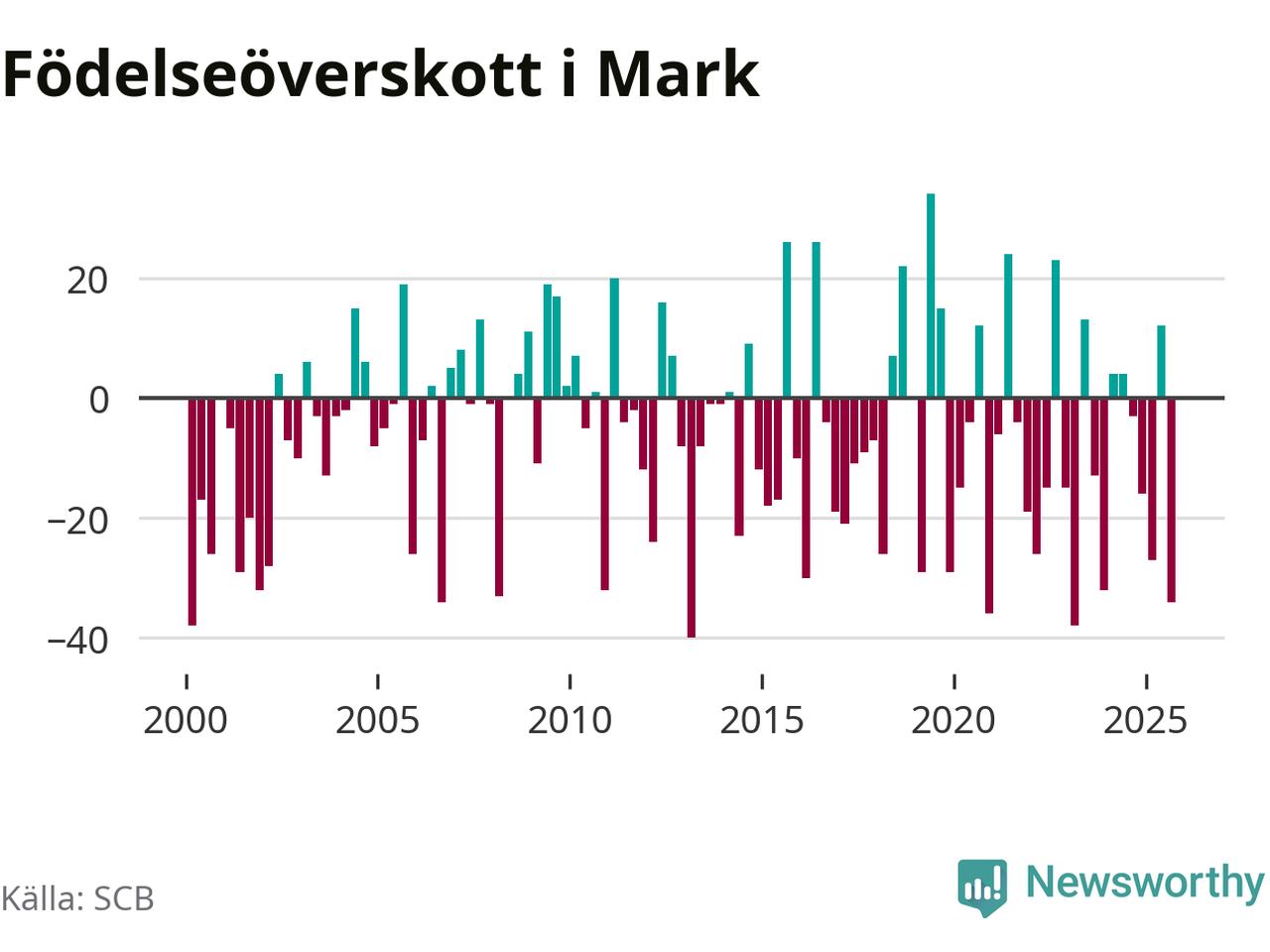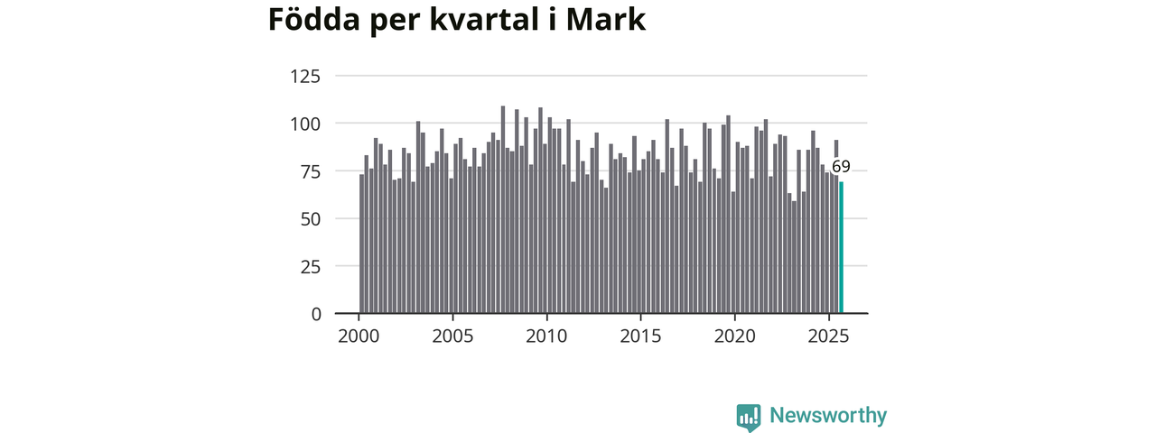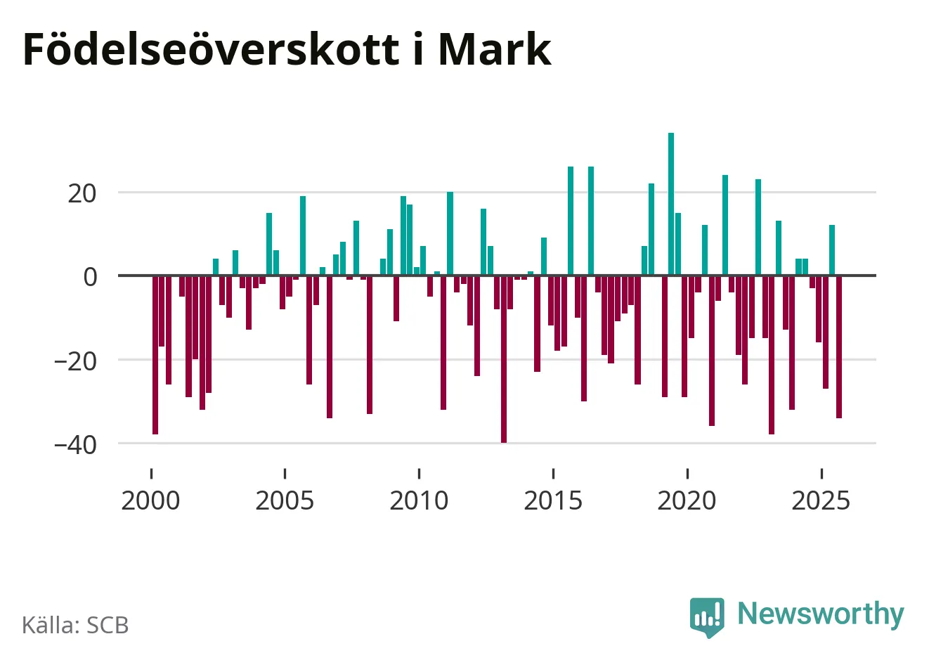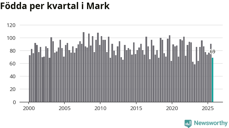 Enligt SCB:s siffror föddes 69 barn i Mark under det senaste kvartalet. Samtidigt avled 103 personer. Mark hade alltså ett negativt födelsenetto, vilket kommunen historiskt sett oftast har haft.