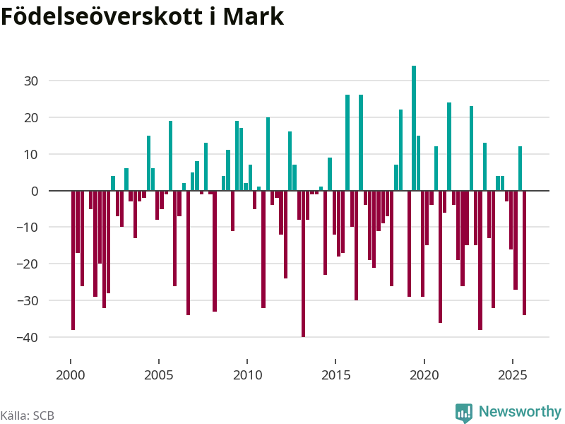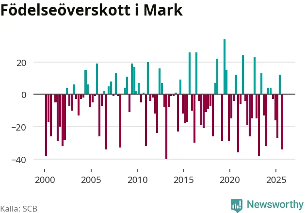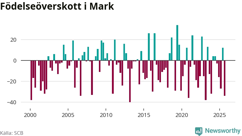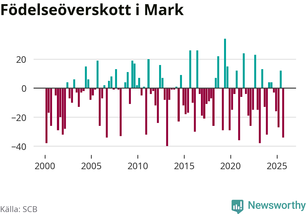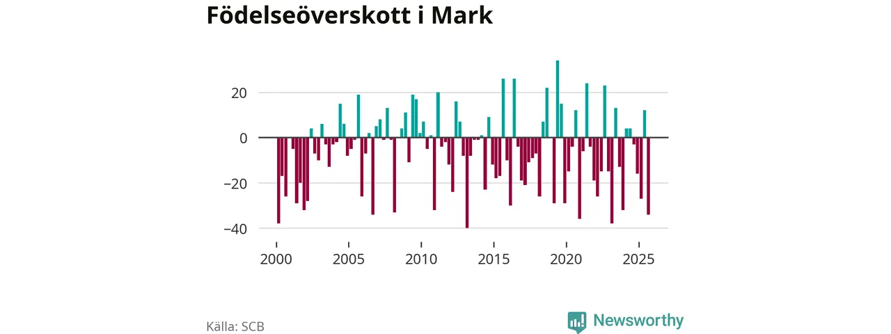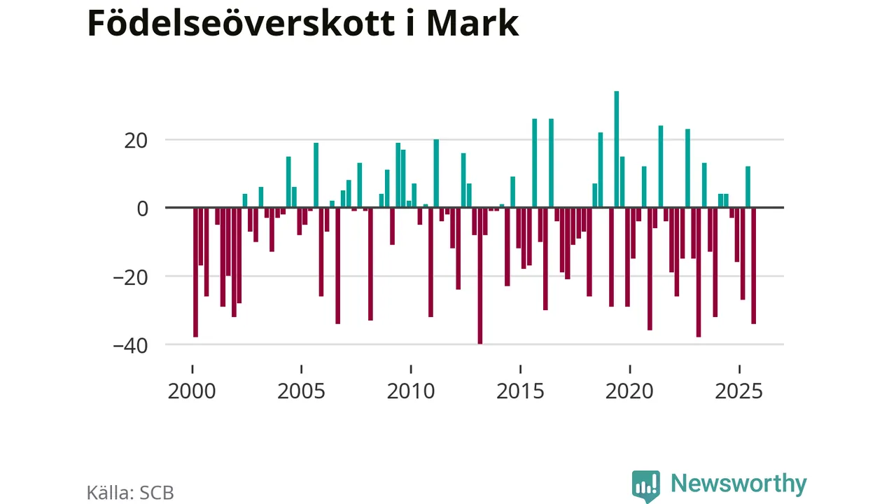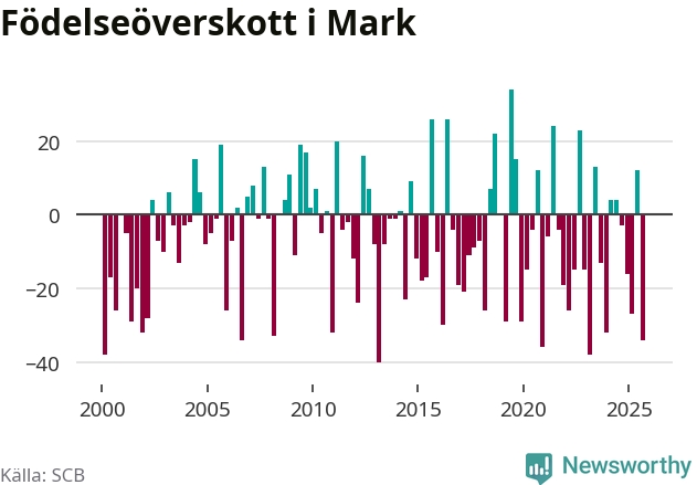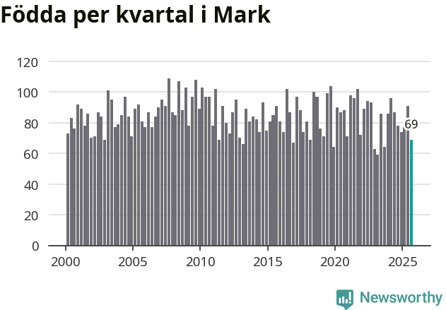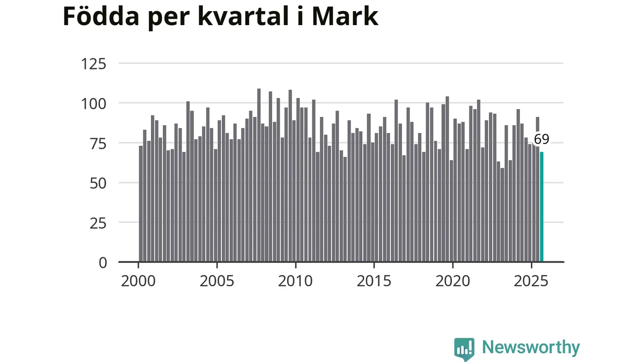 Enligt SCB:s siffror föddes 69 barn i Mark under det senaste kvartalet. Samtidigt avled 103 personer. Mark hade alltså ett negativt födelsenetto, vilket kommunen historiskt sett oftast har haft.
