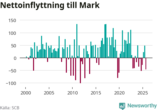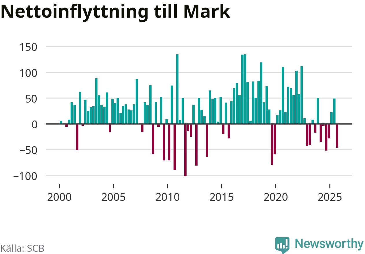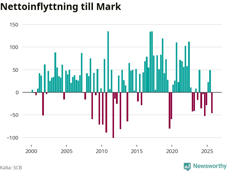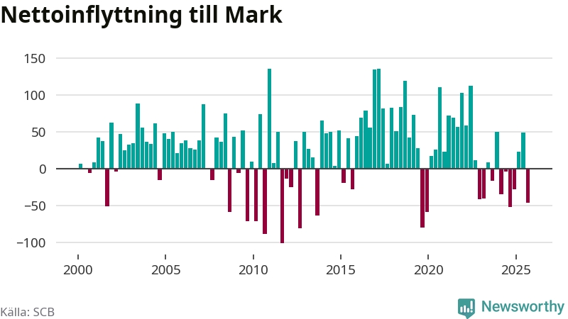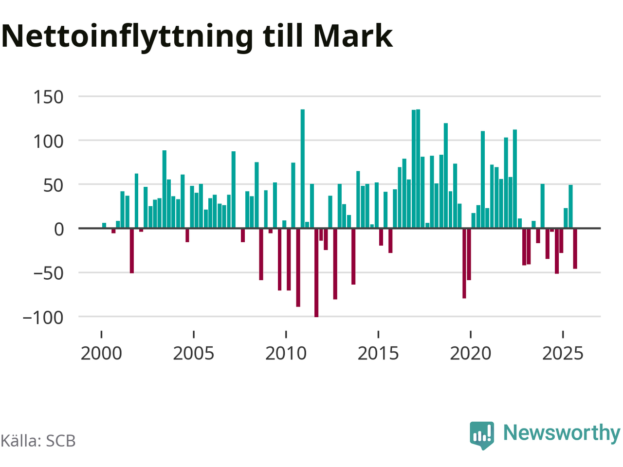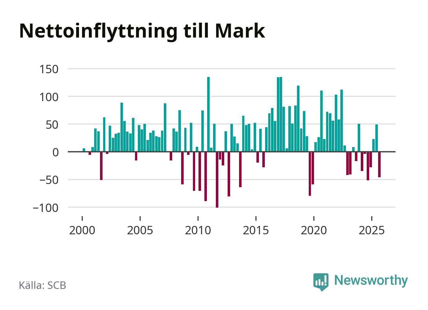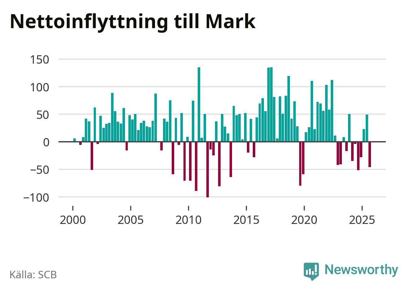 Under tredje kvartalet 2025 flyttade 414 personer till kommunen medan 460 personer flyttade därifrån. Det är historiskt sett en stor utflyttning under ett kvartal. Sedan seklets början har Mark oftast haft ett positivt flyttnetto.
