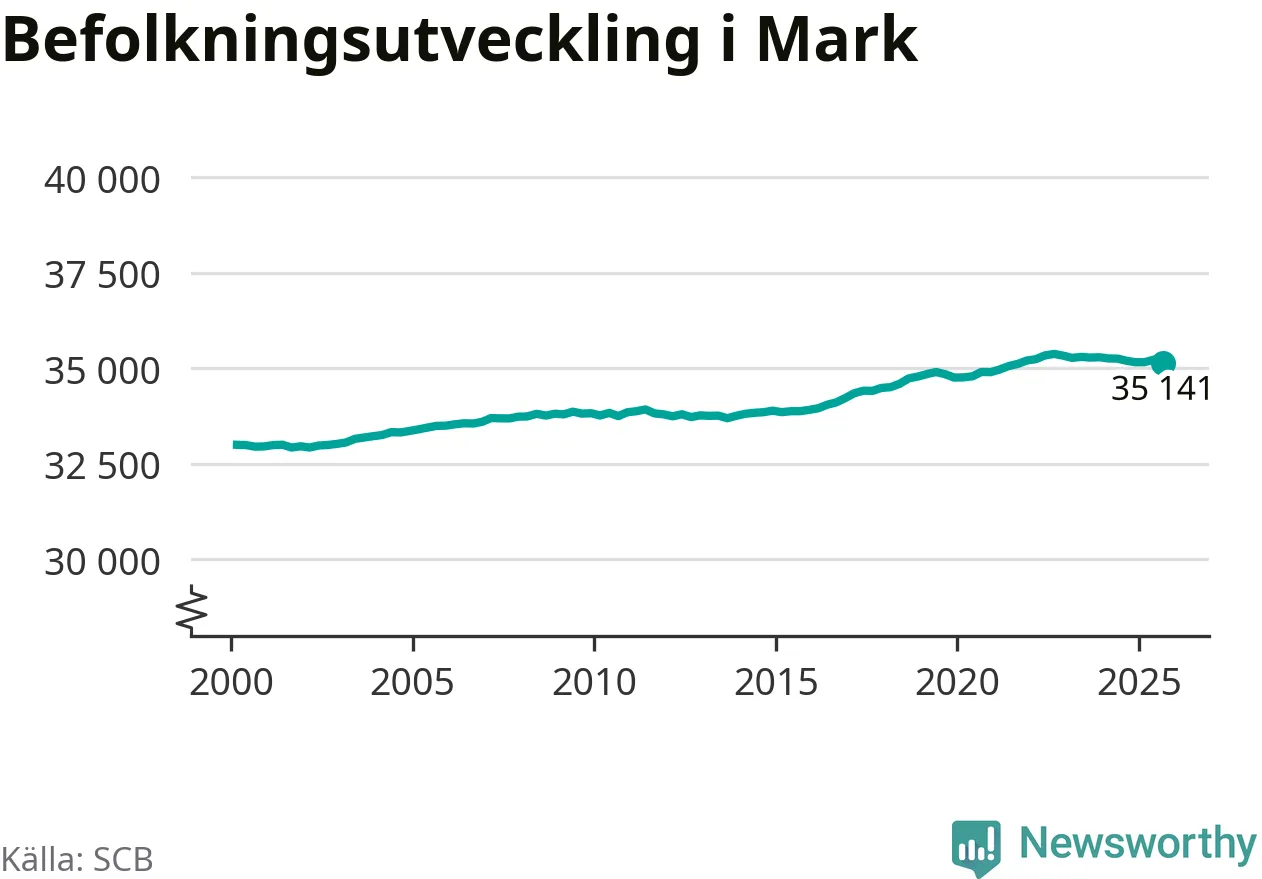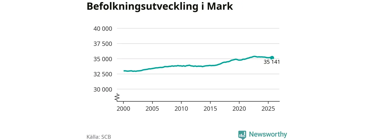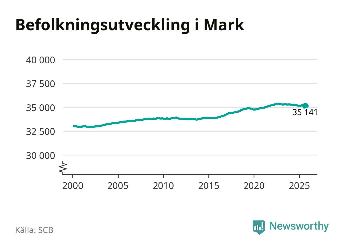 Befolkningen minskade i Marks kommun under det tredje kvartalet 2025. Den 30 september bodde enligt SCB:s senaste siffror 35 141 personer i kommunen, vilket är 82 färre än i slutet av andra kvartalet.
