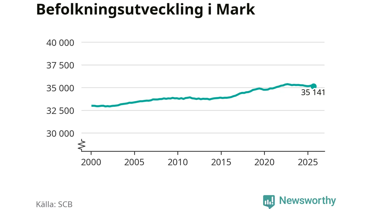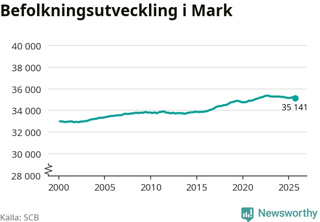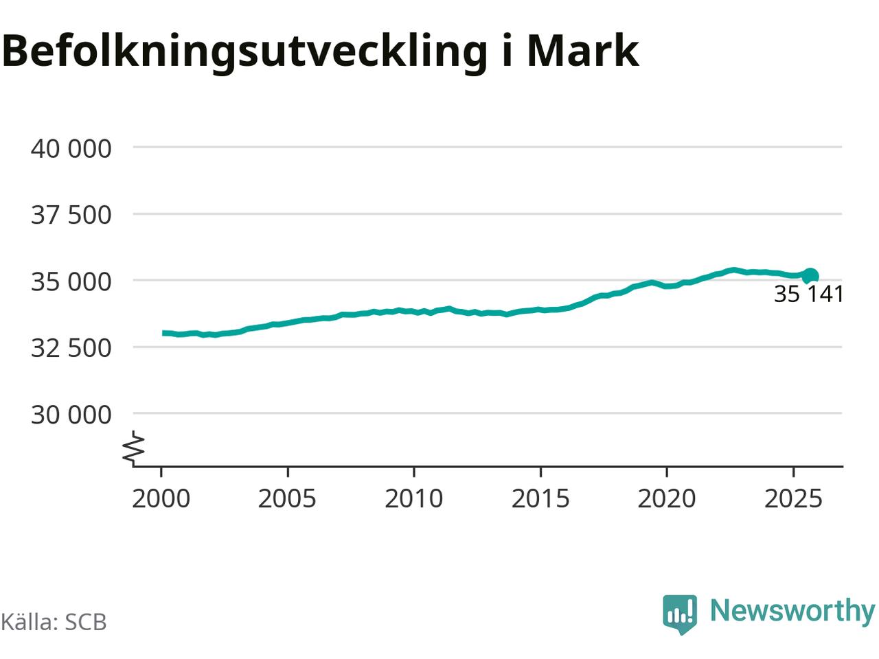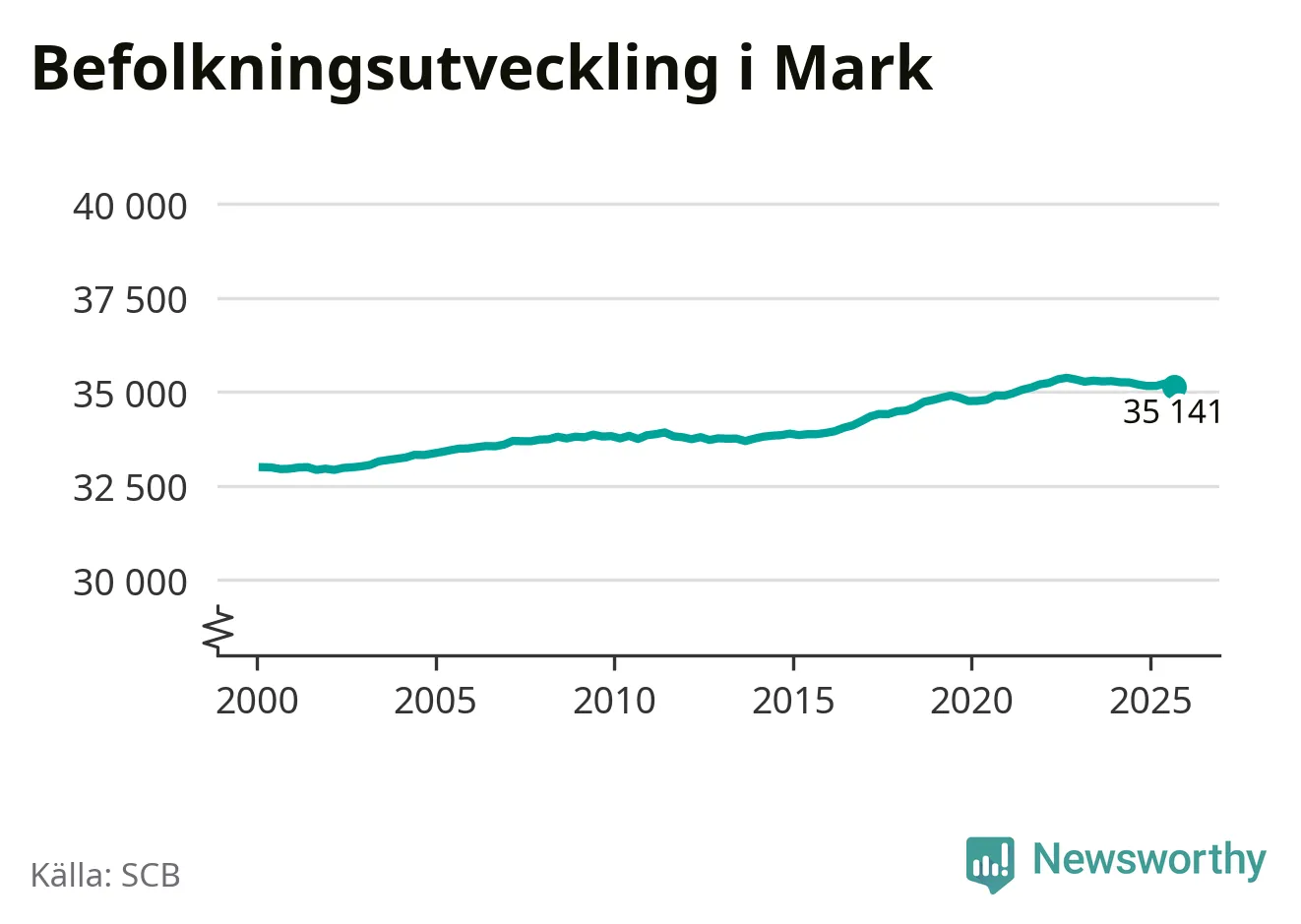 Befolkningen minskade i Marks kommun under det tredje kvartalet 2025. Den 30 september bodde enligt SCB:s senaste siffror 35 141 personer i kommunen, vilket är 82 färre än i slutet av andra kvartalet.