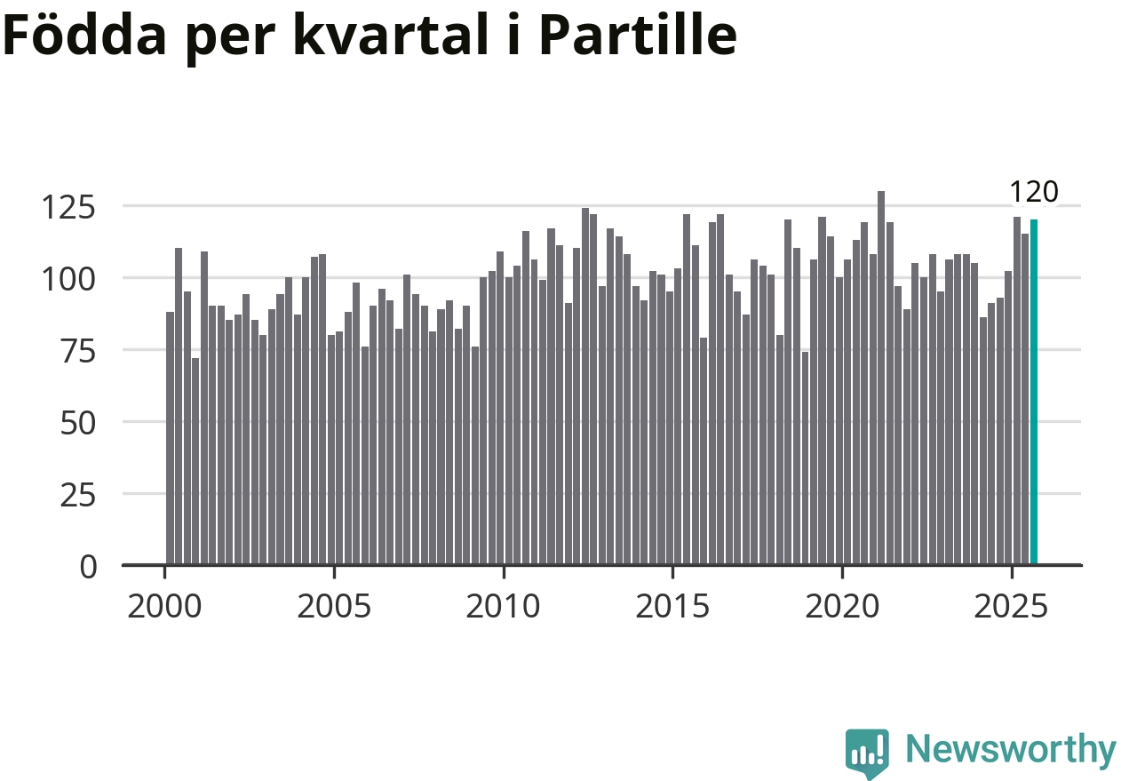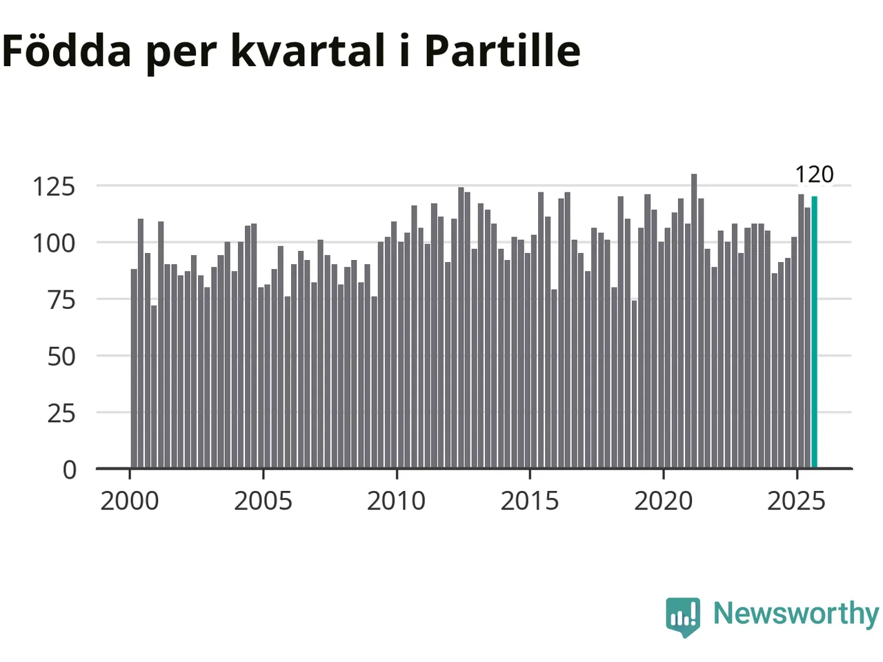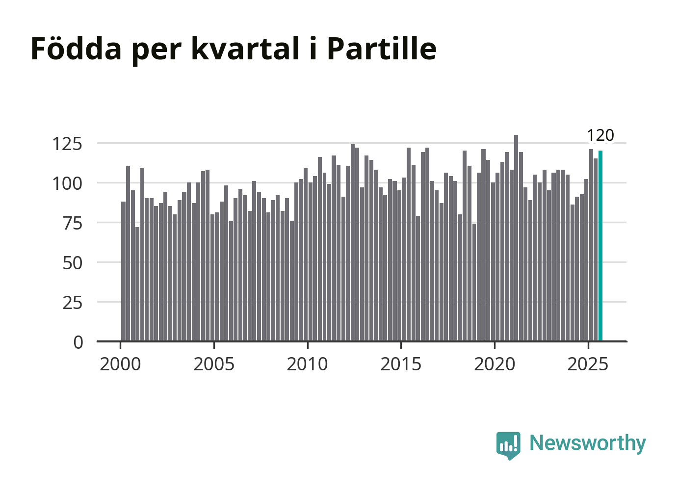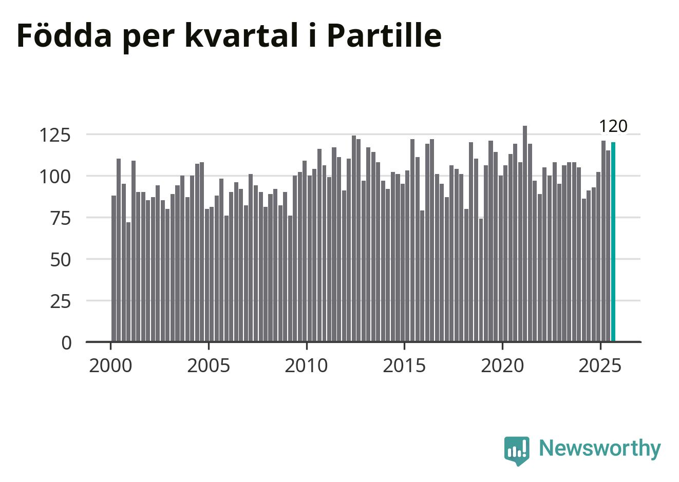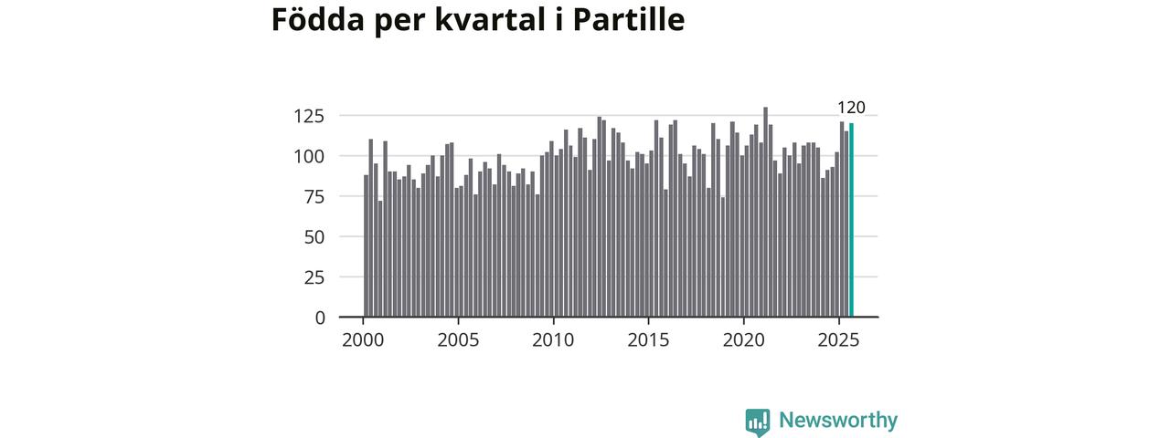 Enligt SCB:s siffror föddes 120 barn i Partille under det senaste kvartalet, vilket är en relativt hög siffra historiskt sett. Samtidigt avled 56 personer. Partille hade alltså ett positivt födelsenetto, vilket kommunen historiskt sett nästan alltid har haft.