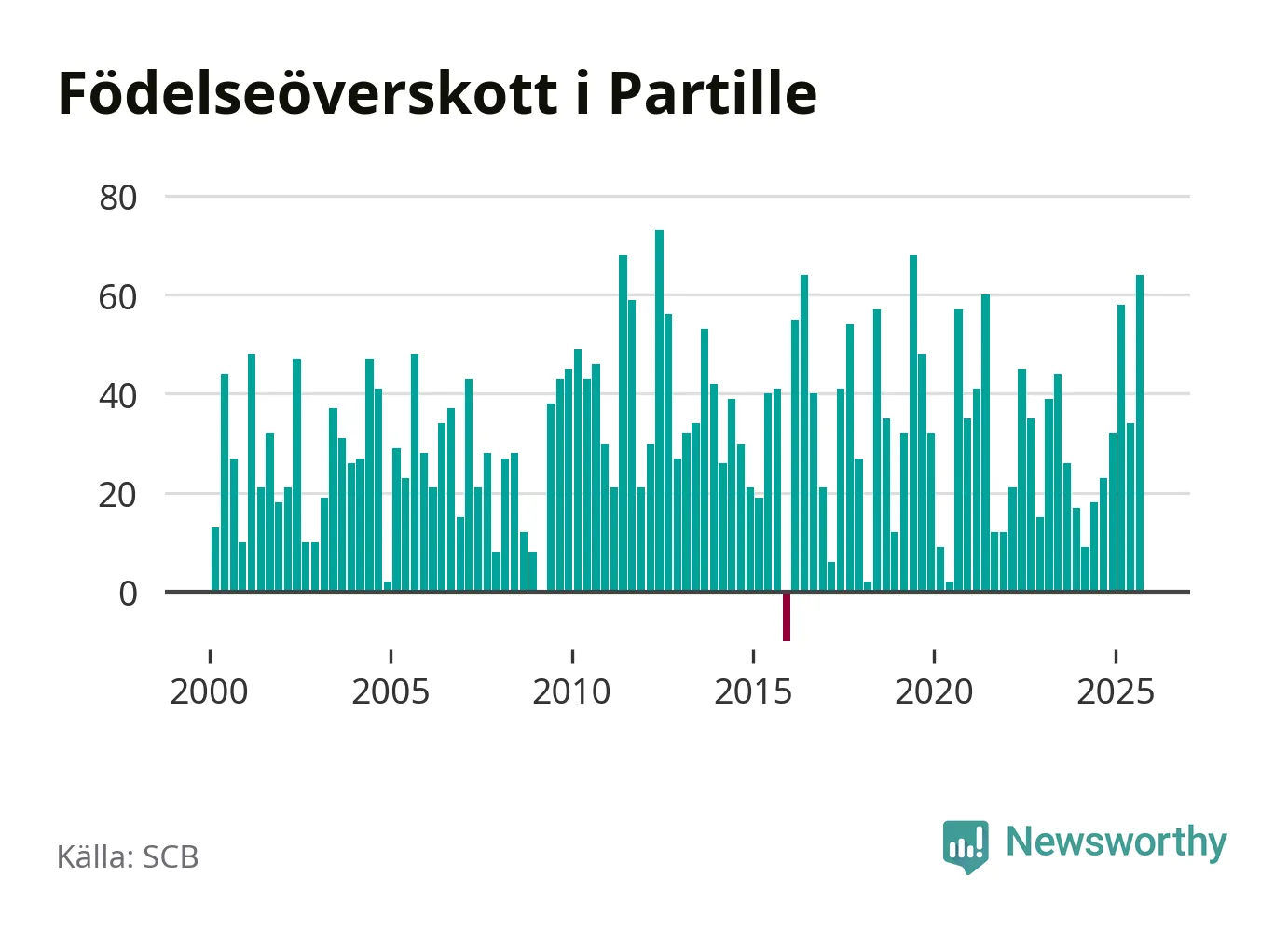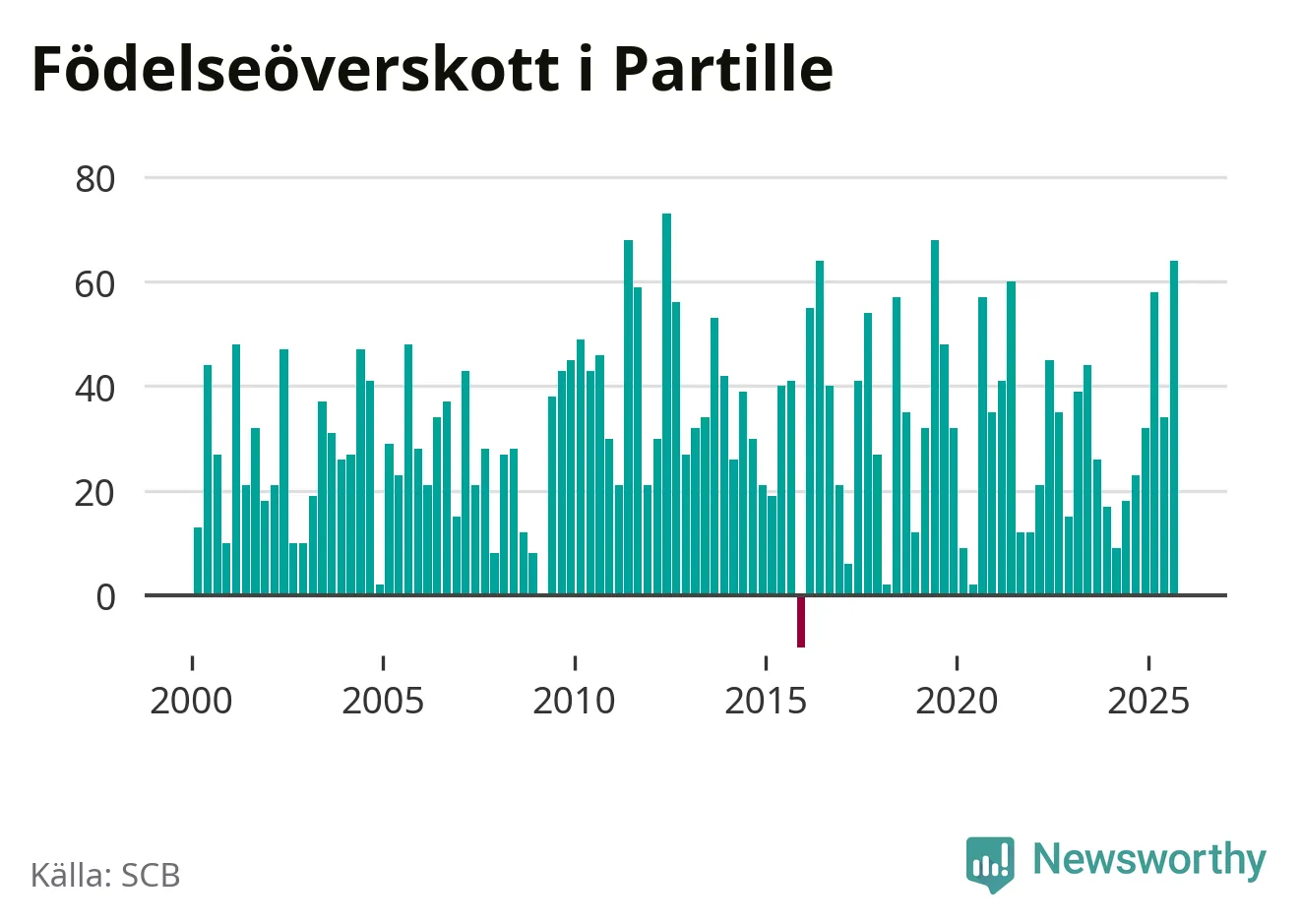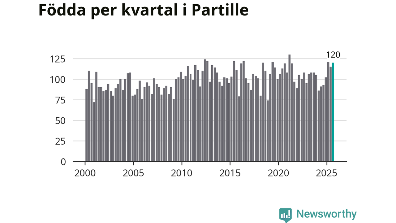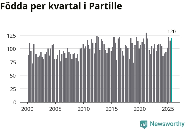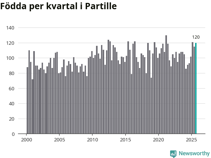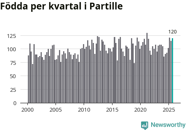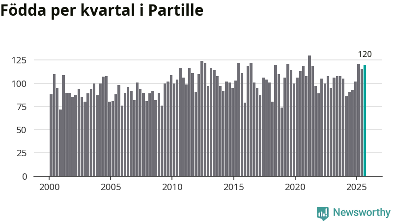 Enligt SCB:s siffror föddes 120 barn i Partille under det senaste kvartalet, vilket är en relativt hög siffra historiskt sett. Samtidigt avled 56 personer. Partille hade alltså ett positivt födelsenetto, vilket kommunen historiskt sett nästan alltid har haft.
