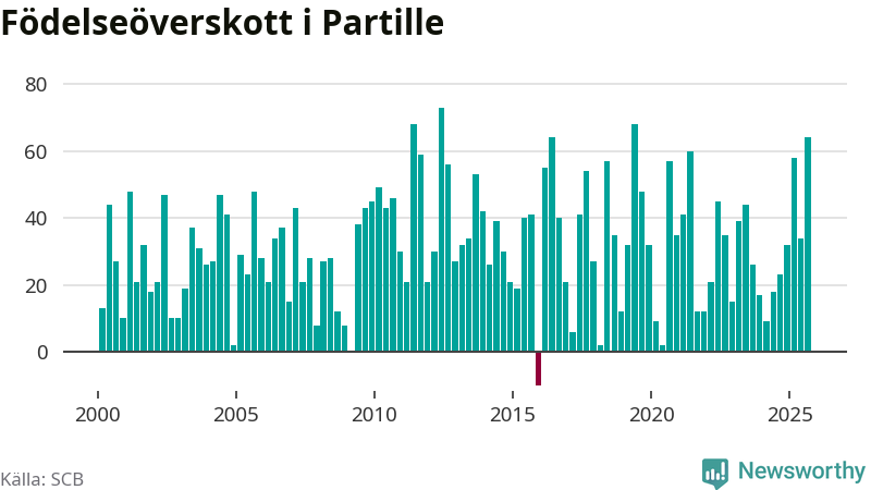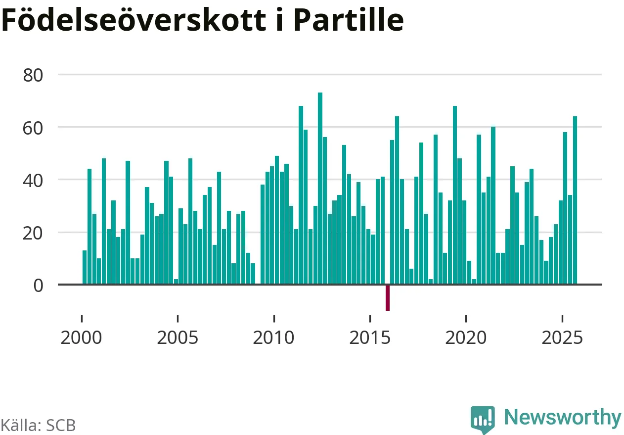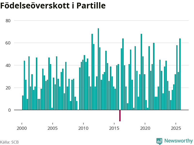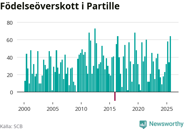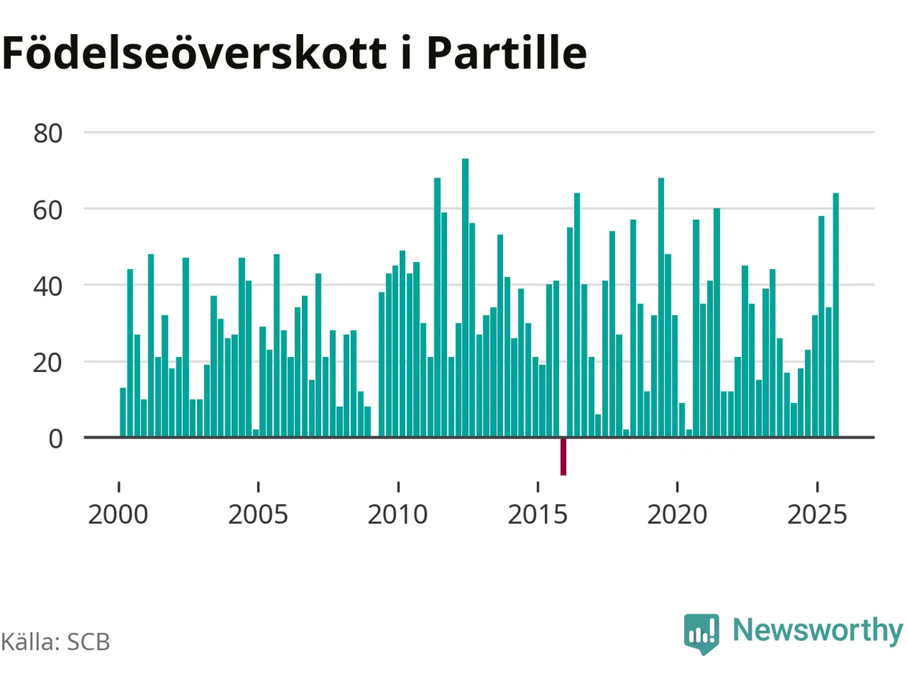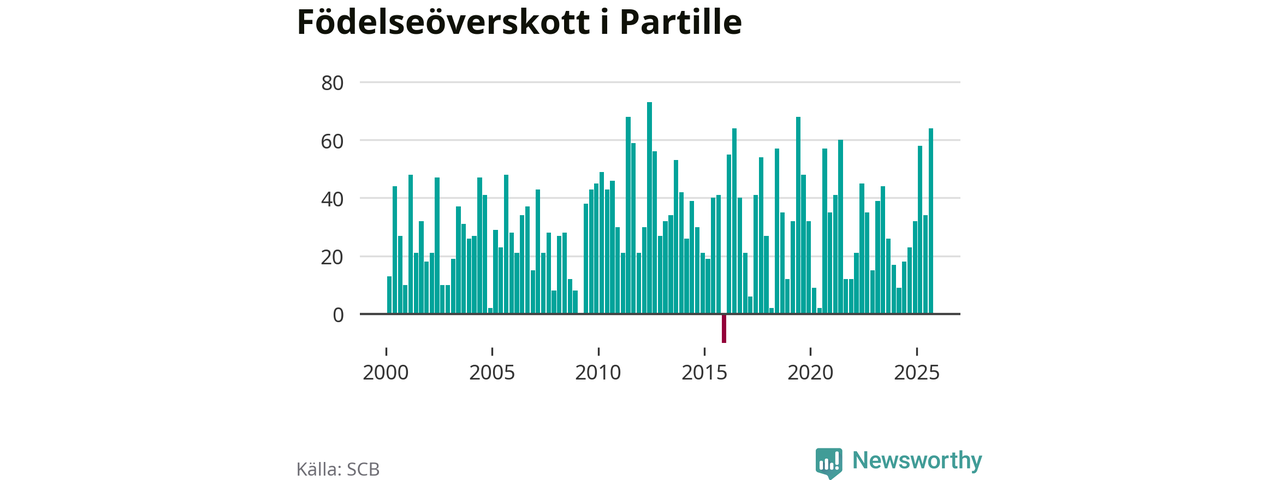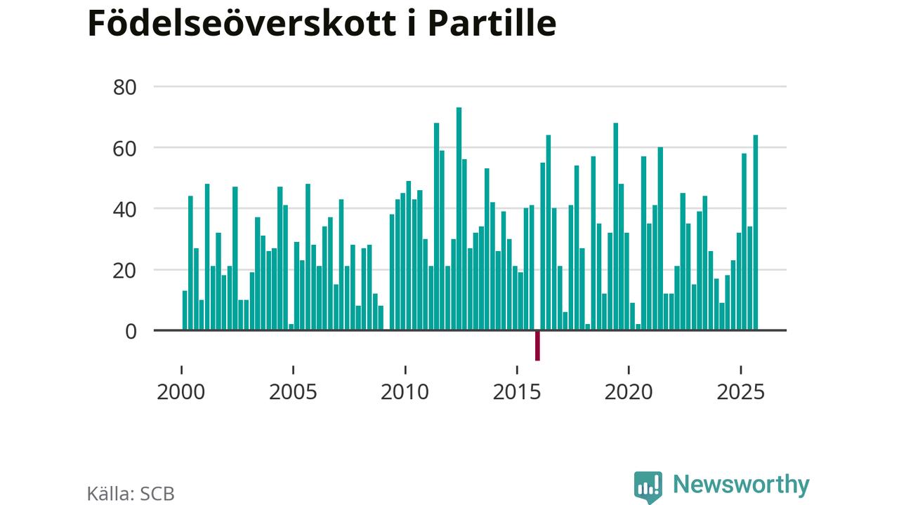 Enligt SCB:s siffror föddes 120 barn i Partille under det senaste kvartalet, vilket är en relativt hög siffra historiskt sett. Samtidigt avled 56 personer. Partille hade alltså ett positivt födelsenetto, vilket kommunen historiskt sett nästan alltid har haft.