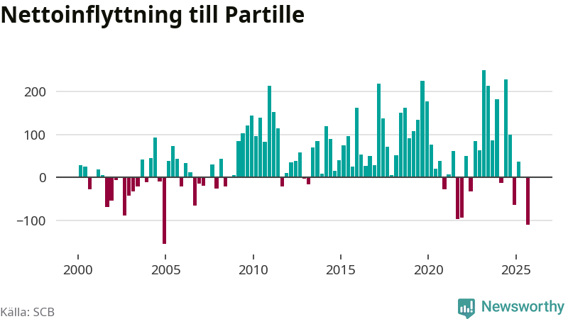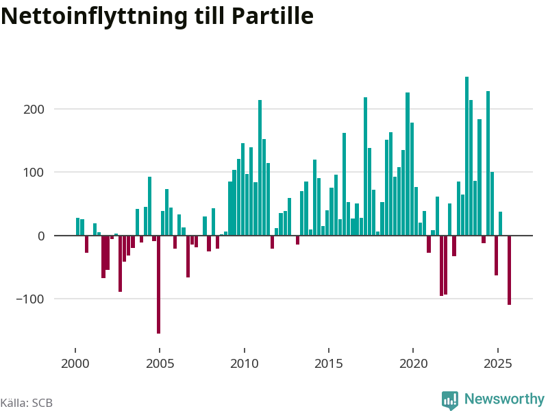 Under tredje kvartalet 2025 flyttade 910 personer till kommunen medan 1 020 personer flyttade därifrån. Det är historiskt sett en stor inflyttning under ett kvartal – men samtidigt var utflyttningen den största hittills. Sedan seklets början har Partille haft ett positivt flyttnetto under nästan alla kvartal.