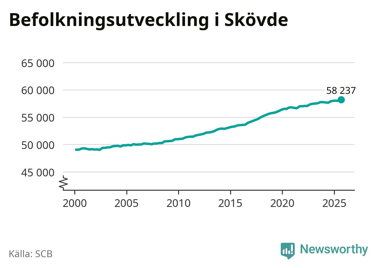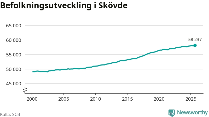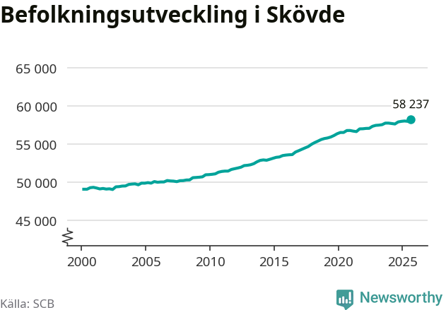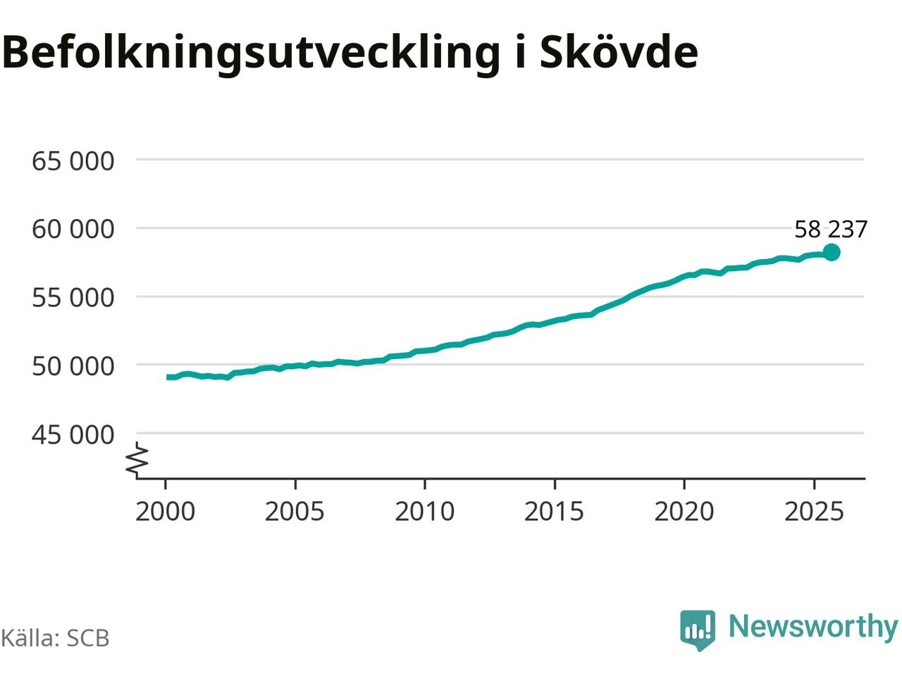 Befolkningen ökade i Skövde kommun under det tredje kvartalet 2025. Den 30 september bodde enligt SCB:s senaste siffror 58 237 personer i kommunen, vilket är 240 fler än i slutet av andra kvartalet. Folkökningen är procentuellt sett en av de största i Västra Götaland.