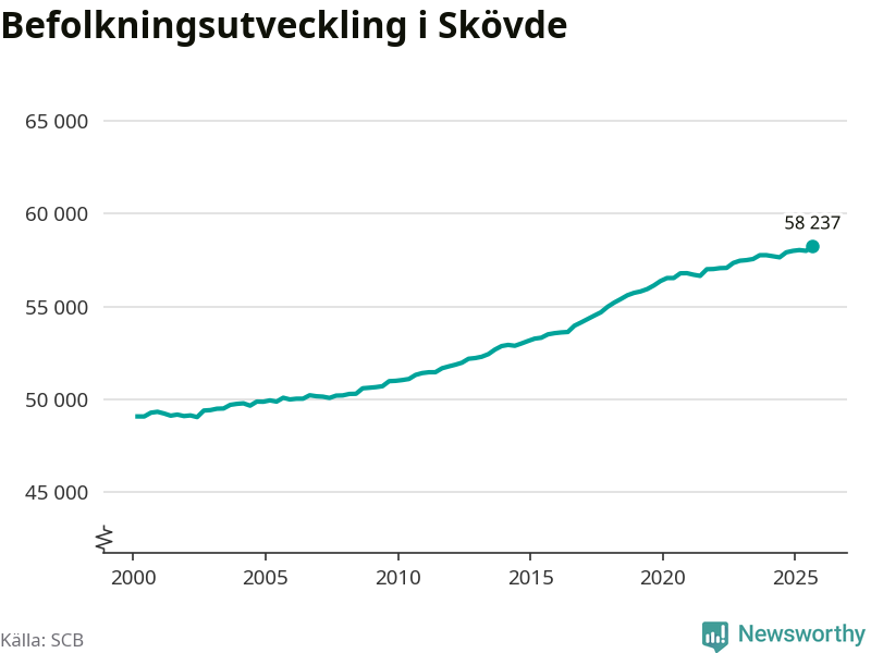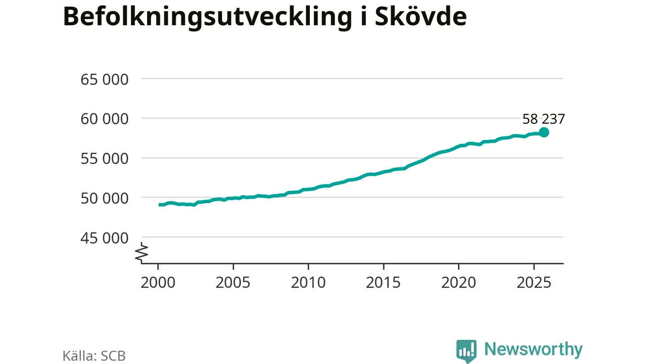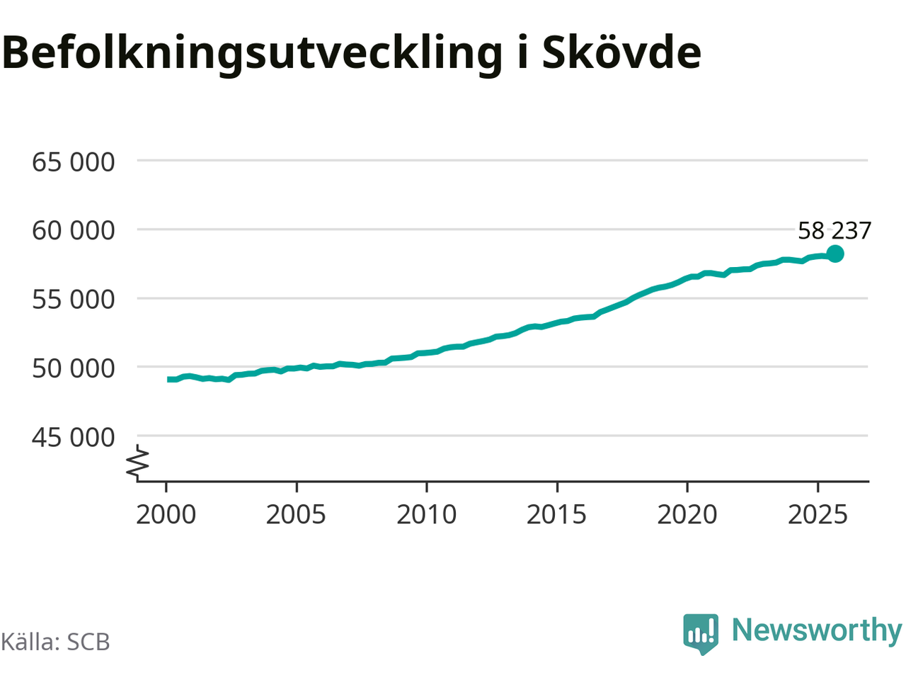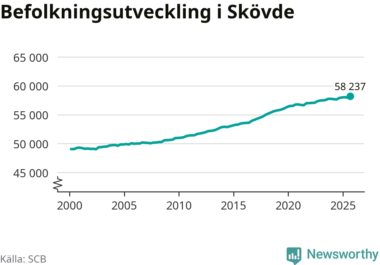 Befolkningen ökade i Skövde kommun under det tredje kvartalet 2025. Den 30 september bodde enligt SCB:s senaste siffror 58 237 personer i kommunen, vilket är 240 fler än i slutet av andra kvartalet. Folkökningen är procentuellt sett en av de största i Västra Götaland.