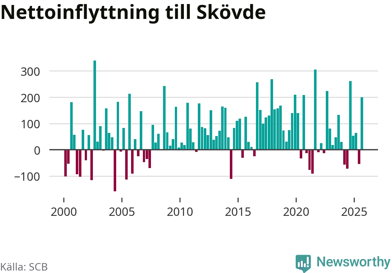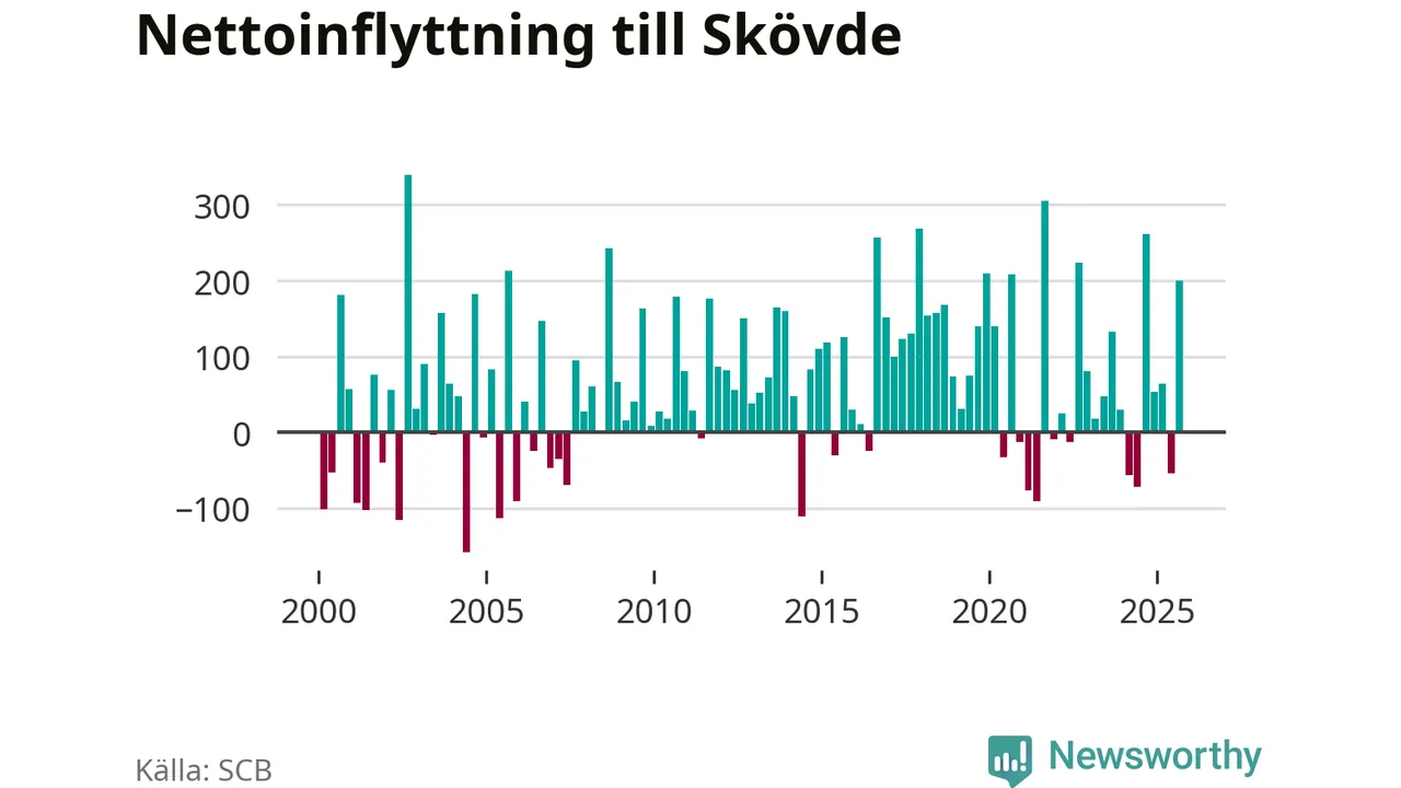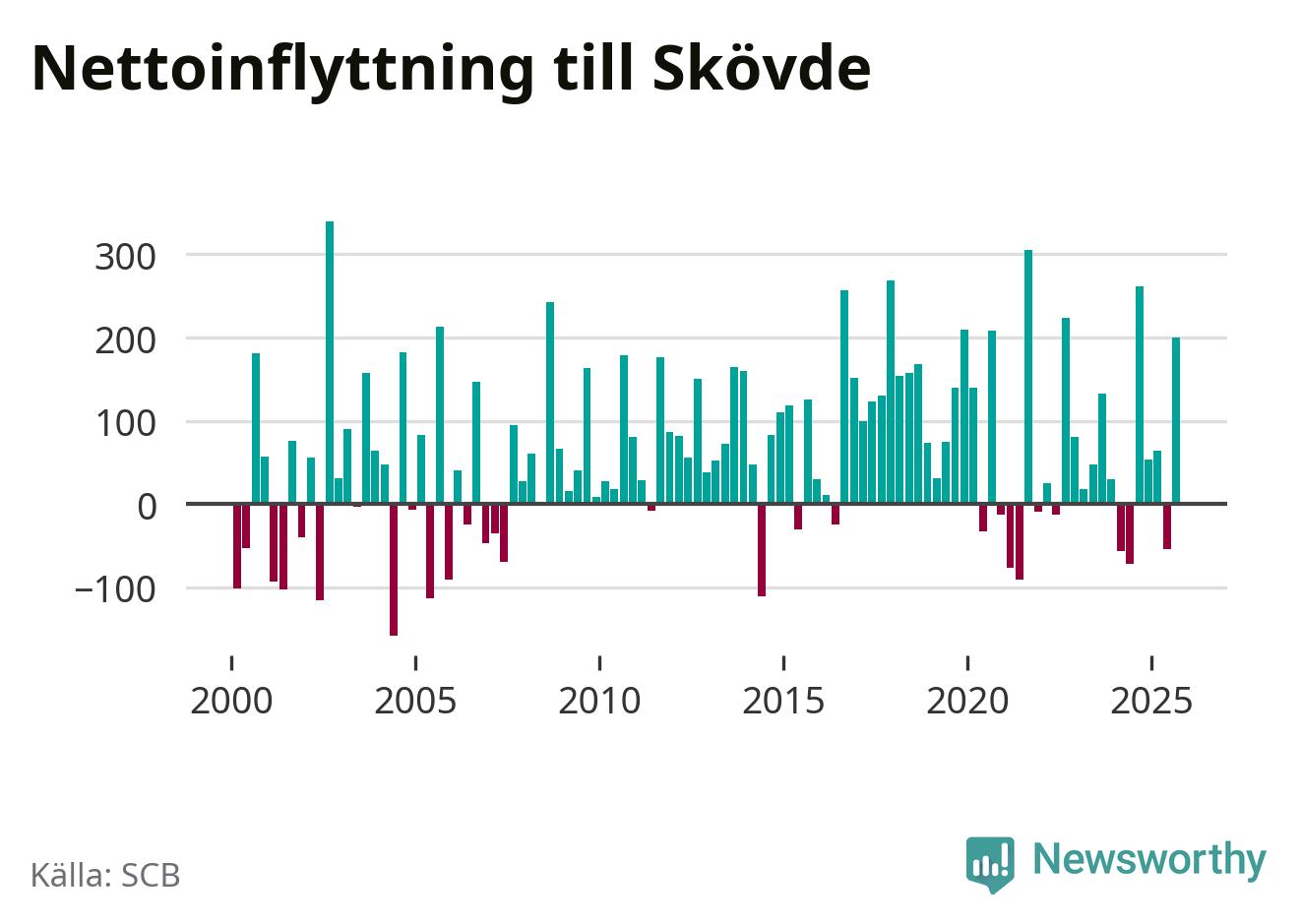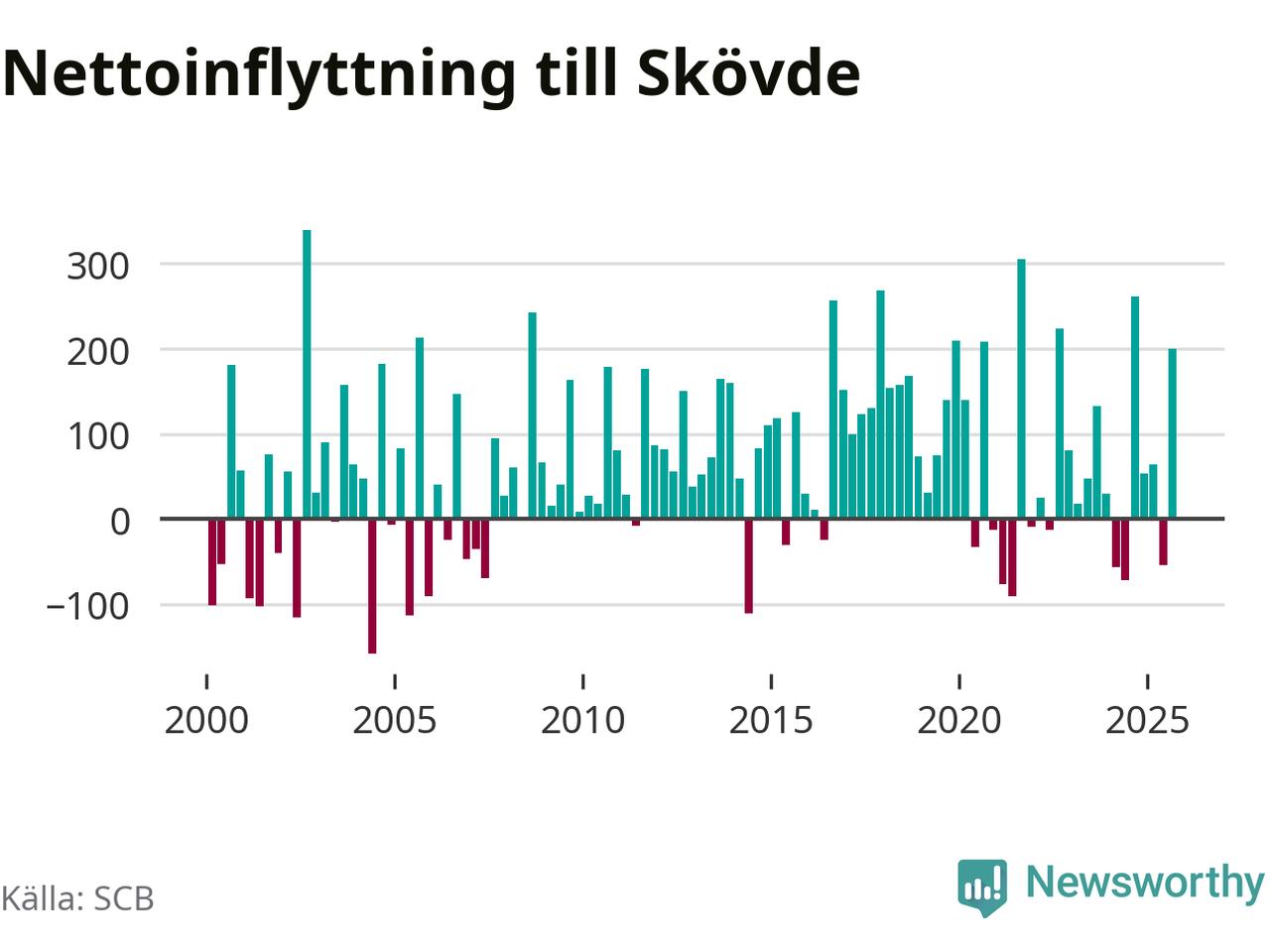 Under tredje kvartalet 2025 flyttade 1 208 personer till kommunen medan 1 008 personer flyttade därifrån. Det är historiskt sett en stor inflyttning under ett kvartal – men samtidigt var utflyttningen relativt stor. Sedan seklets början har Skövde oftast haft ett positivt flyttnetto, inklusive det senaste kvartalet.