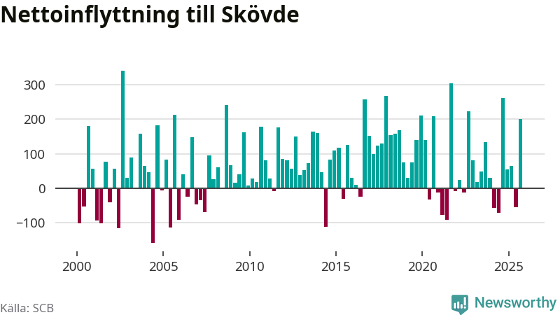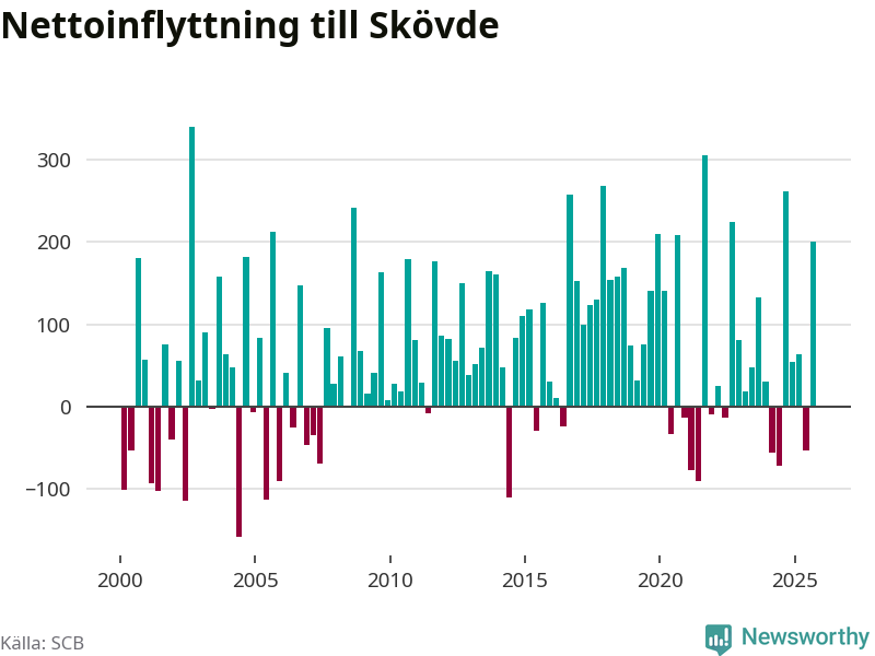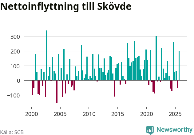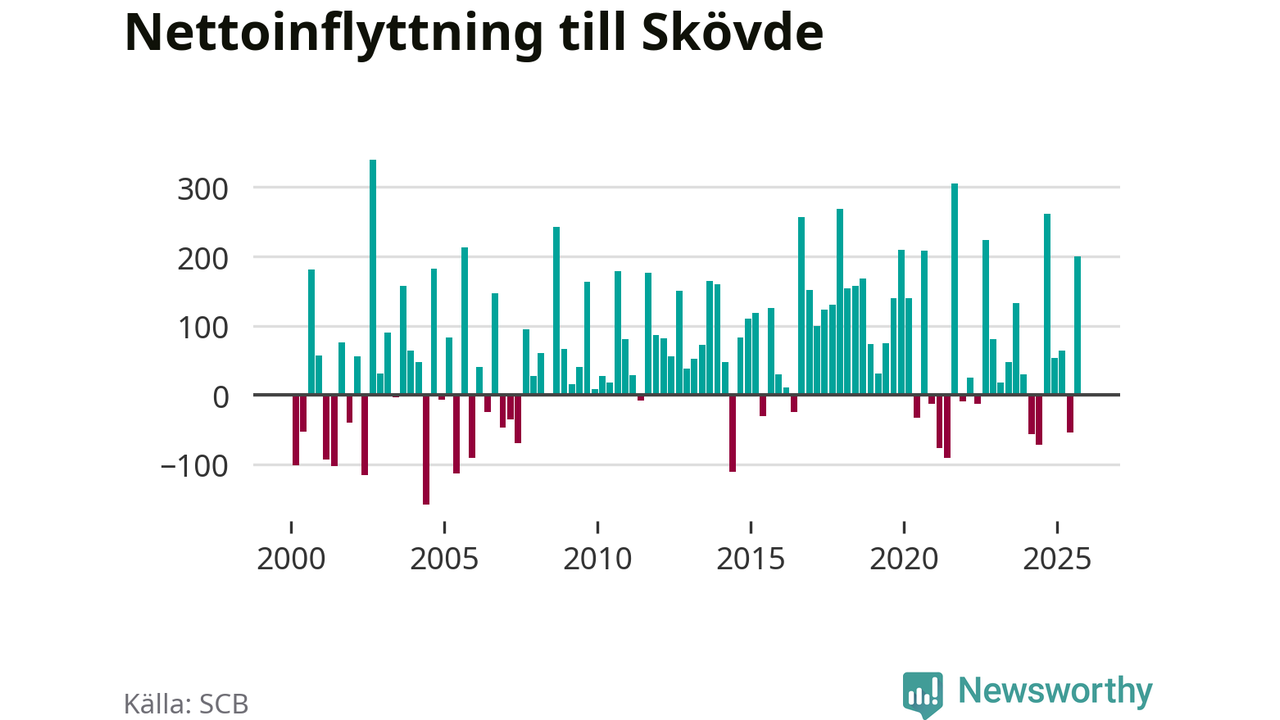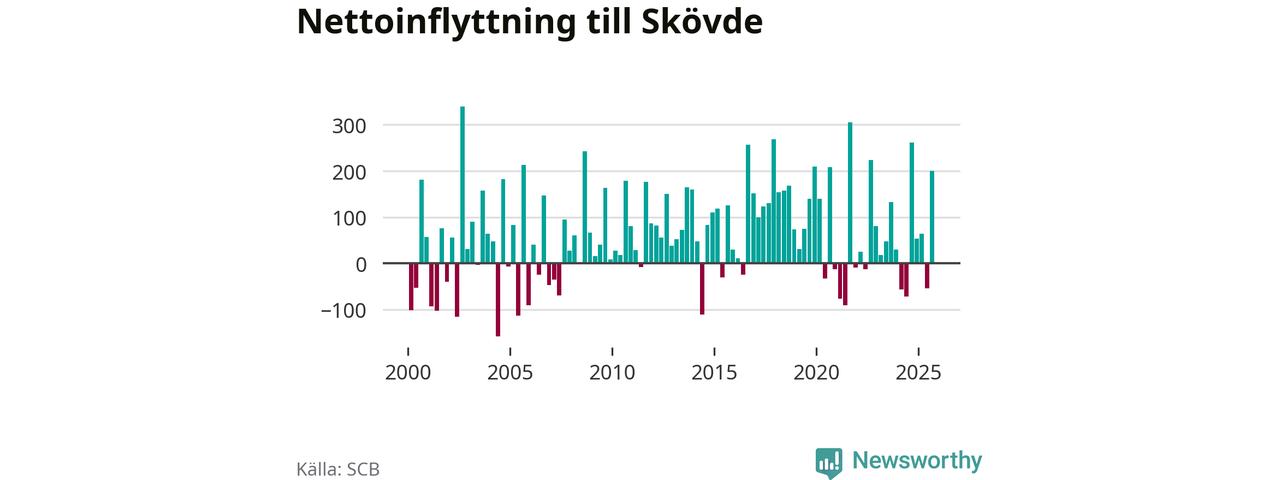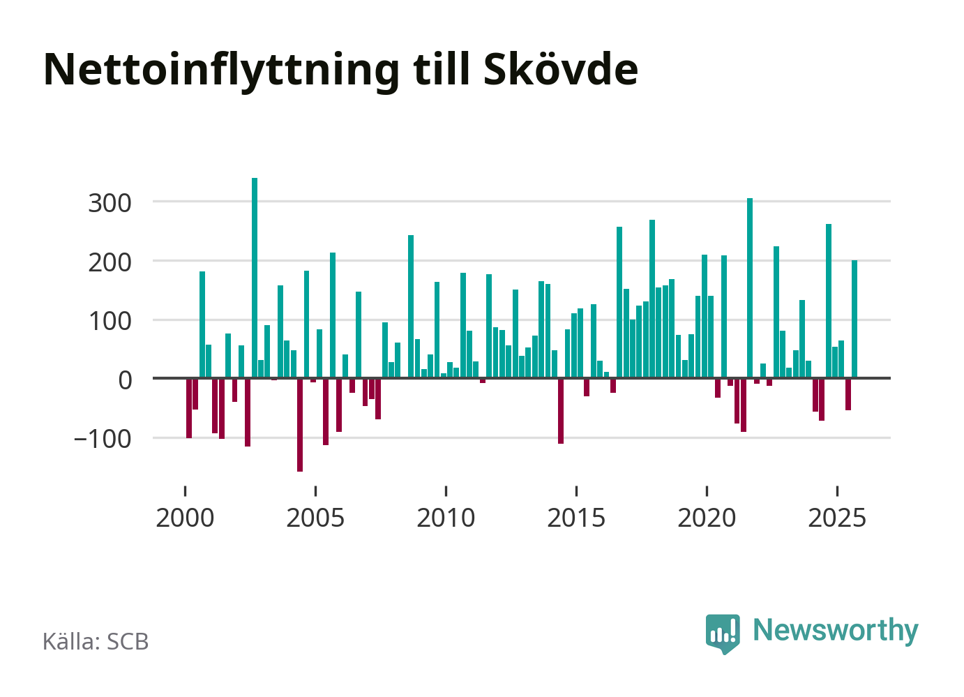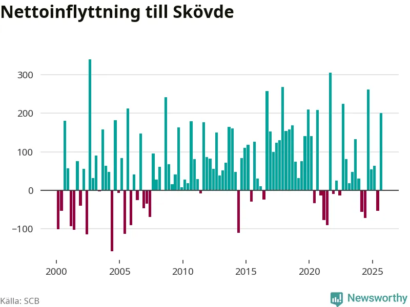 Under tredje kvartalet 2025 flyttade 1 208 personer till kommunen medan 1 008 personer flyttade därifrån. Det är historiskt sett en stor inflyttning under ett kvartal – men samtidigt var utflyttningen relativt stor. Sedan seklets början har Skövde oftast haft ett positivt flyttnetto, inklusive det senaste kvartalet.