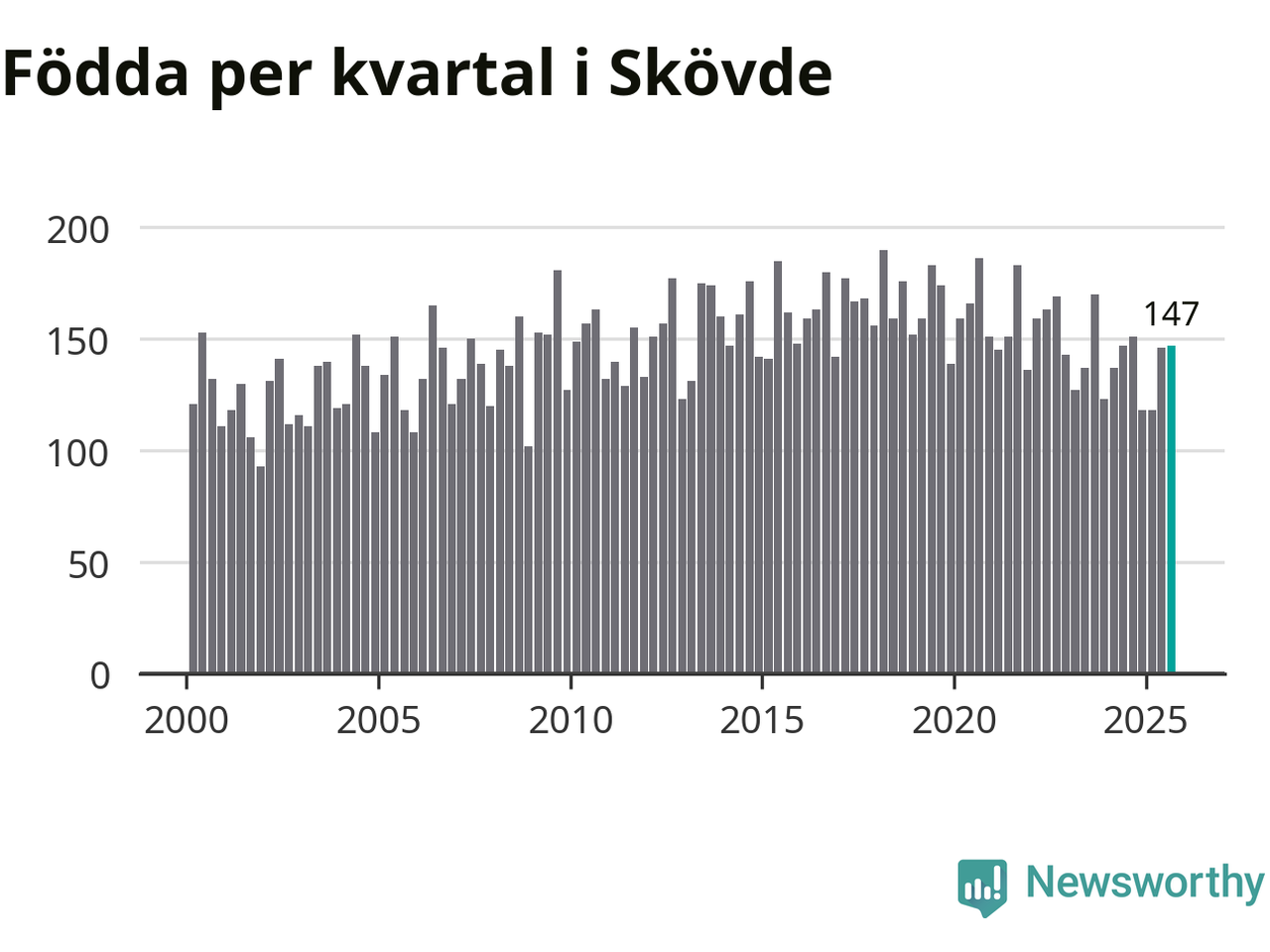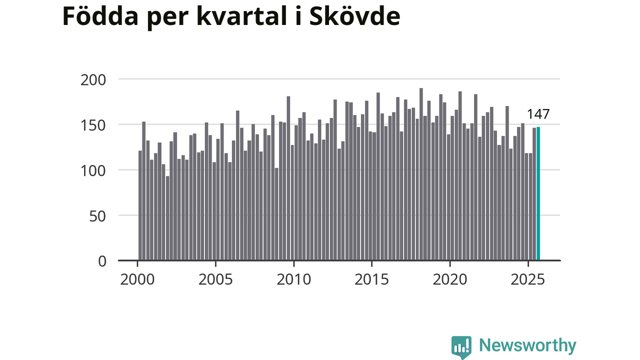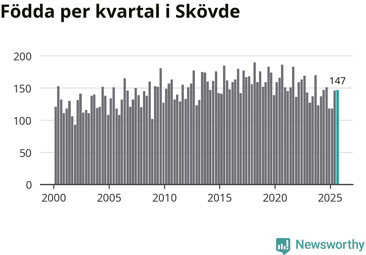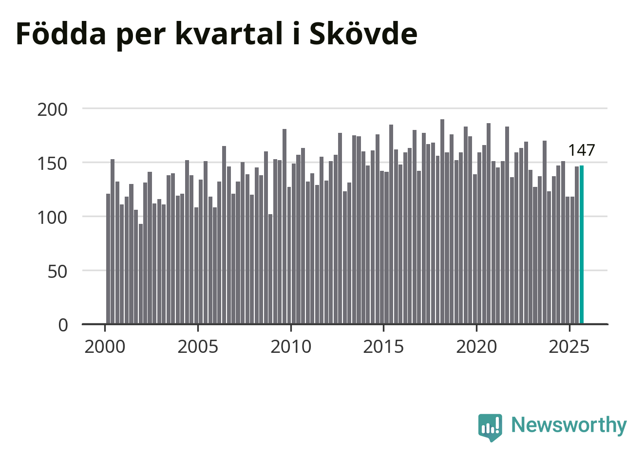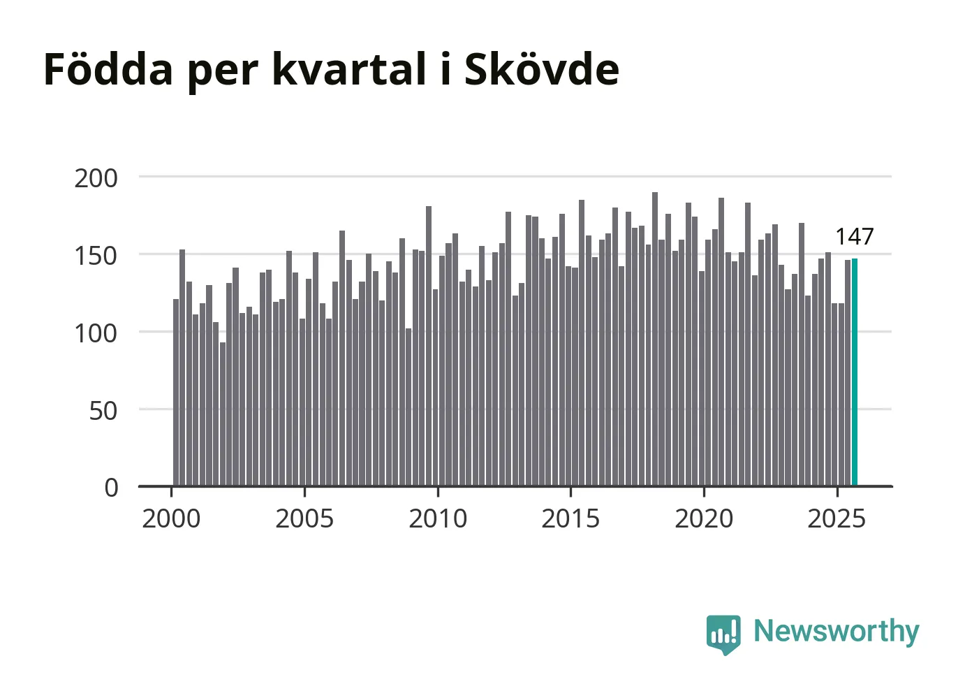 Enligt SCB:s siffror föddes 147 barn i Skövde under det senaste kvartalet. Samtidigt avled 108 personer. Skövde hade alltså ett positivt födelsenetto, vilket kommunen historiskt sett nästan alltid har haft.