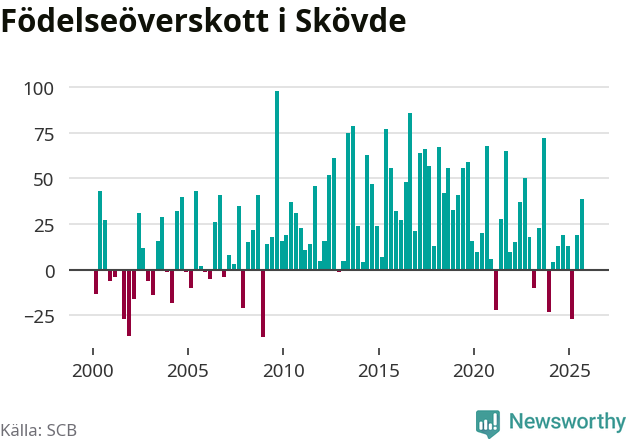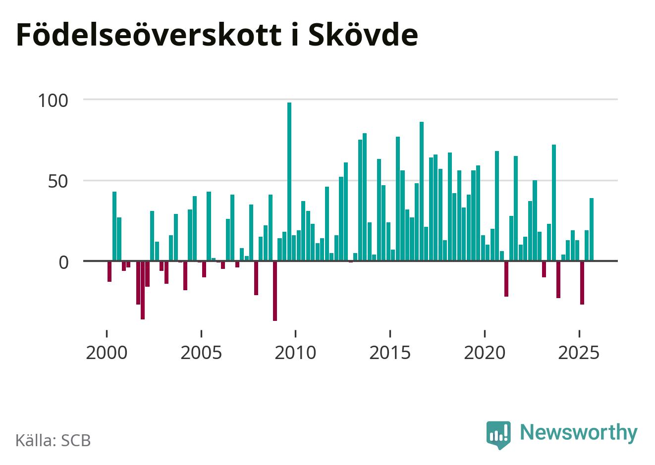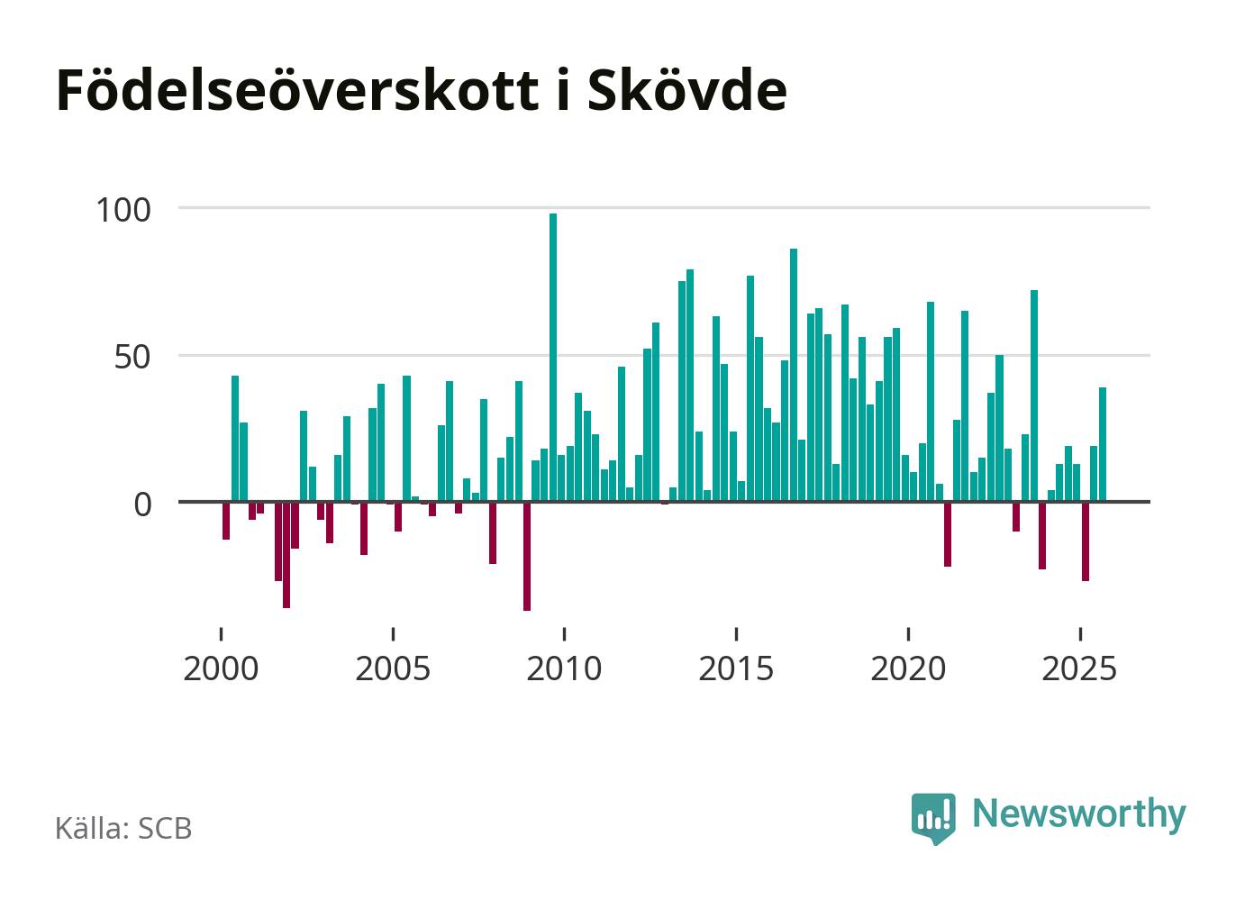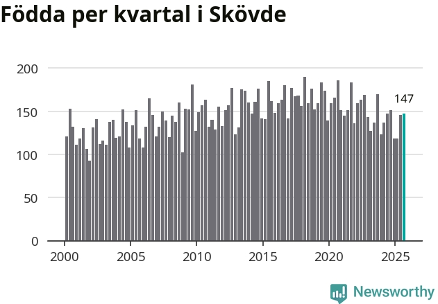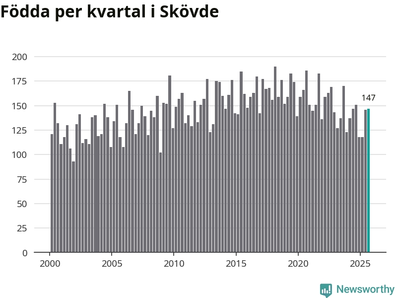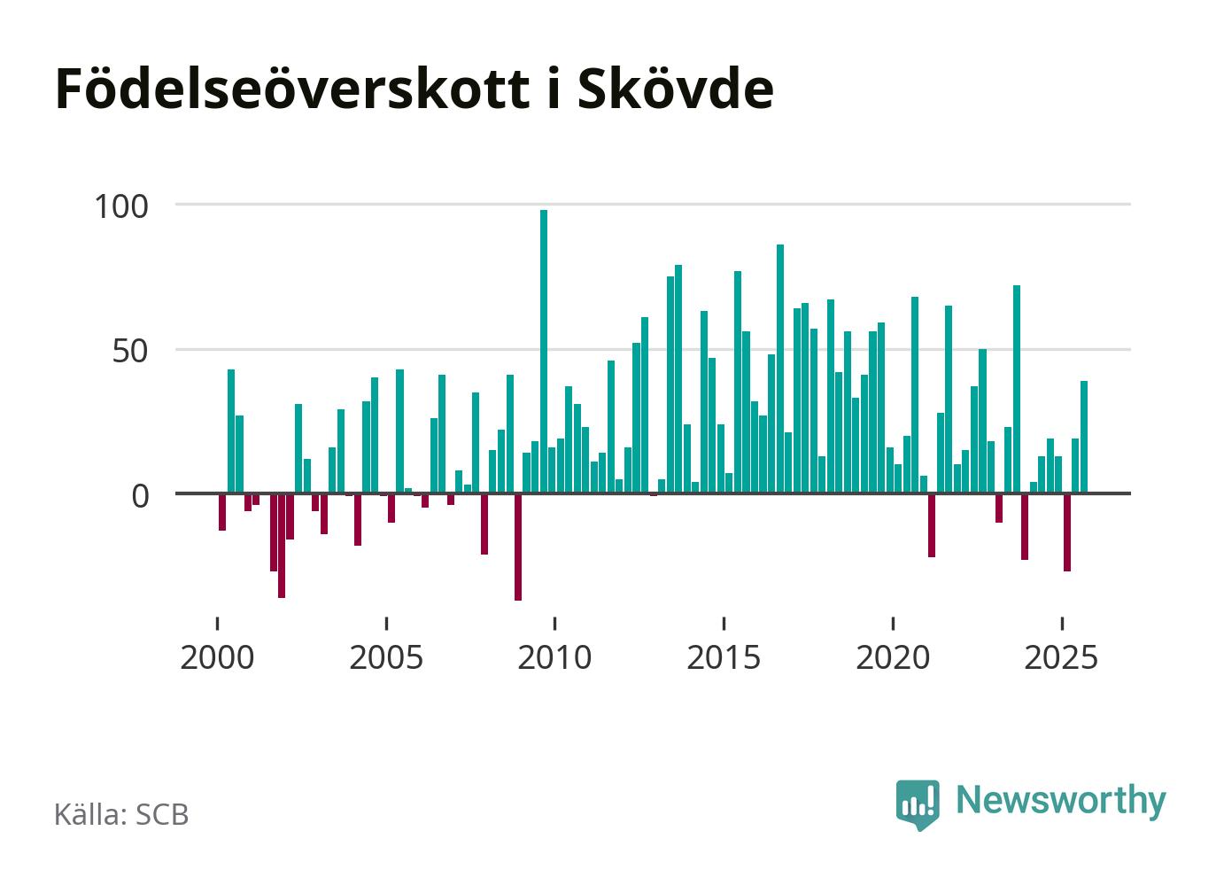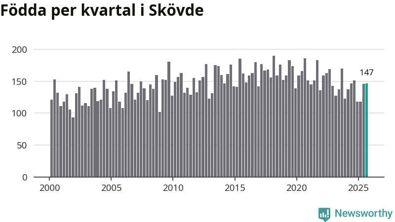 Enligt SCB:s siffror föddes 147 barn i Skövde under det senaste kvartalet. Samtidigt avled 108 personer. Skövde hade alltså ett positivt födelsenetto, vilket kommunen historiskt sett nästan alltid har haft.